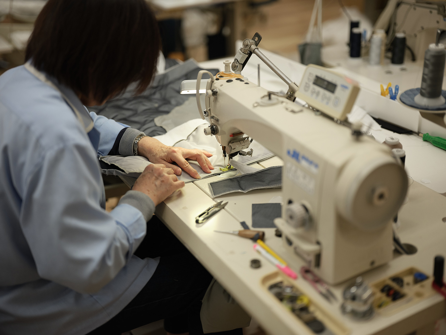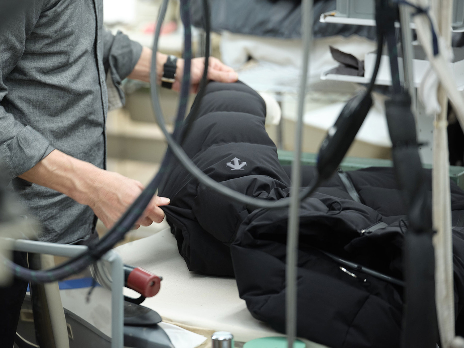 生地の裁断から、ダウンパックの形成、熱圧着加工、そしてダウンの封入まで、各工程を担っているのは、長年経験を積んできた職人たちの手仕事です。温度や圧力、素材のわずかな個体差を見極めながら、一着一着、慎重に仕上げられています。