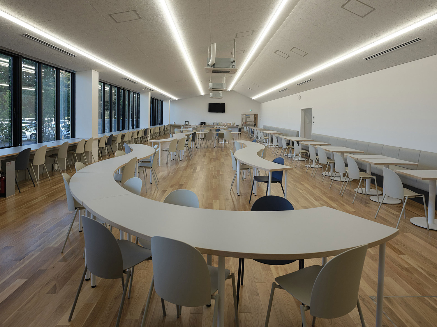 140人が同時に着席できる食堂に加え、ひとりで過ごしたいときや横になりたいときに利用できる休憩ラウンジ、体調不良時に使用できるベッドルームも設けられています。ベッドルームは男性用1室、女性用3室とし、現場の実情に即した配慮がなされています。