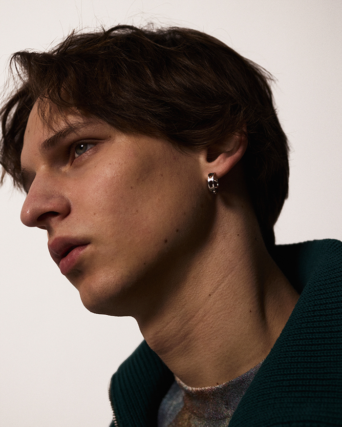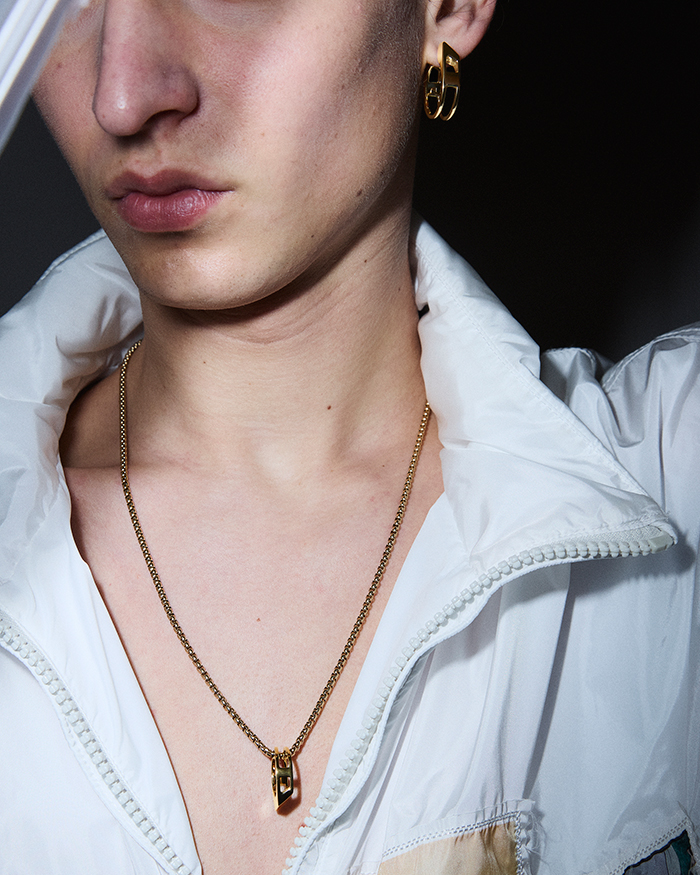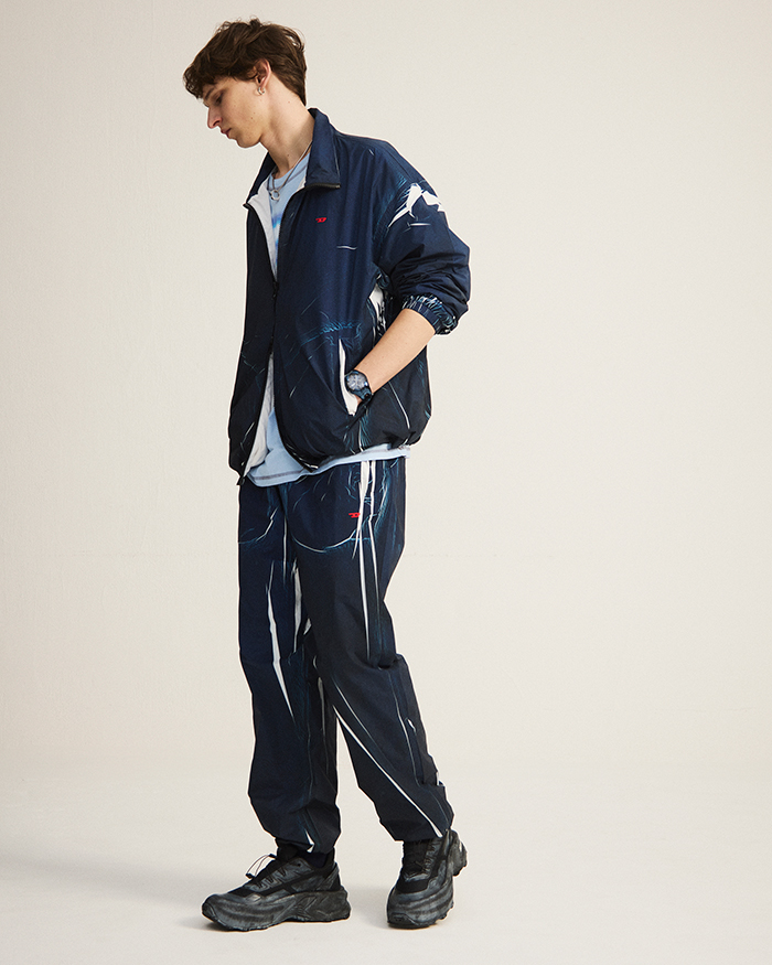 DIESELの時計 63,250円、ネックレス 20,900円、ピアス 13,750円(すべてFOSSIL JAPAN TEL:03-4520-2361)、ジャケット 59,400円、中に着たTシャツ 23,100円、パンツ 50,600円、スニーカー 55,000円(すべてDIESEL JAPAN TEL:0120-55-1978)