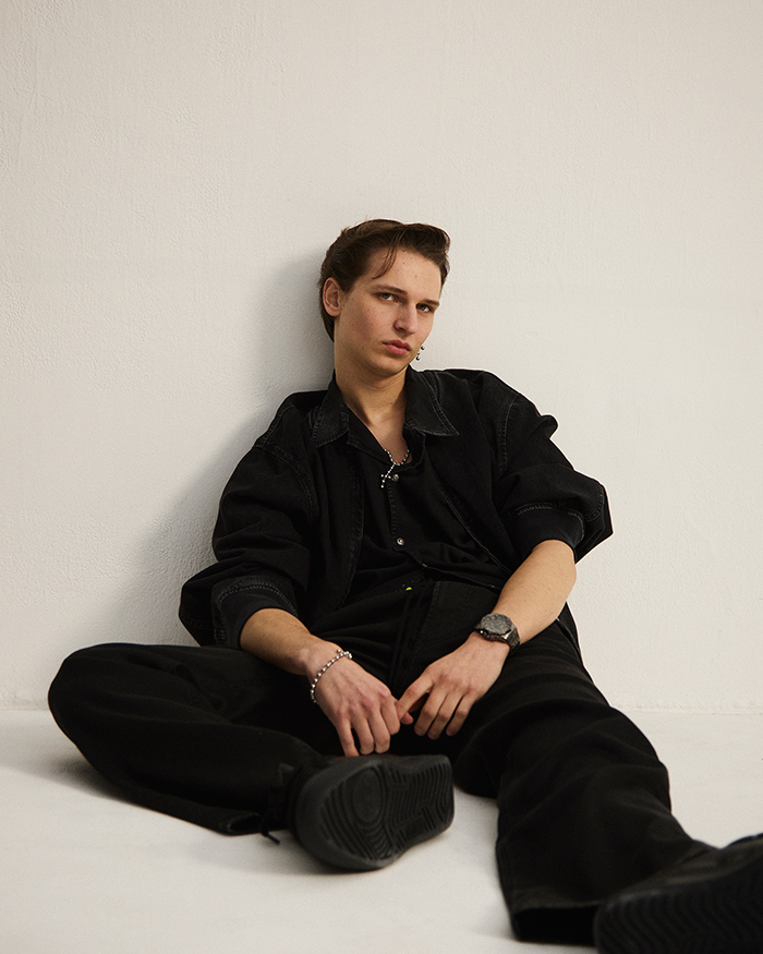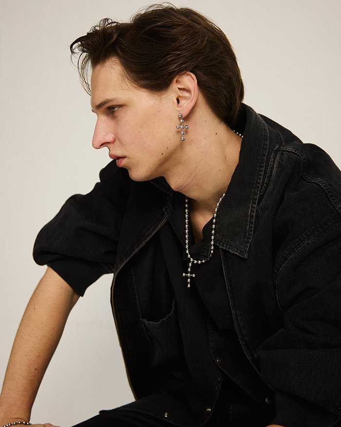 DIESELの時計 45,100円、ネックレス 22,550円、ピアス 14,850円、ブレスレット 20,900円(すべてFOSSIL JAPAN TEL:03-4520-2361)、デニムジャケット 60,500円、デニムシャツ 30,800円、デニムパンツ 56,100円、ボクサーパンツ 16,500円、スニーカー 44,000円(すべてDIESEL JAPAN TEL:0120-55-1978)