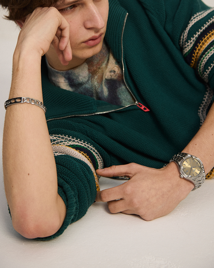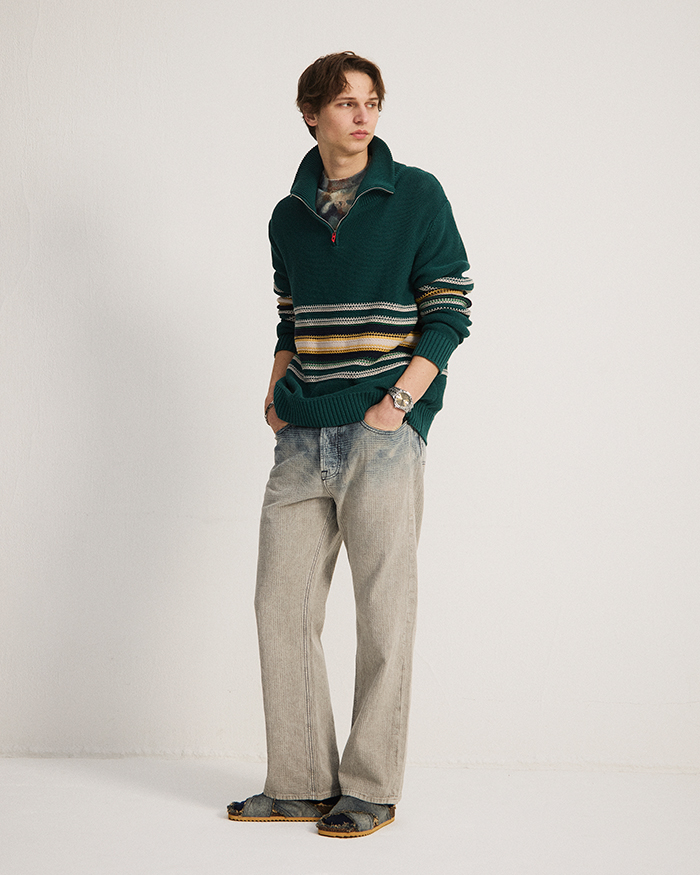 DIESELの時計 49,500円、ピアス 13,750円、ブレスレット 20,900円(すべてFOSSIL JAPAN TEL:03-4520-2361)、ハーフジップニット 80,300円、中に着たニット 59,400円、デニムパンツ 80,300円、サンダル 33,000円(すべてDIESEL JAPAN TEL:0120-55-1978)
