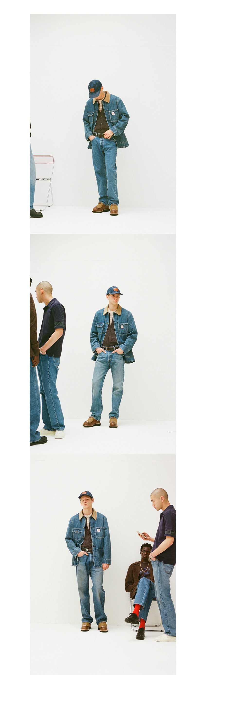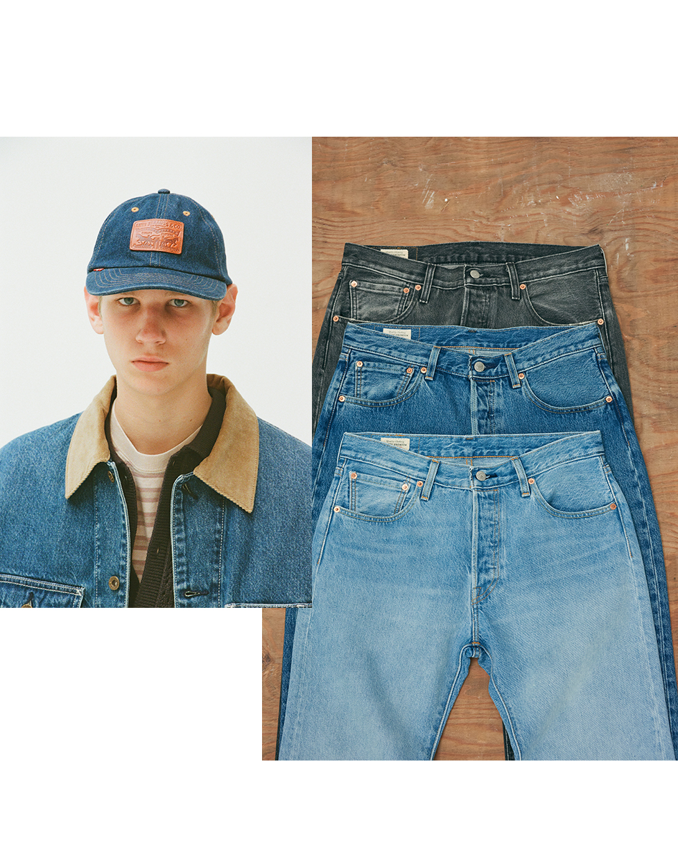 上からLevi’s®の『501® Relaxed』 16,500円、『501®︎ ORIGINAL』 16,500円、『501® Loose』 16,500円、ジャケット 16,500円、中に着たTシャツ 4,400円、キャンプシャツ 11,000円、キャップ 4,950円、ベルト 8,800円(すべてLEVI STRAUSS JAPAN K.K. TEL:0120-099-501)、その他スタイリスト私物