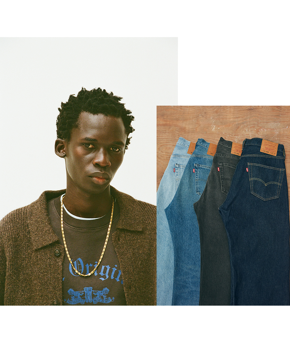 上からLevi’s®の『501® Loose』 16,500円、『501®︎ ORIGINAL』 16,500円、『501® Relaxed』 16,500円、カーディガン 14,300円、中に着たTシャツ 4,400円、Tシャツ 4,950円(すべてLEVI STRAUSS JAPAN K.K. TEL:0120-099-501)、その他スタイリスト私物
