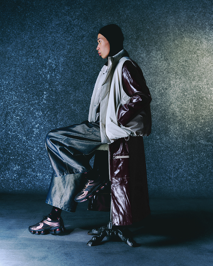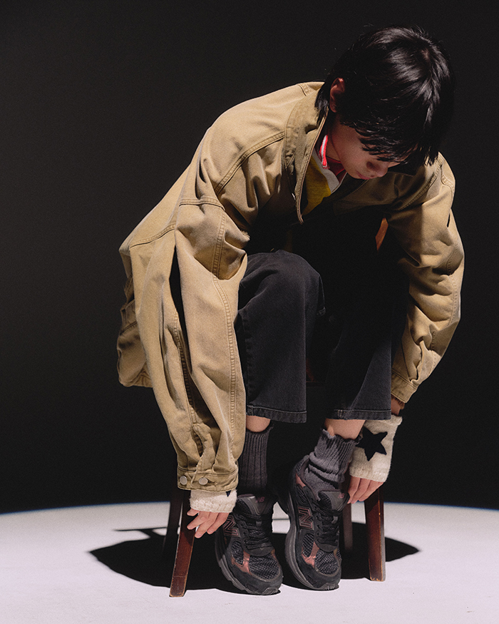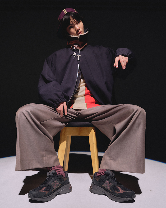 New Balanceの『ABZORB 2010』 22,000円(New Balance Japan TEL:0120-85-7120)、sssteinのブルゾン 145,200円、スラックス 61,600円(ともにcarol TEL:03-5778-9596)、中に着たモッズコート 参考価格(C.E.L.STORE TEL:03-6459-3932)、古着のニット 18,000円、キャップ 6,000円(ともにanthem chill TEL:03-6303-3206)、その他スタイリスト私物
