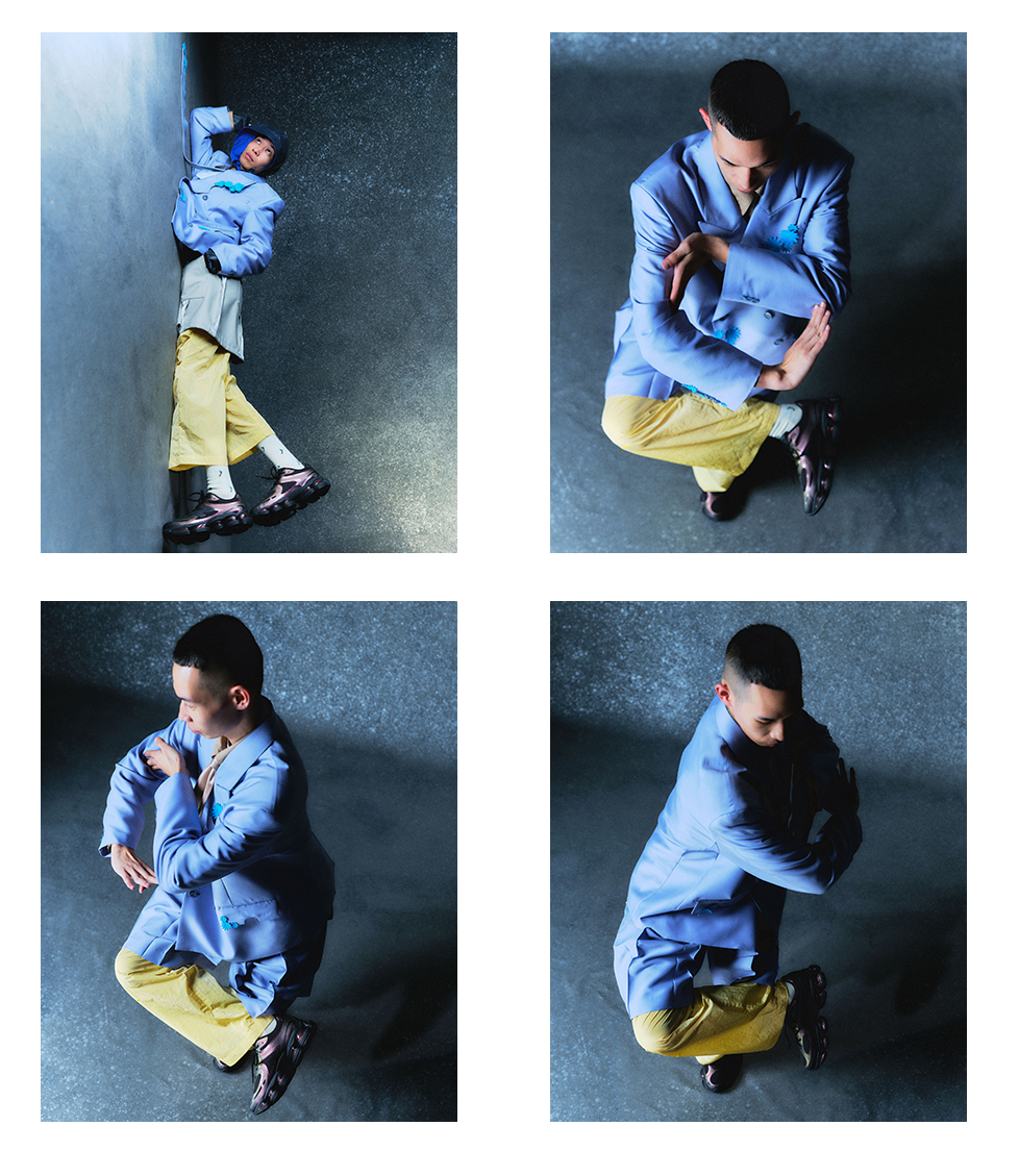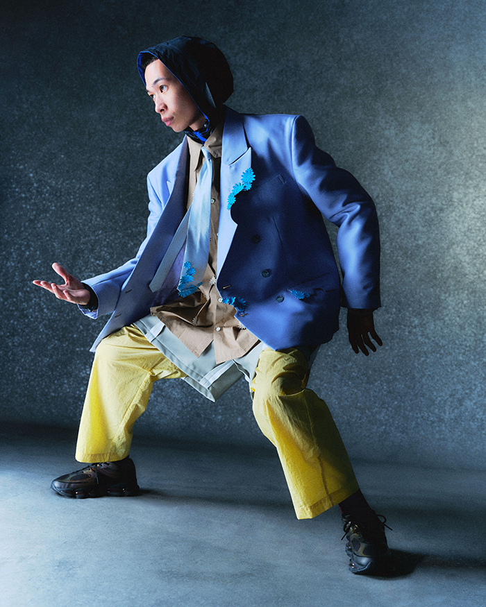 New Balanceの『ABZORB 2000』 24,200円、パンツ 16,940円(ともにNew Balance Japan TEL:0120-85-7120)、中に着た古着のナイロンパーカ 14,000円(anthem chill TEL:03-6303-3206)、RYO HOSHIDAのジャケット 104,500円、シャツ 50,600円、レザーショーツ 29,000円、ネクタイ 11,000円(すべてRYO HOSHIDA)、その他スタイリスト私物