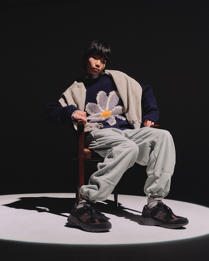 New Balanceの『ABZORB 2010』 22,000円、フリースワイドパンツ 13,970円(ともにNew Balance Japan TEL:0120-85-7120)、THITIFTY LOOKのニット 参考価格、TOWNCRAFTのシャツ 参考価格(ともにC.E.L.STORE TEL:03-6459-3932)、肩に巻いたsssteinのスウェット 41,800円(carol TEL:03-5778-9596)、その他スタイリスト私物