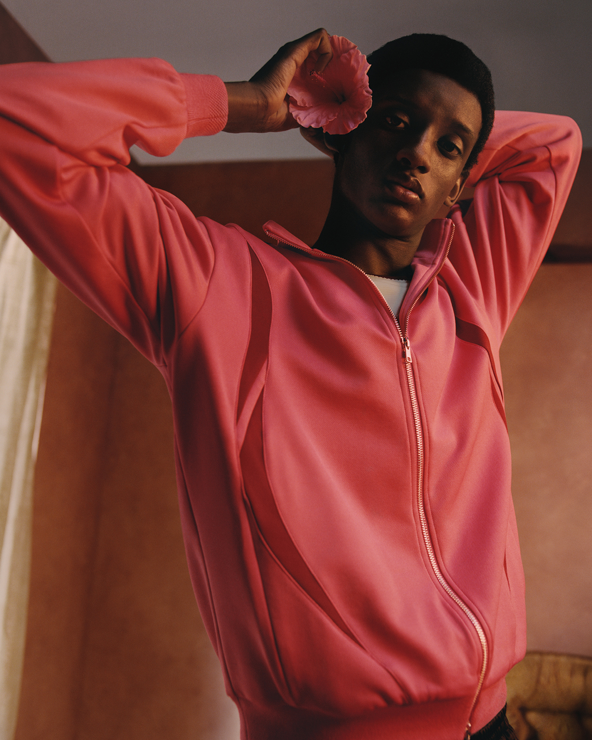 このほか、インターロックツイル素材を使用したピンクのトラックジャケット、軽量なクリンクルリップストップ素材のトラックジャケット、ブラウンのトラックパンツ、スネークプリントのパネルを配したサッカーユニフォームといったアパレルもラインナップ。