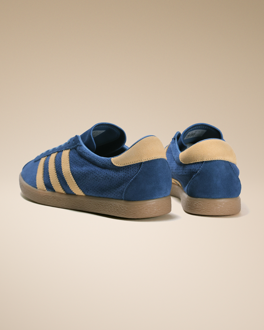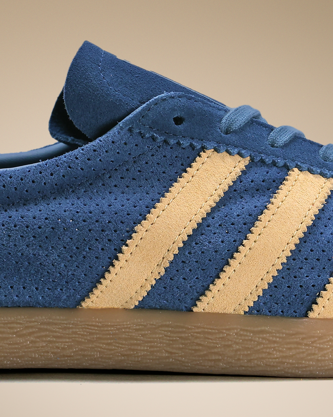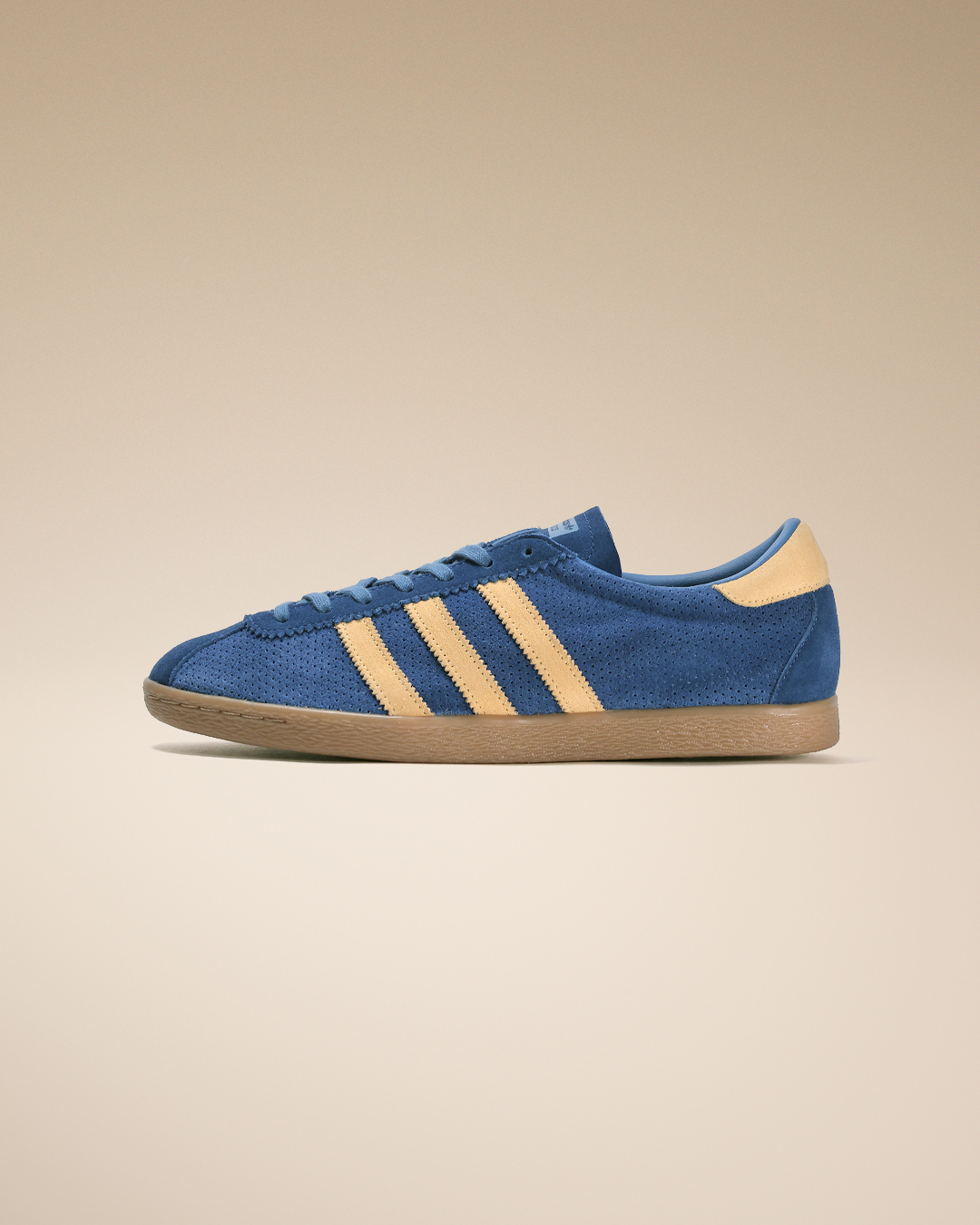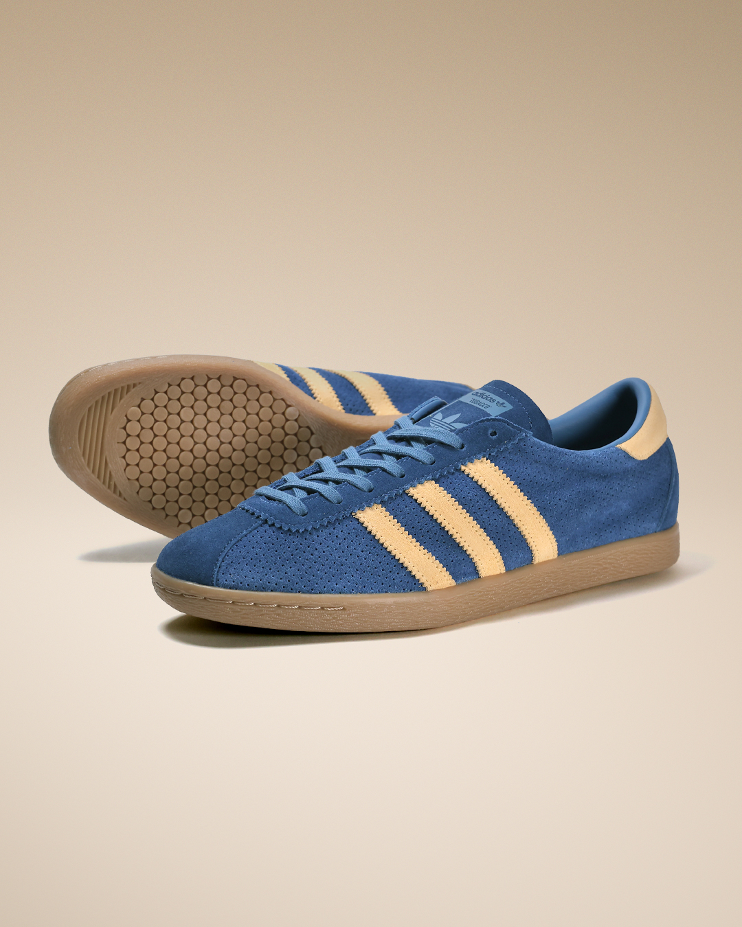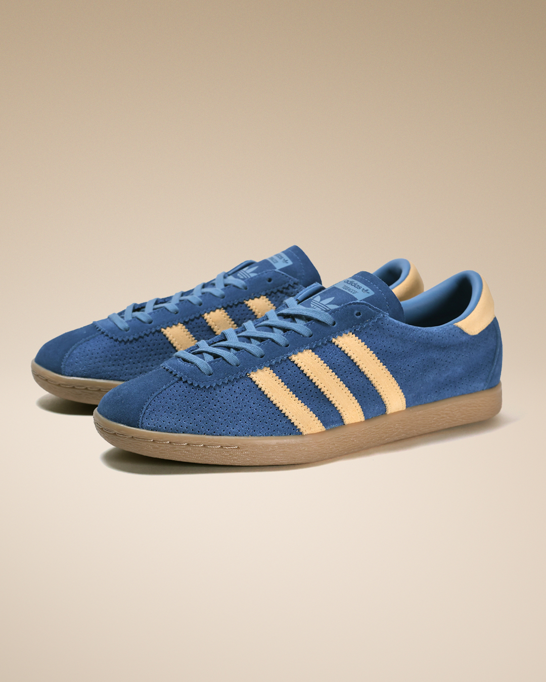 本作では、鮮やかなブルーのパンチングスウェードアッパーに、シャーベットのように爽やかなアイスタンジェリンのスリーストライプスを配置。