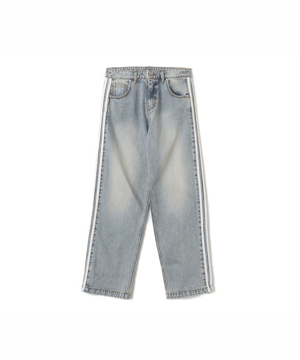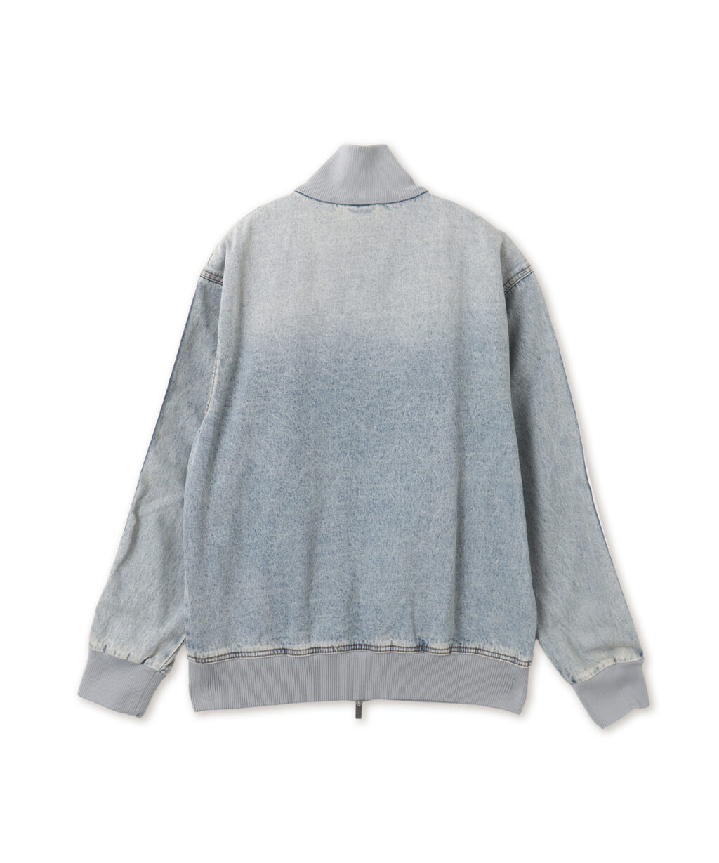 ウォッシュ加工を施したデニム生地は、さりげない格子状の質感を浮かび上がらせ、ヴィンテージライクでラフなムードを演出。クラシックなスポーツウェアのフォルムに、ストリートらしい無骨さと存在感を加えている。