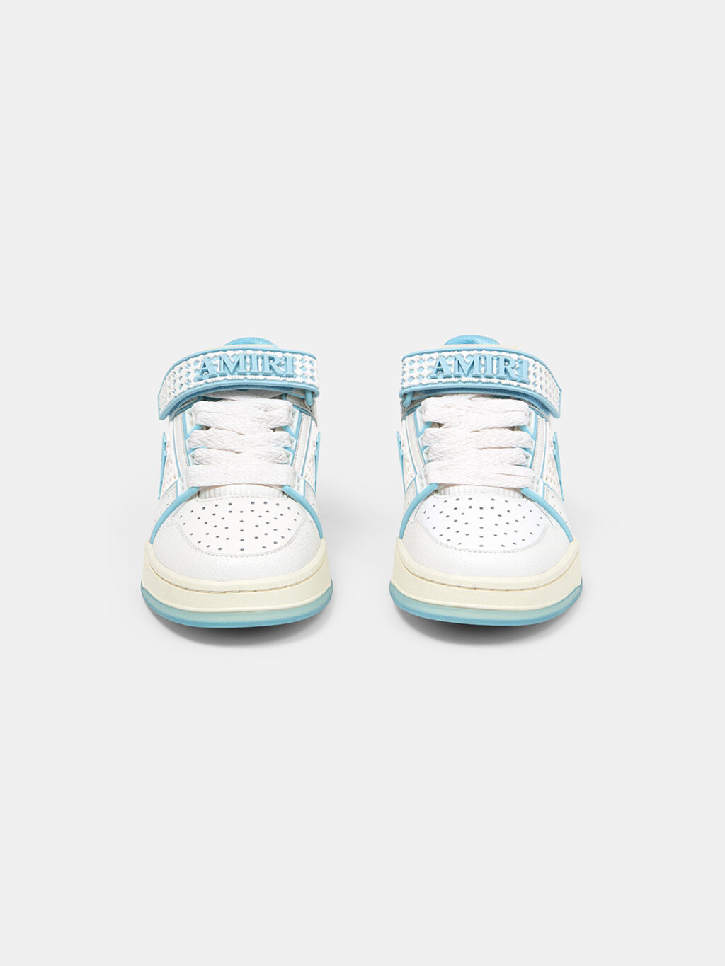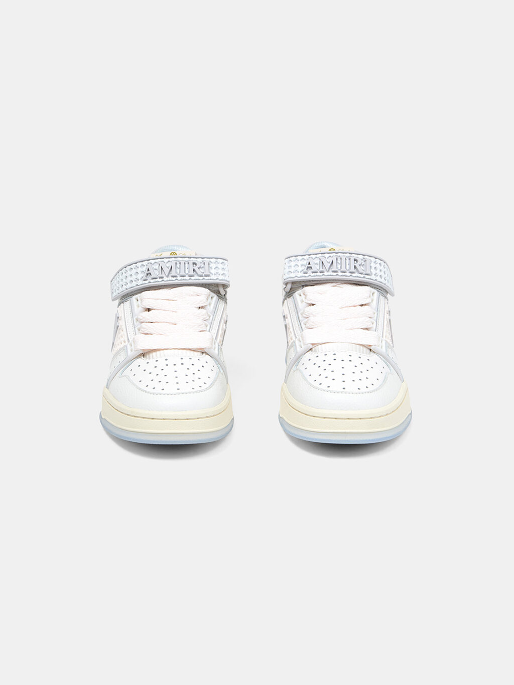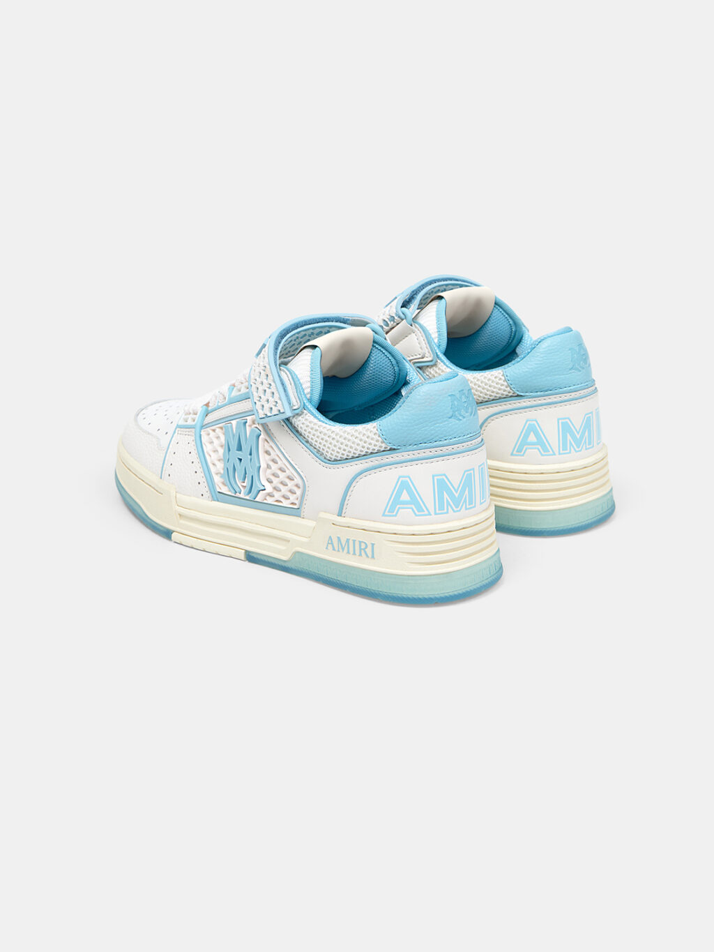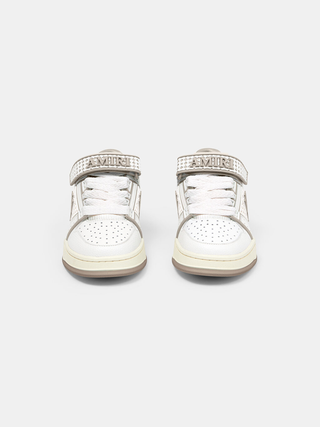 スケートパークが持つ反骨精神とコート内の規律という2つの世界のエネルギーを融合させた1足は、上質なレザーとスポーティなメッシュパネルをダイナミックなコントラストで組み合わせたデザインが大きな特徴となっている。