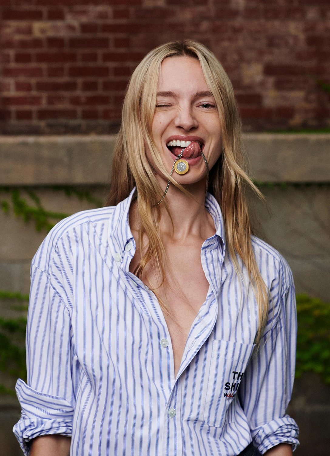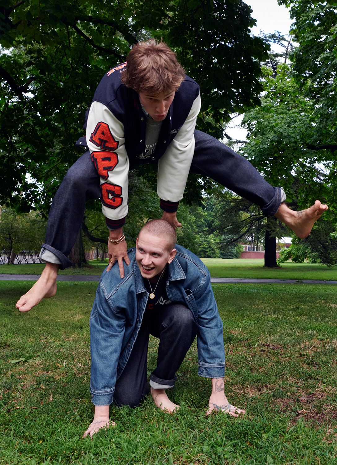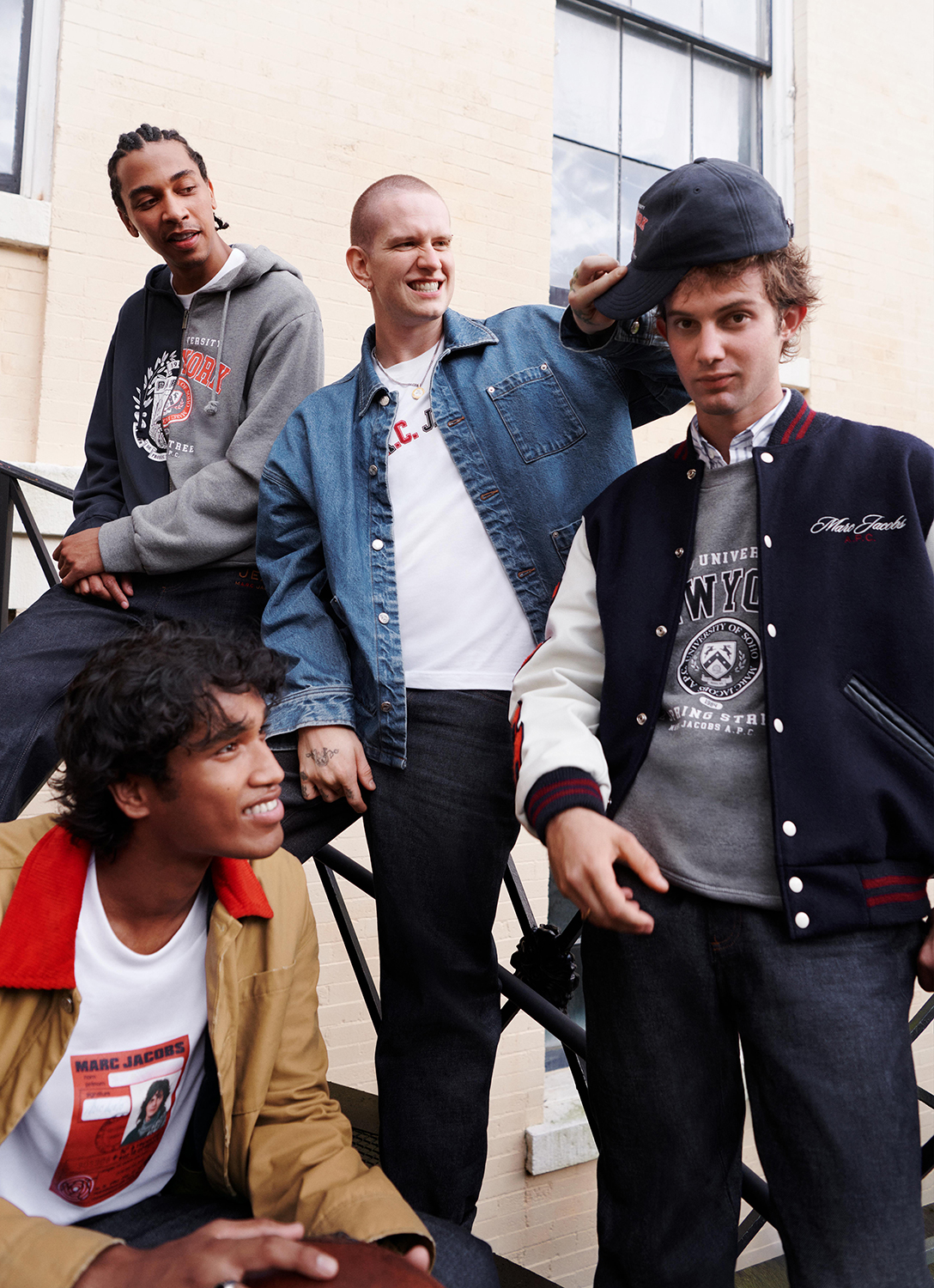 両ブランドが共有する1980年代のルーツと、それぞれの独自のカルチャー的視点を讃えるカプセルコレクションでは、重ね着に適したファブリック、細部へのこだわり、そしてパリとニューヨークのアーカイブ的要素を取り入れ、カレッジスタイルを再解釈。ウールとカウハイドで作られたバーシティージャケット、ダブルネームのカットソー、ジーンズ、ストライプシャツ、トートバッグなど、全26型が登場している。