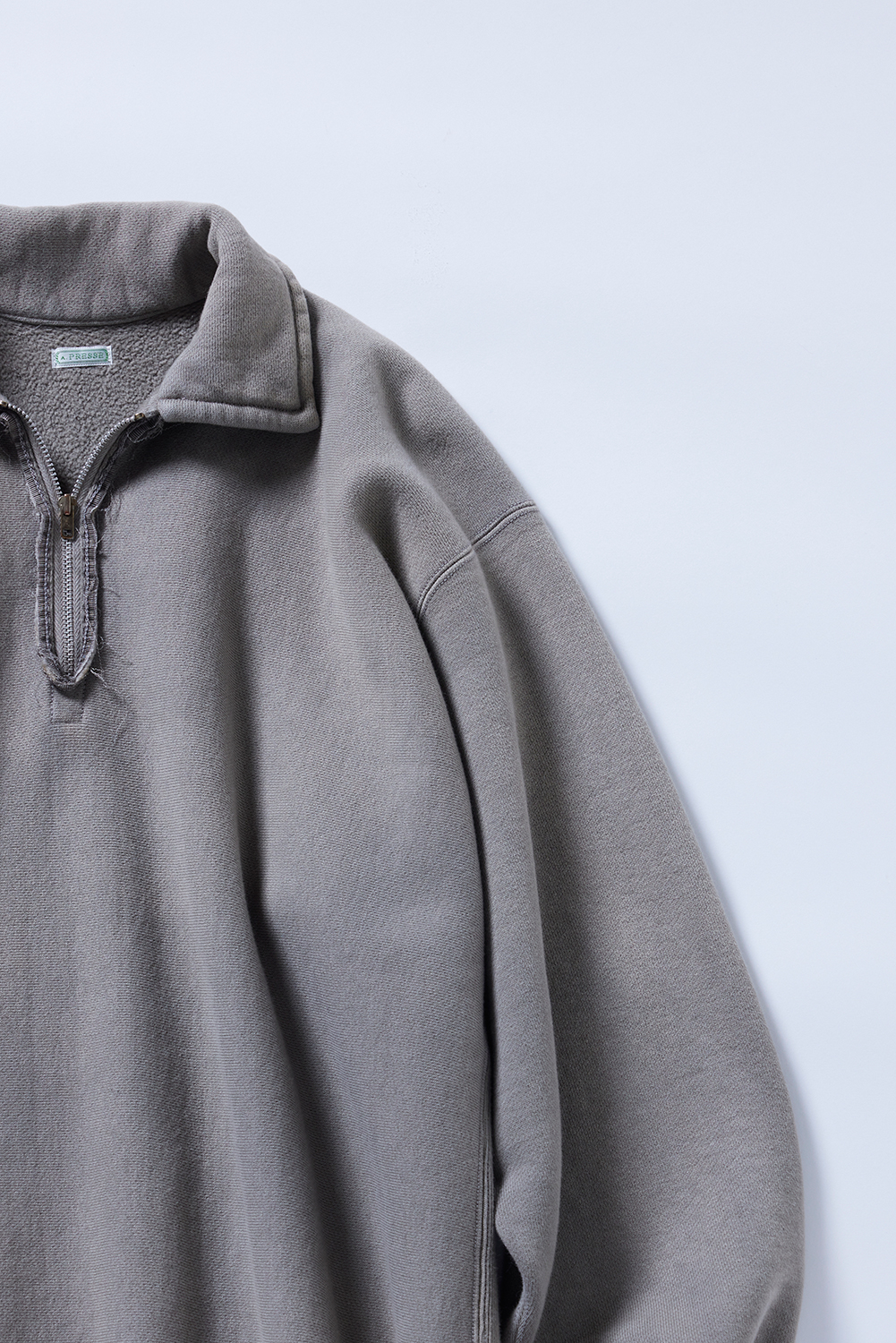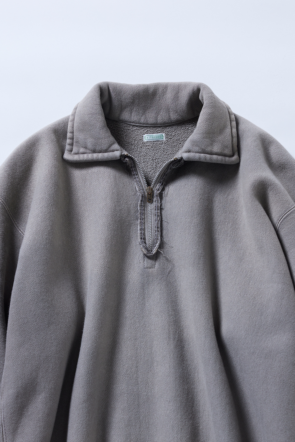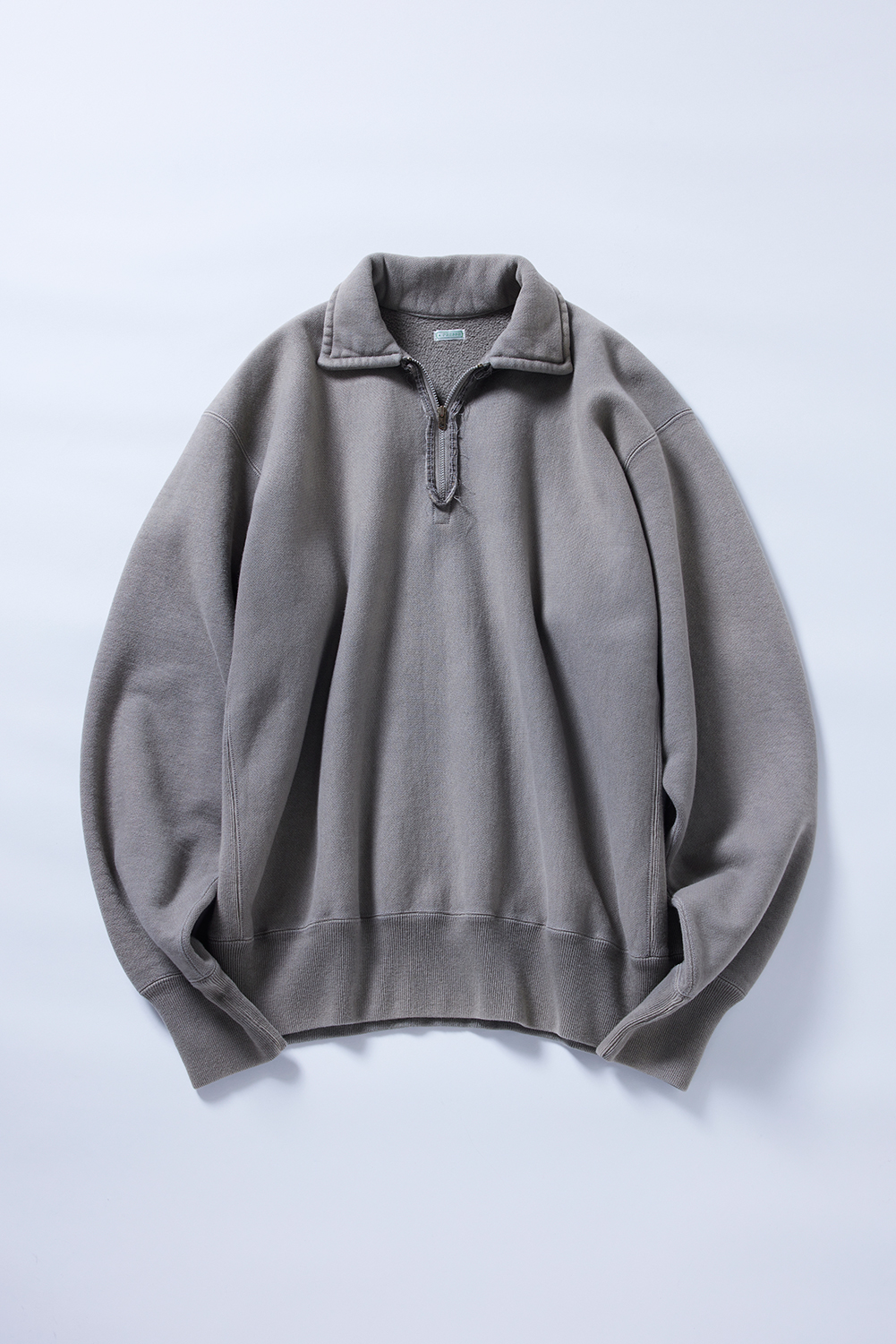 ヴィンテージを踏襲し、縫製仕様も忠実に再現したハーフジップスウェットシャツは、短丈で、袖は太くせず適度な太さに設定。インナーにも使いやすいちょうど良いゆとり感で、肩ハギがないヴィンテージのディティールを忠実に再現し丸みのあるシルエットに仕上げた。