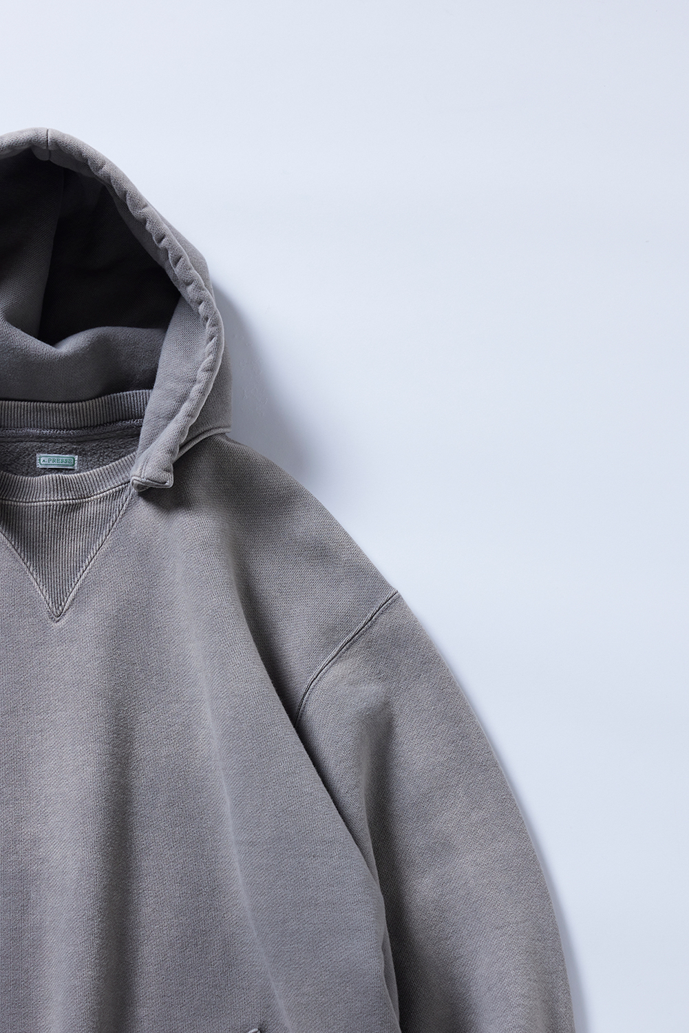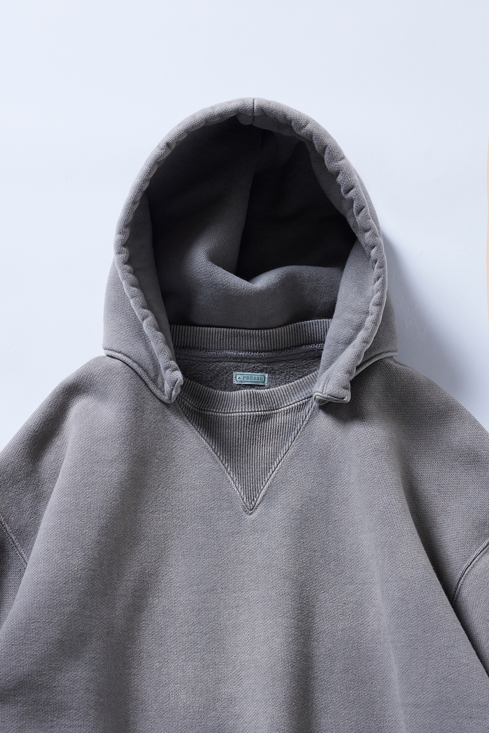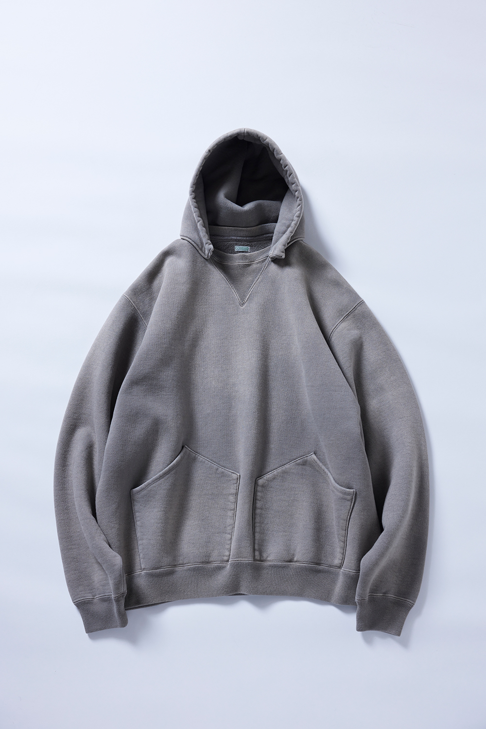 クロップド後付けフーディーは、ヴィンテージの薄く伸びきって緩くなったリブや、ポケットやVガゼットの歪み、被れない小さなフードをあえて再現。