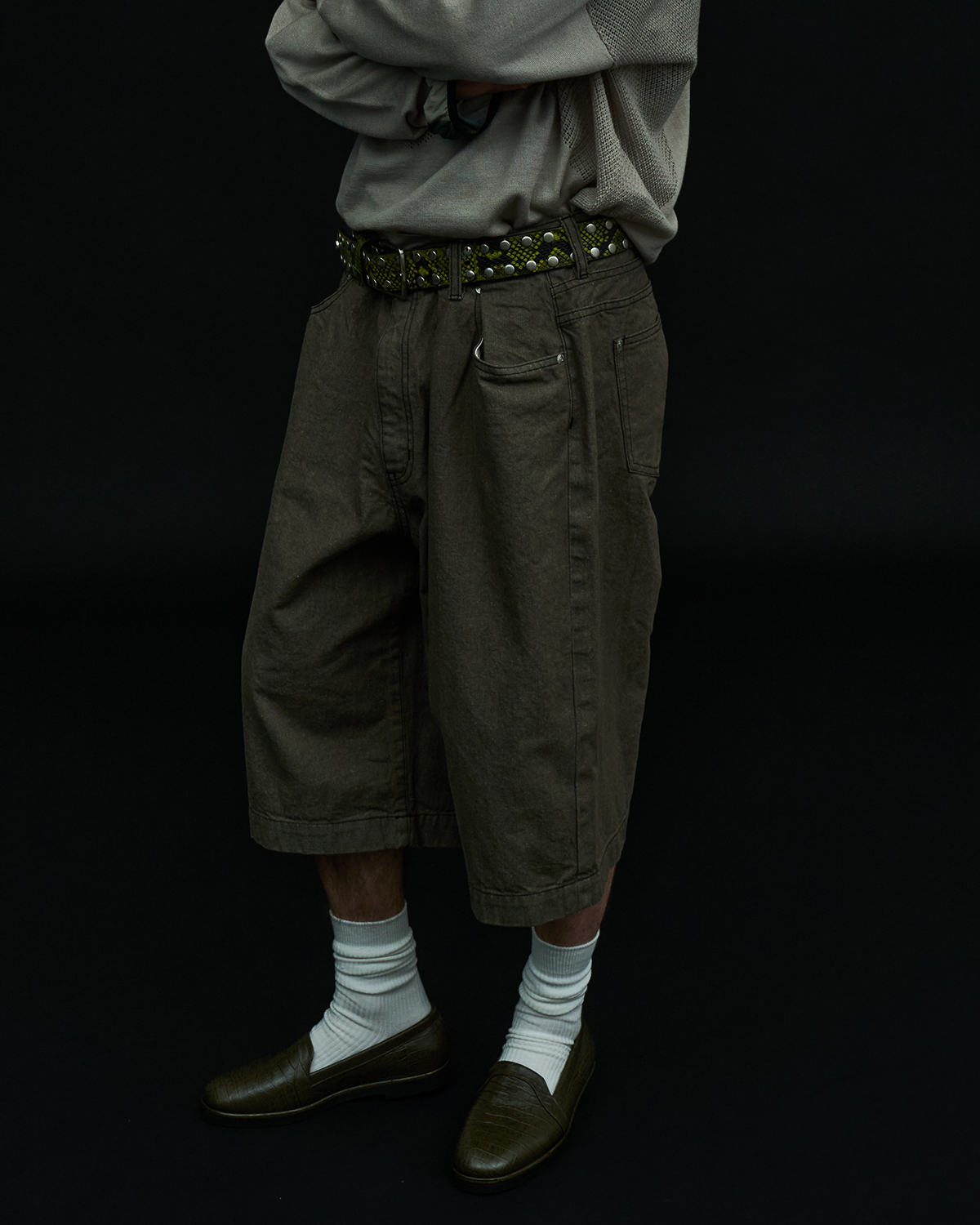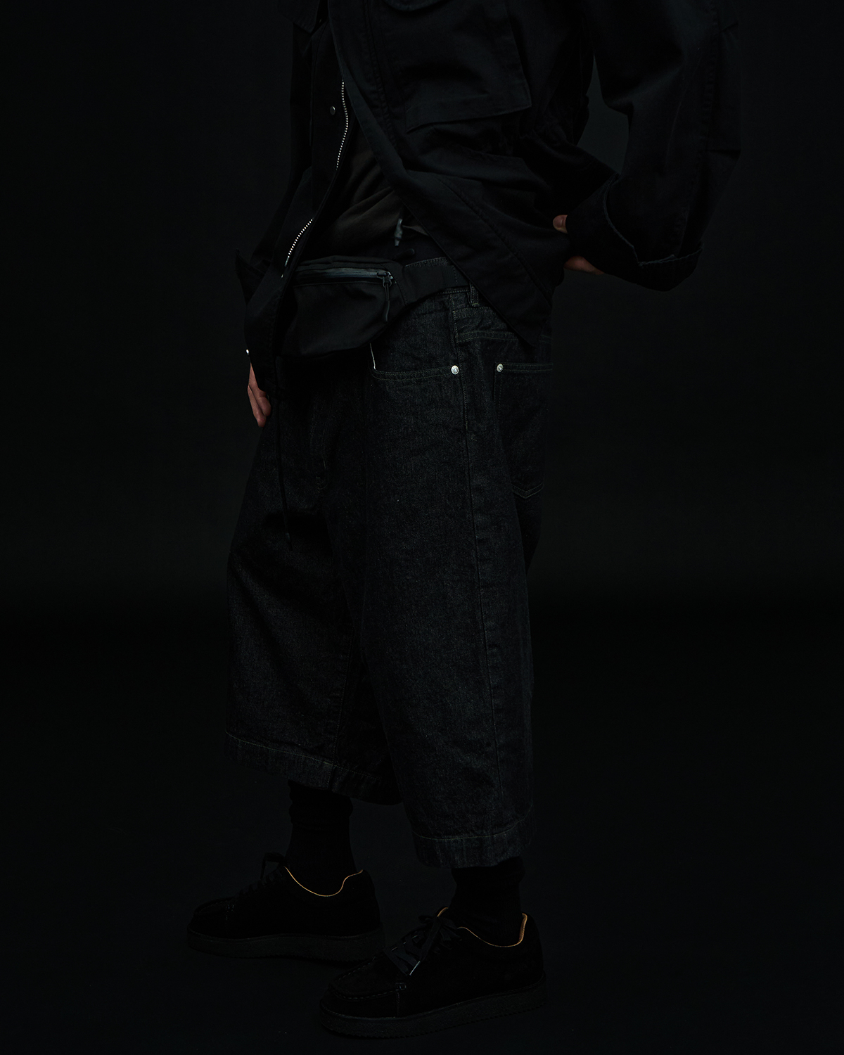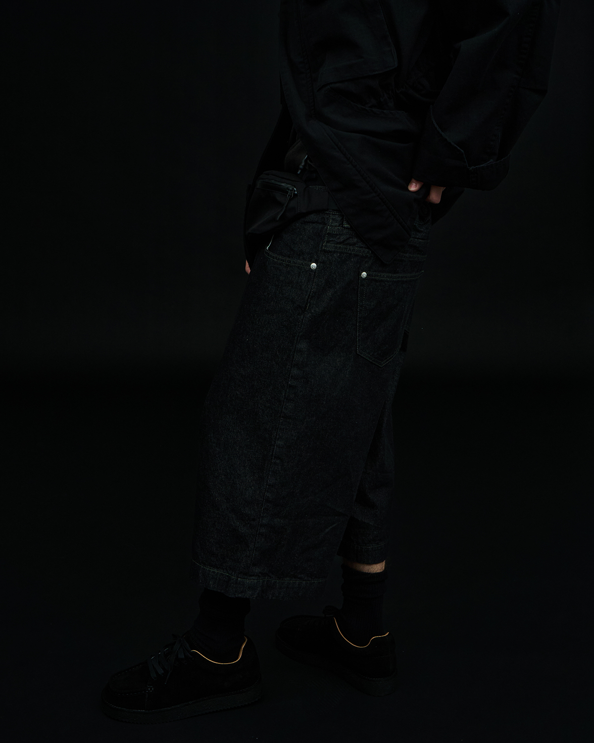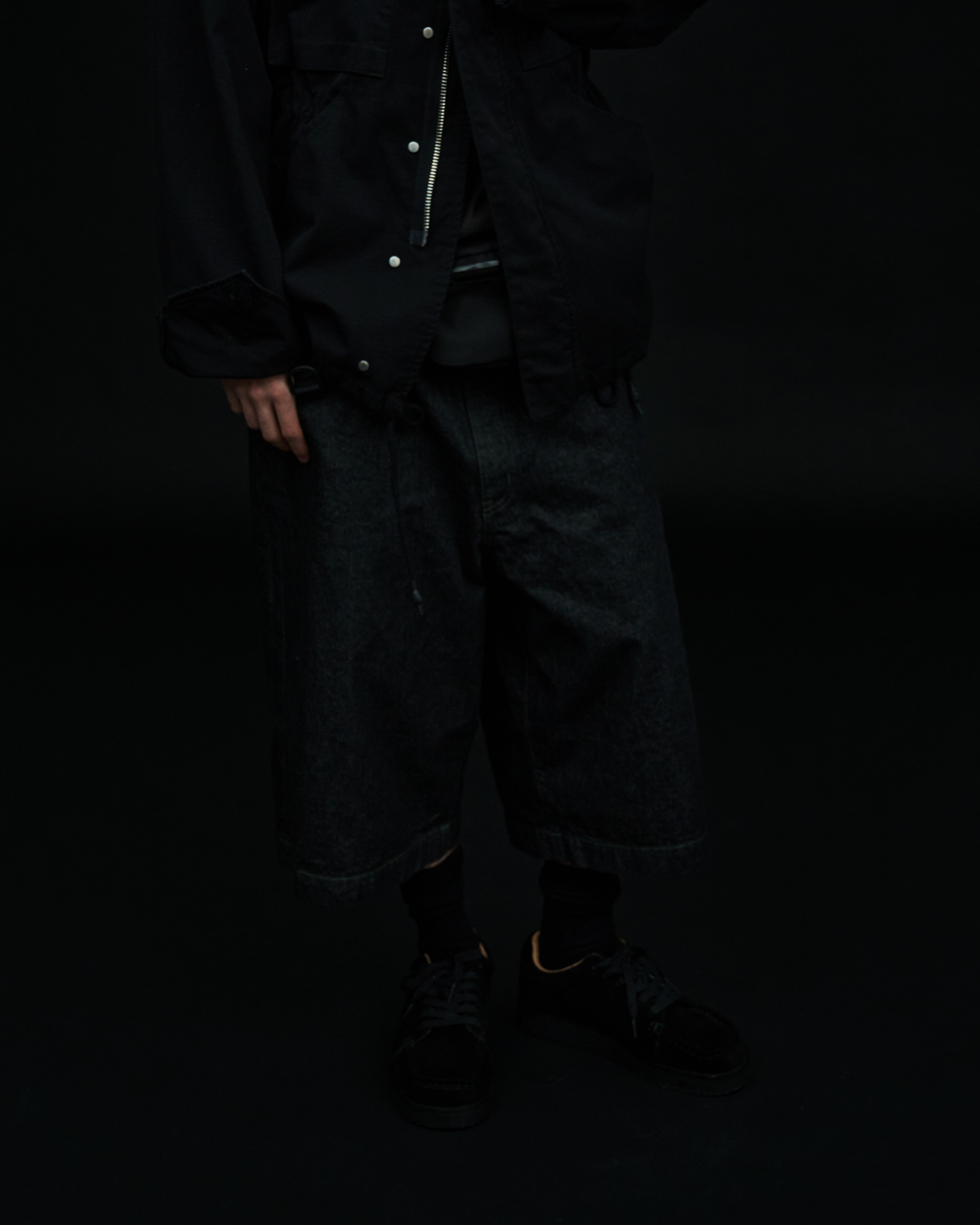 アイコニックなダブルヨークデザインを採用した5ポケットショーツをベースとした本作だが、今季はブラックとオリーブの2色を展開。
