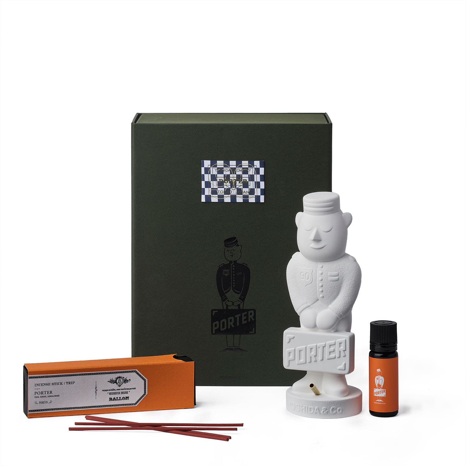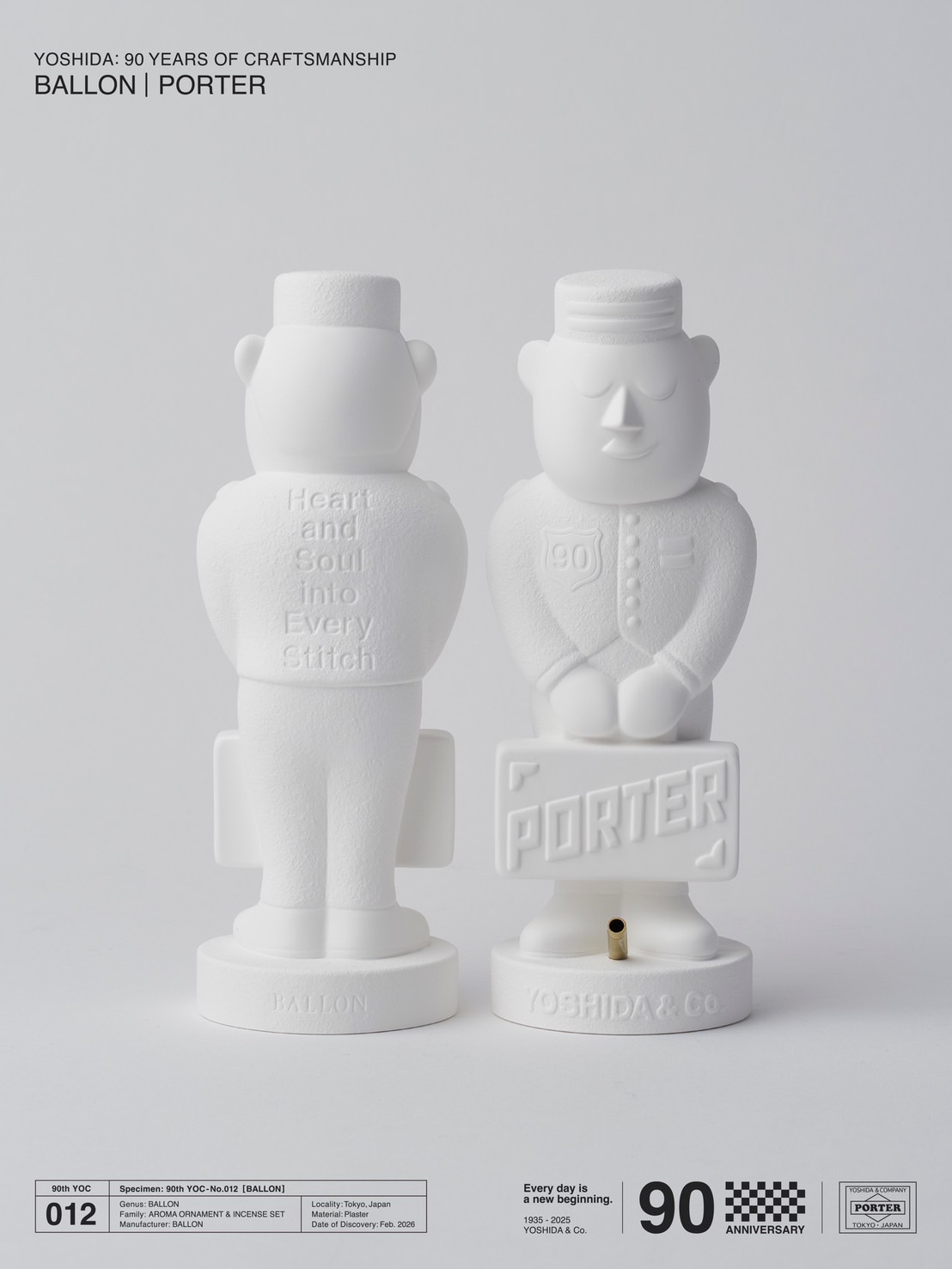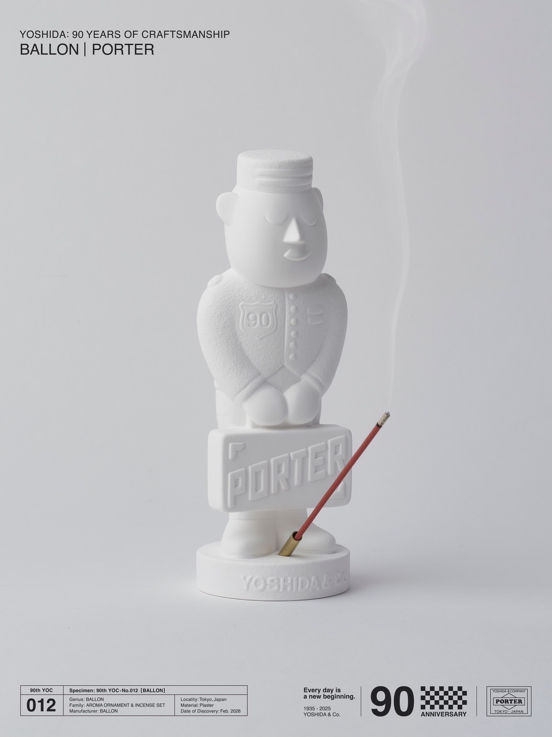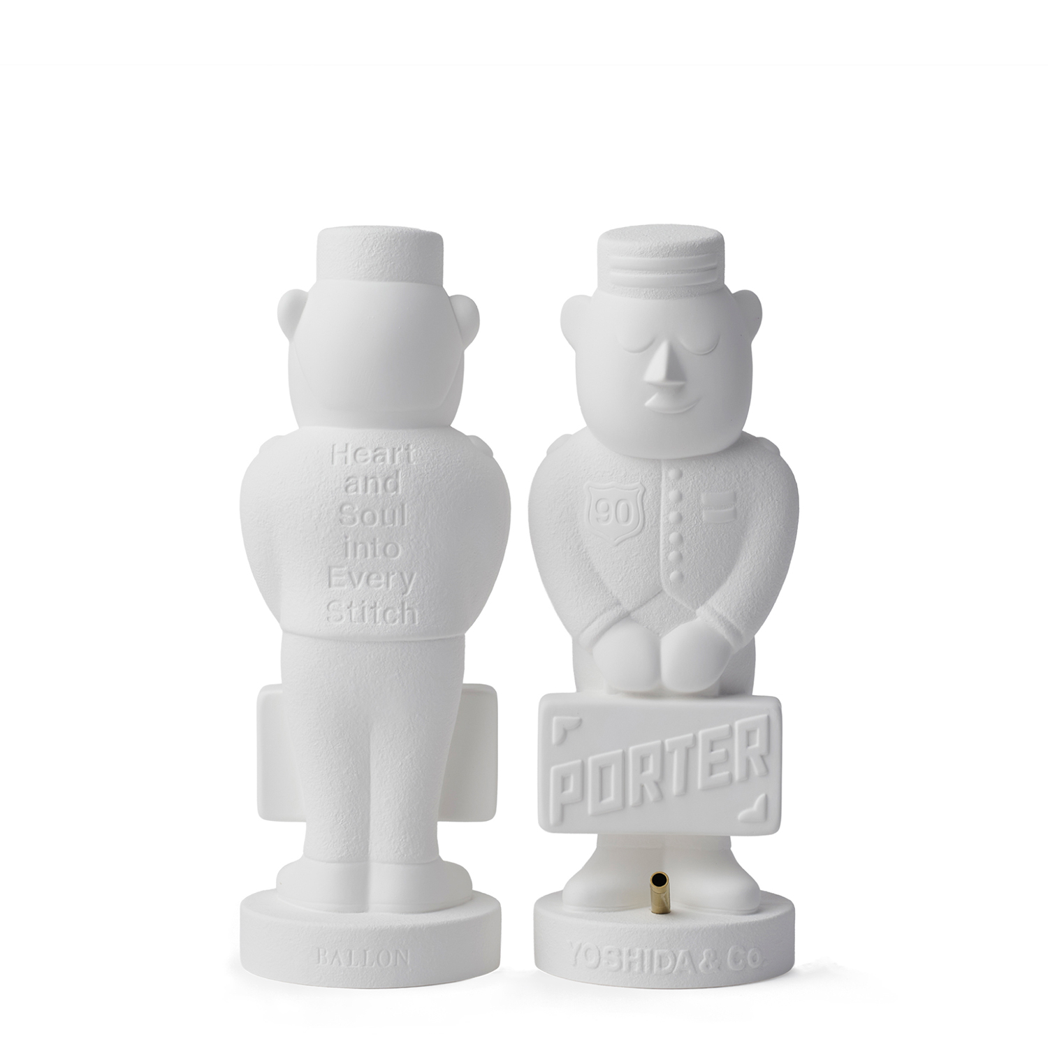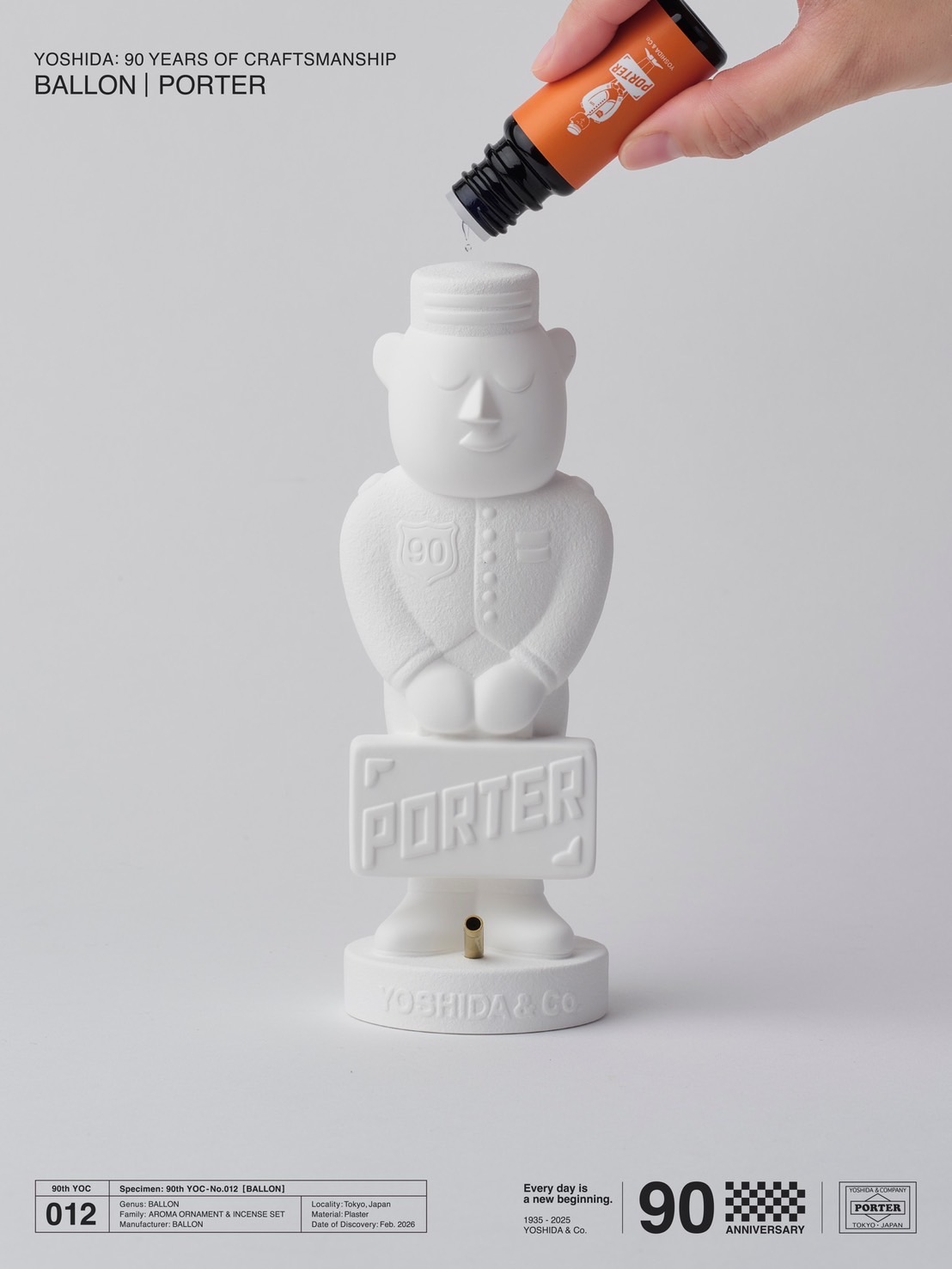 吉田カバンの創立90周年を記念して実現した今回のコラボレーションでは、”ポーターくん”を石膏で表現したアロマオーナメントを製作。