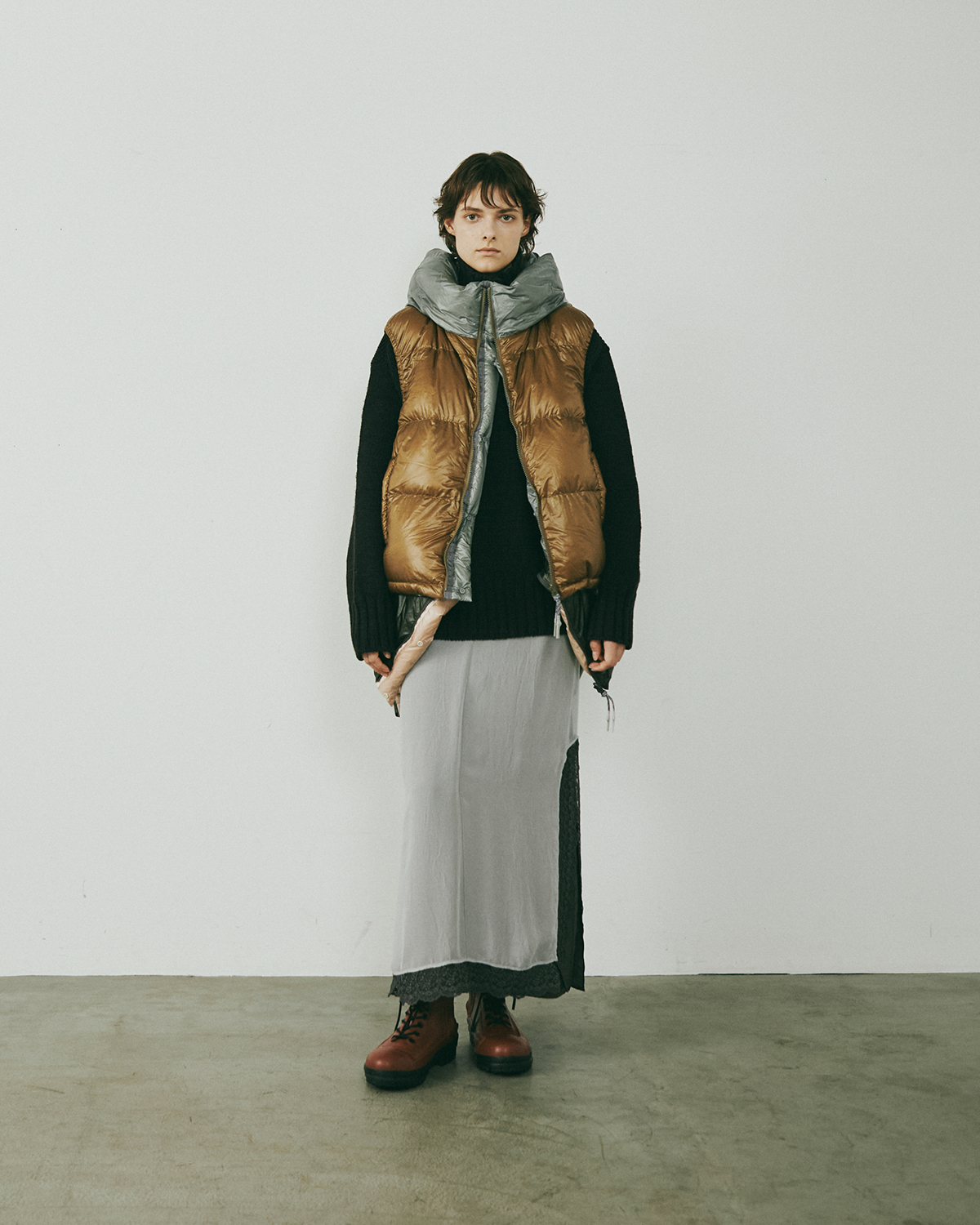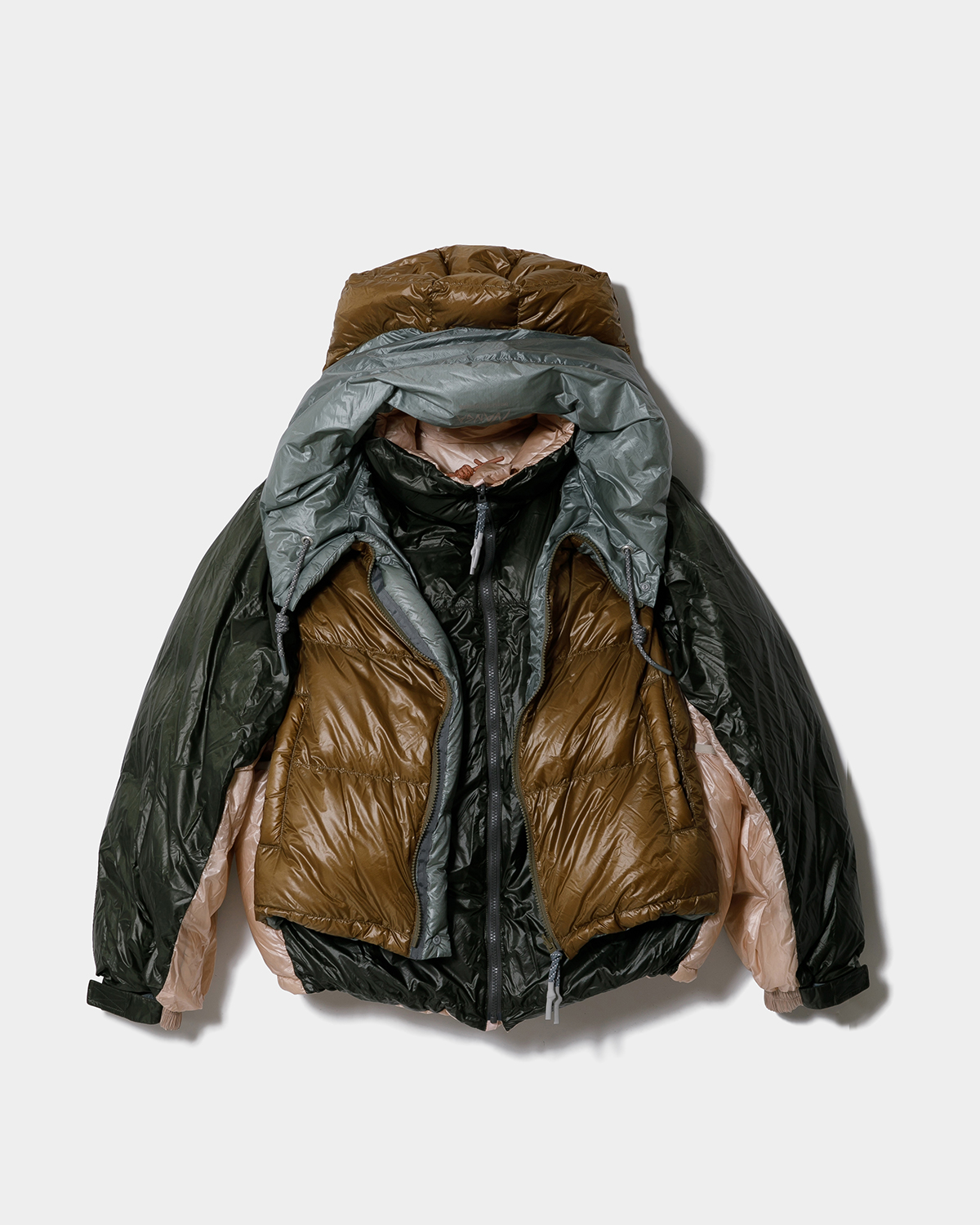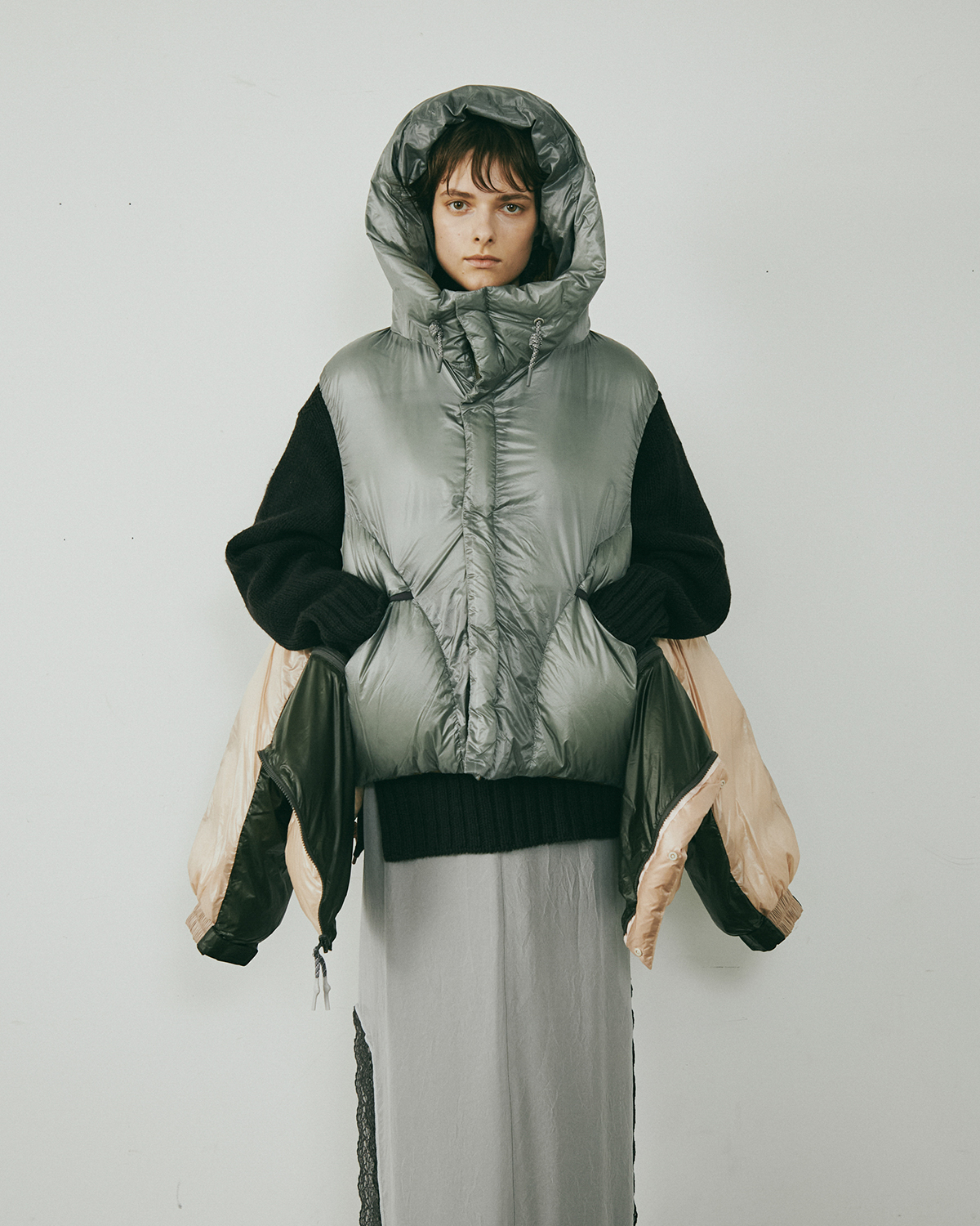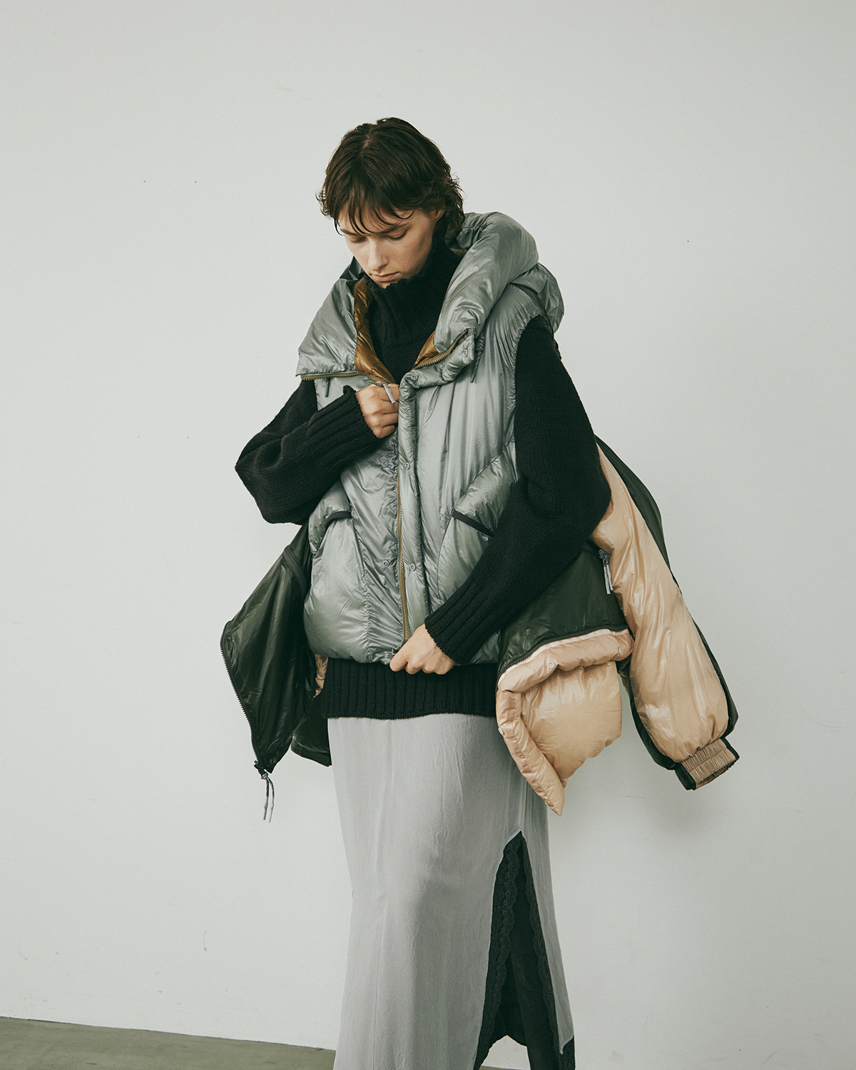ブルゾンとベスト、2つのアイテムを構造的に繋げるbeautiful people独自のマルチレイヤリングにより、朝から夜、屋外から屋内と、刻一刻と変わる気温に合わせ、自在に体感温度を調整出来る新感覚のダウンウェアを作り上げた。