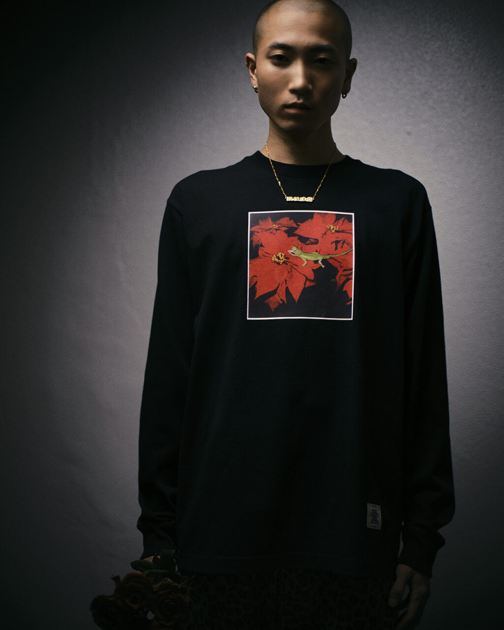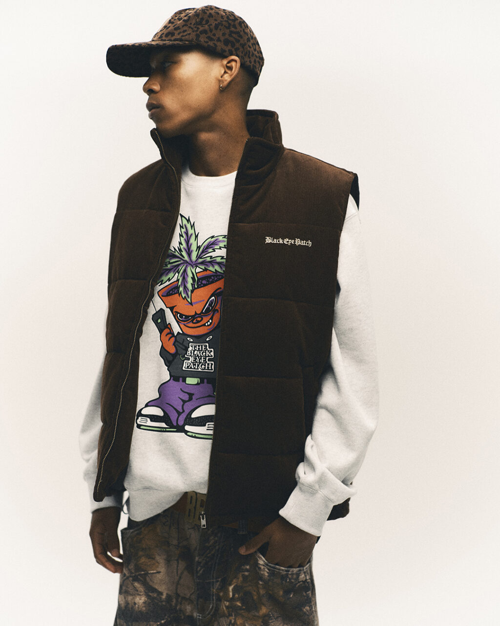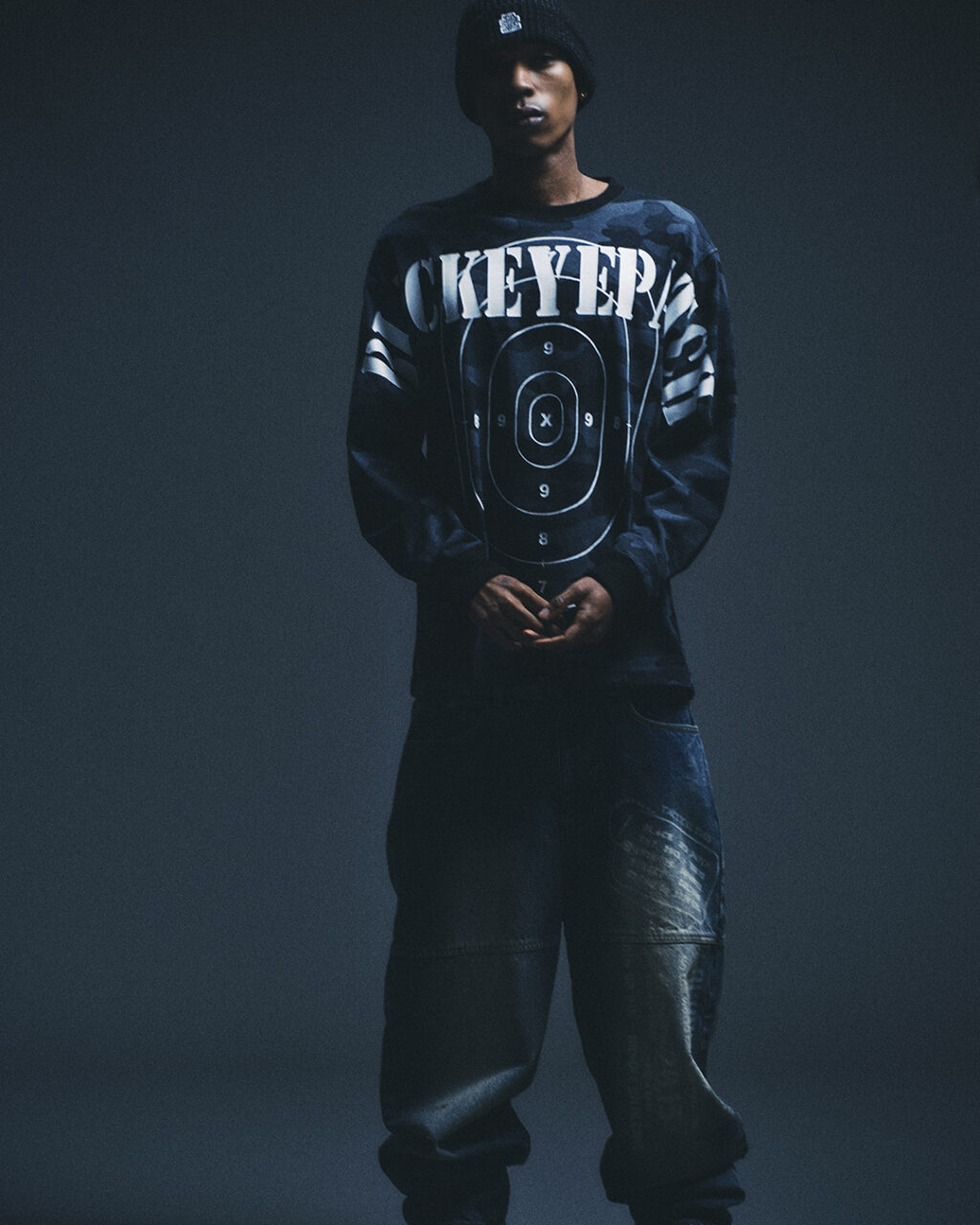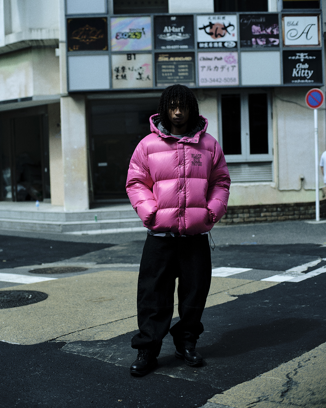 ブランドオリジナルのキャラクター・OG BOYをバックに掲げたジャケットやダウンジャケット、MA-1、リアルツリーカモやレオパード柄の総柄トップス、艶感のあるジャージーのセットアップなどもラインナップされている。
