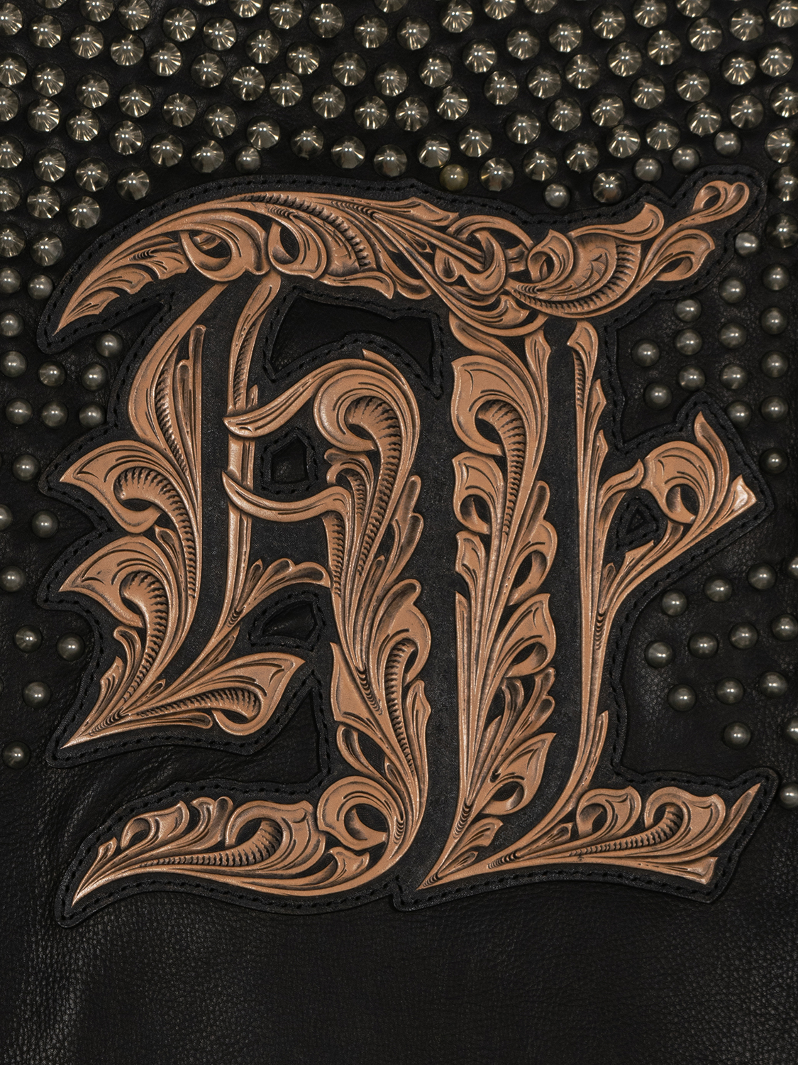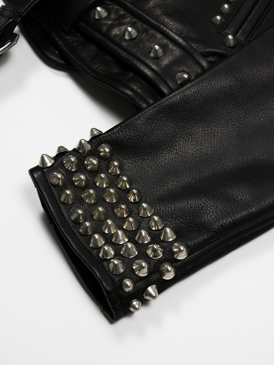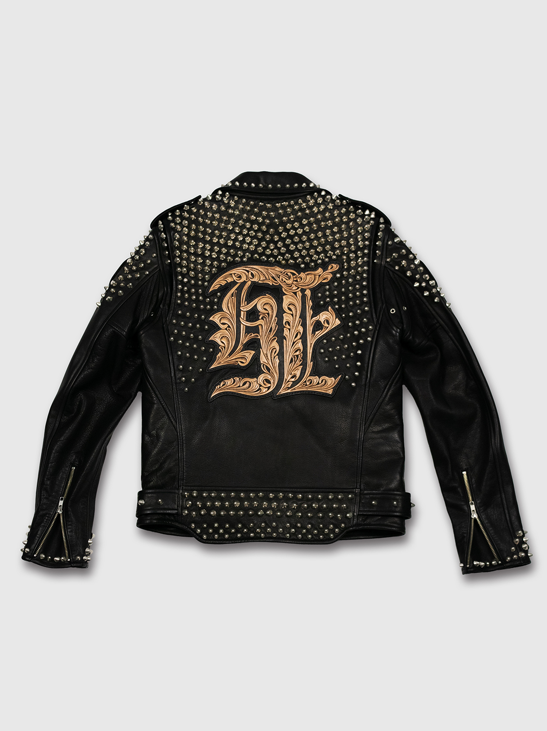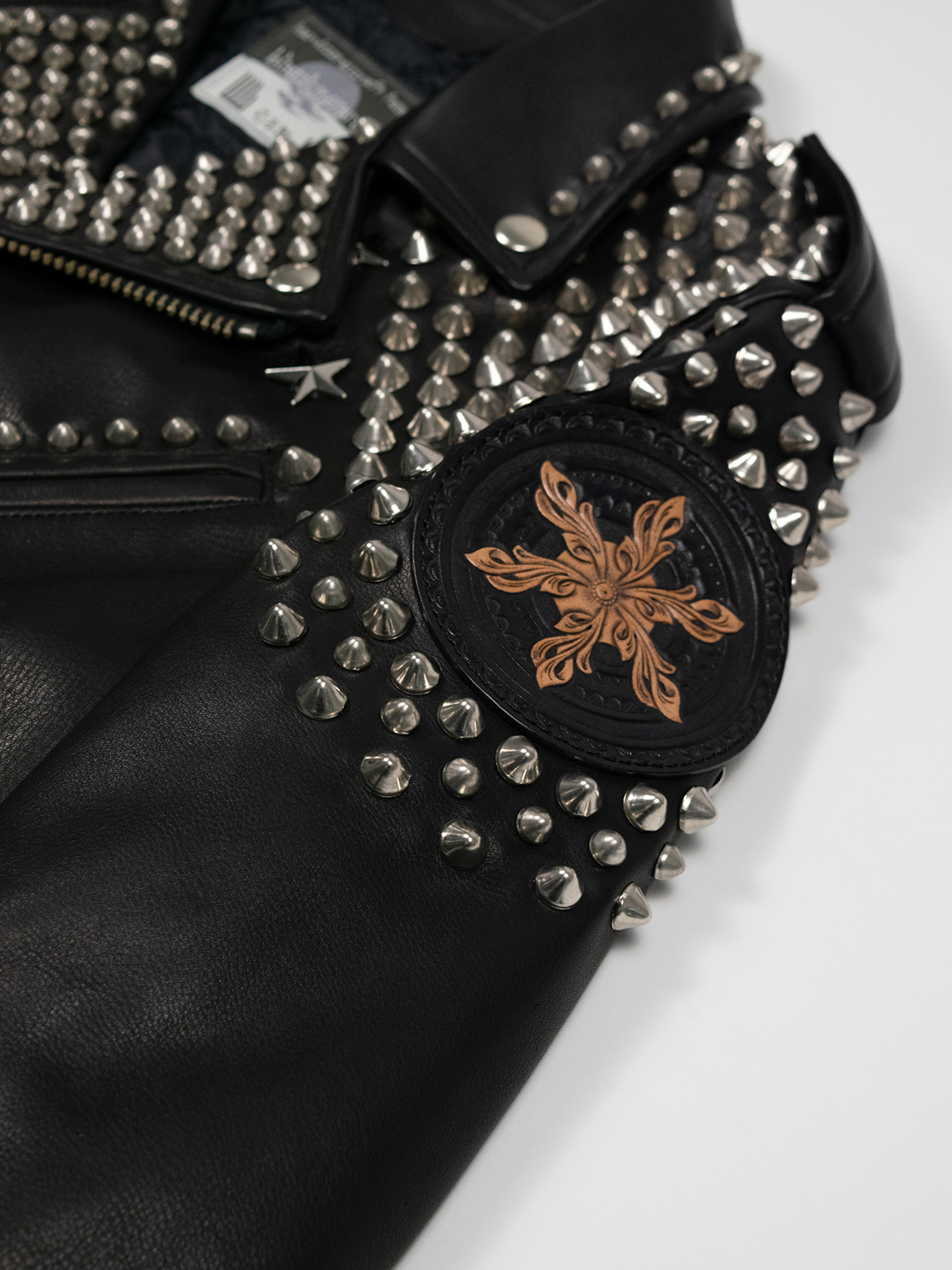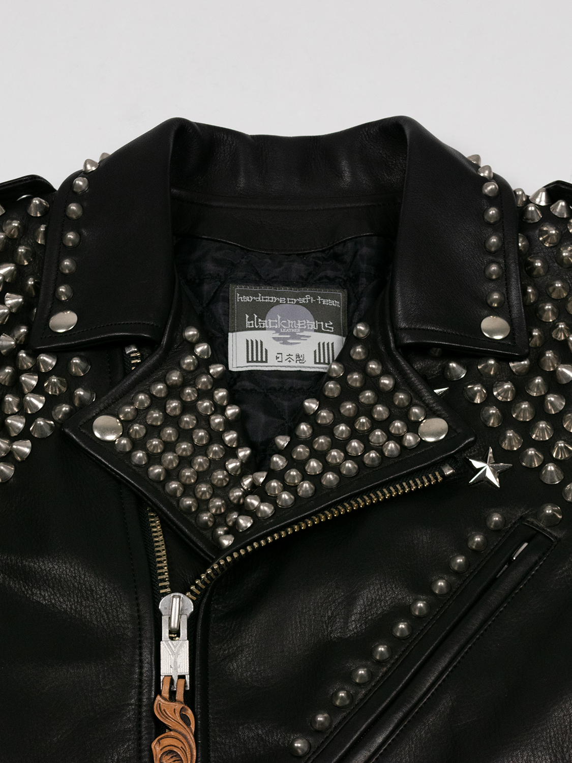 blackmeansのライダースジャケットをベースとした本作は、全体を覆う緻密なスタッズワークが大きな特徴。