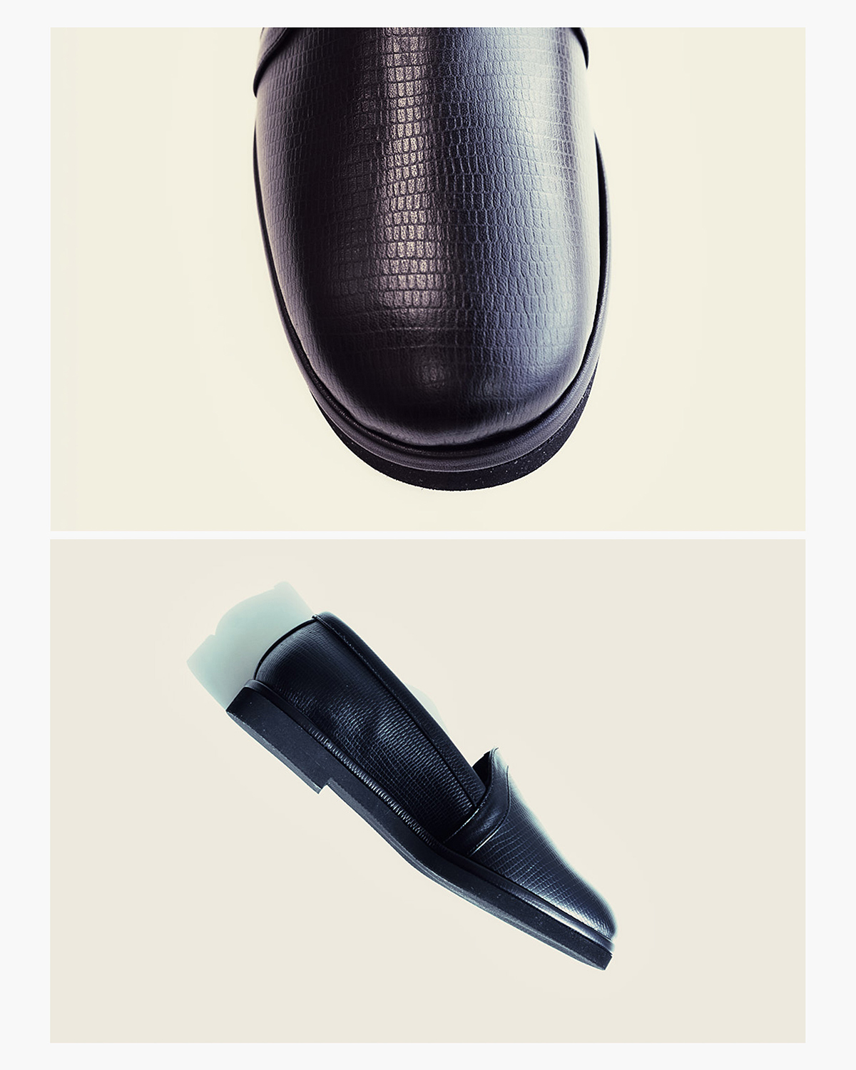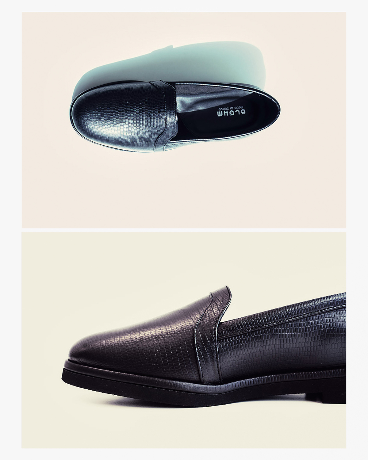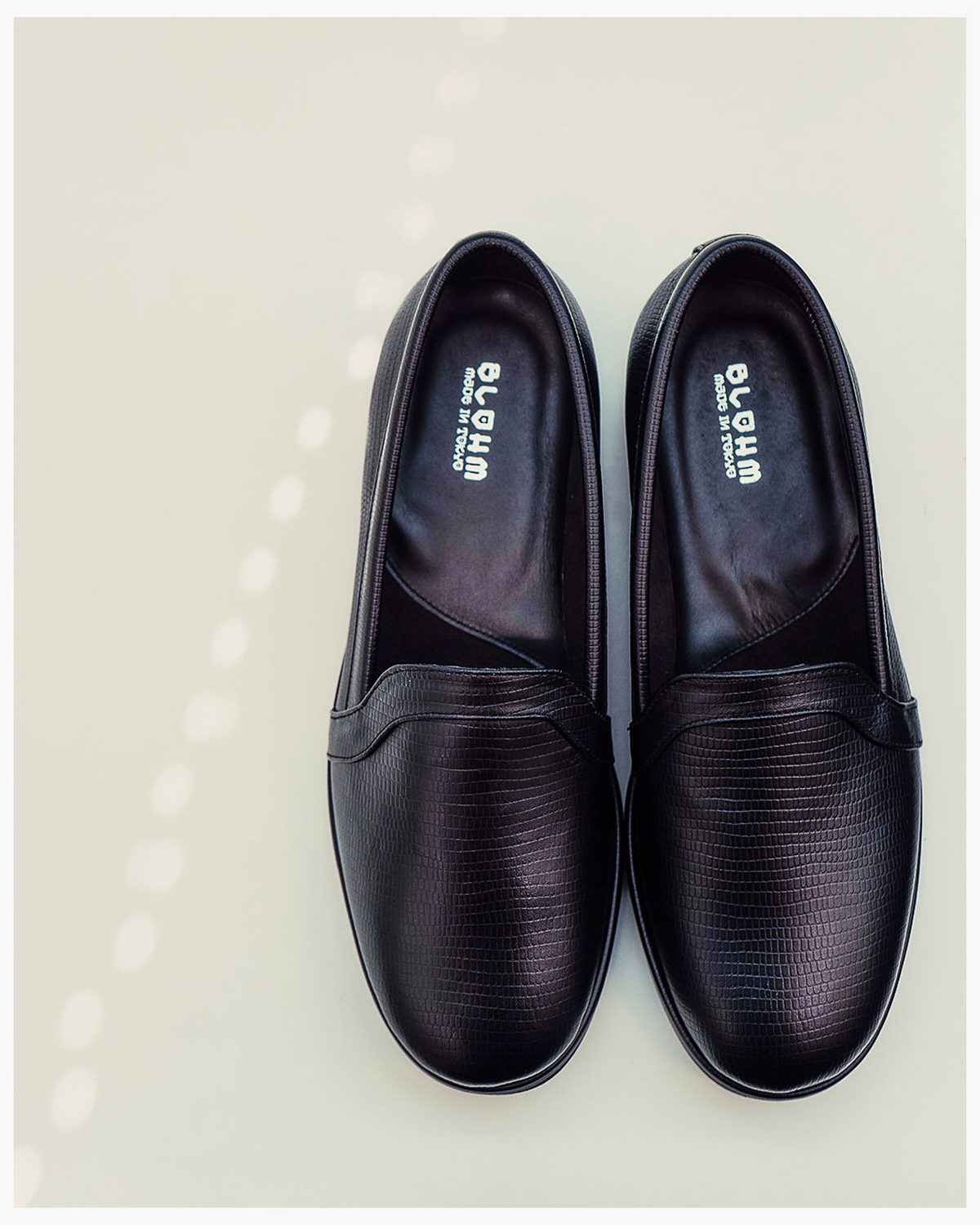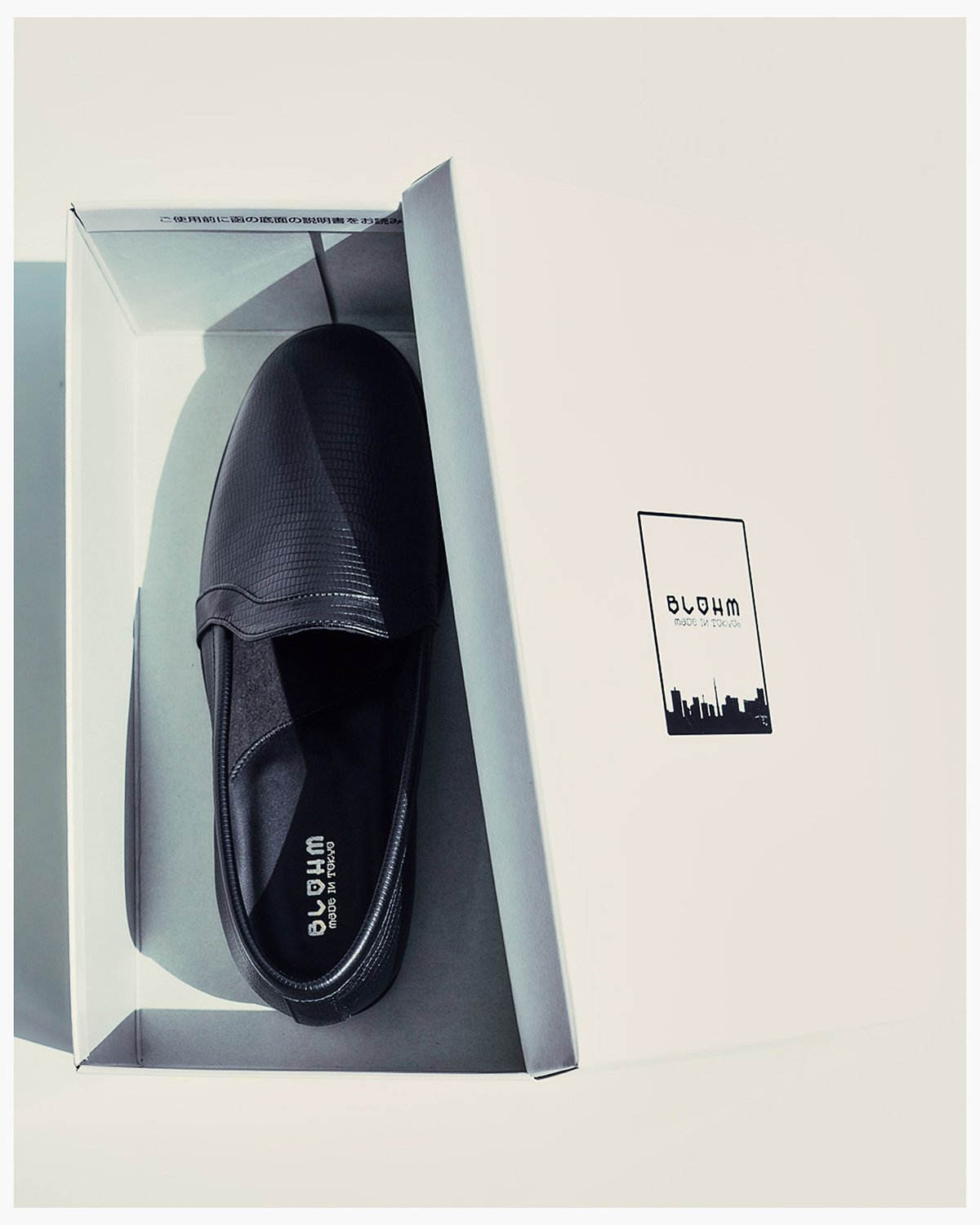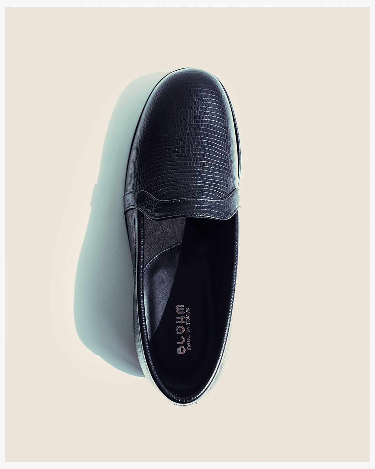 BLOHM定番の『STORE SLIP』をベースとした本作では、リザード柄の型押しを施したマットな質感のエンボスレザーをアッパー素材に採用。