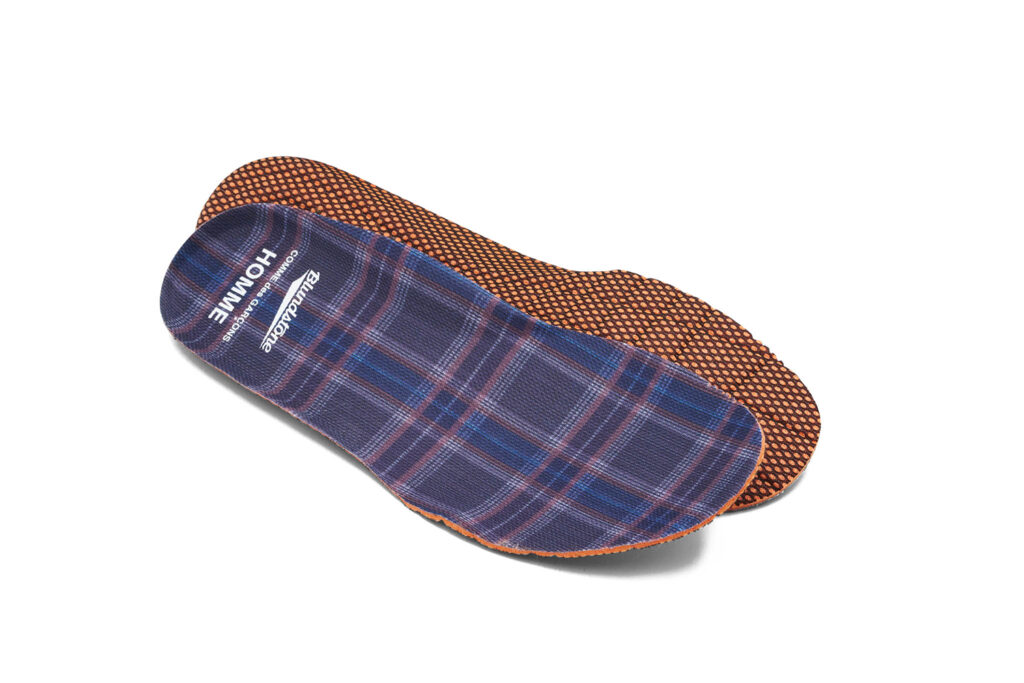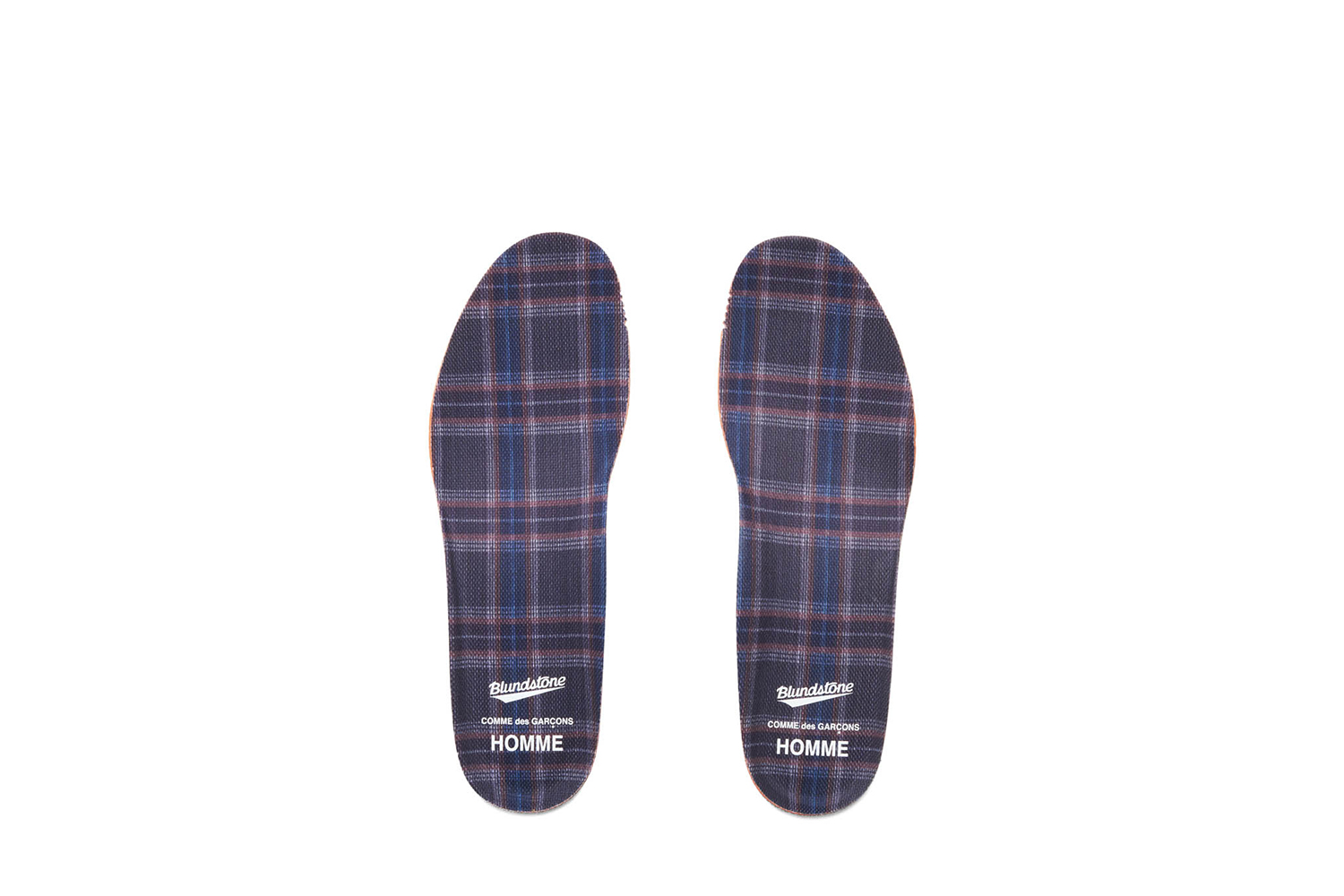 サイドゴアとフットベッドに、COMME des GARÇONS HOMMEのロゴエンボスとシグネチャーであるチェック柄を採用した1足は、COMME des GARÇONSの一部店舗および一部の取扱店にて発売中。