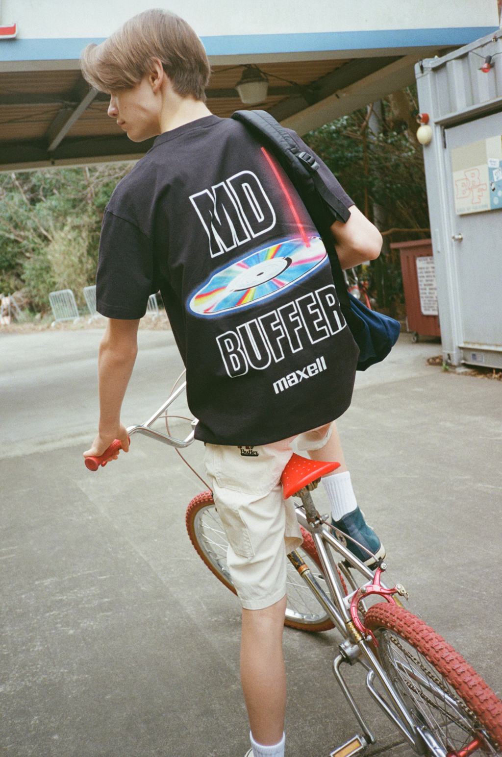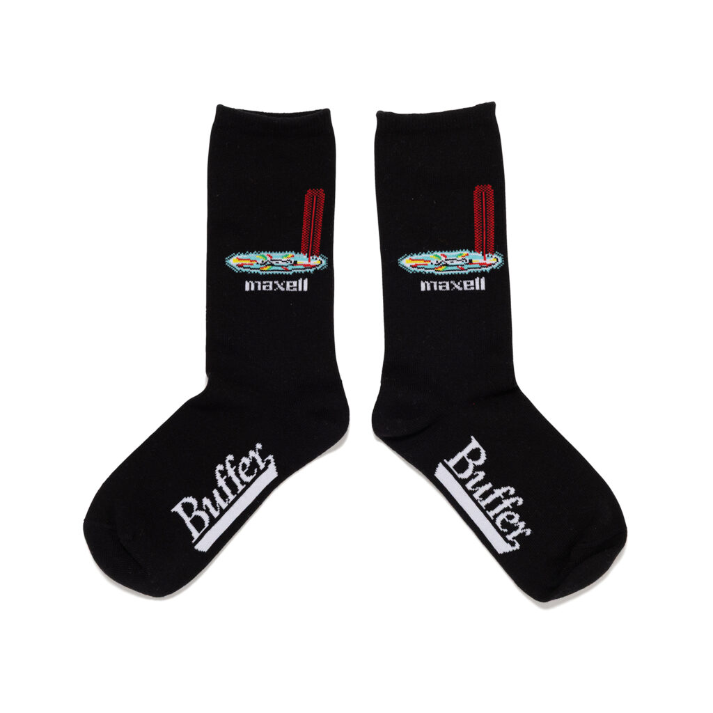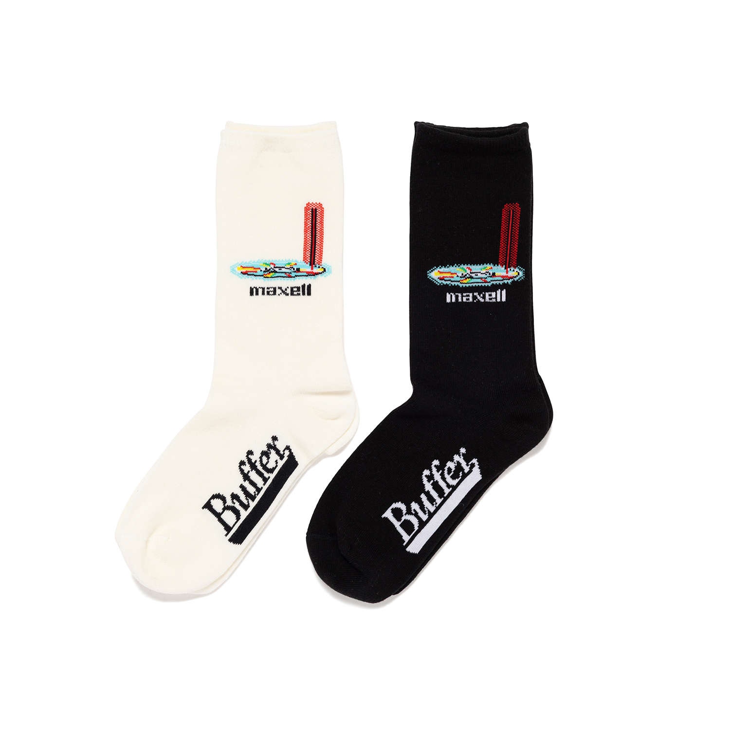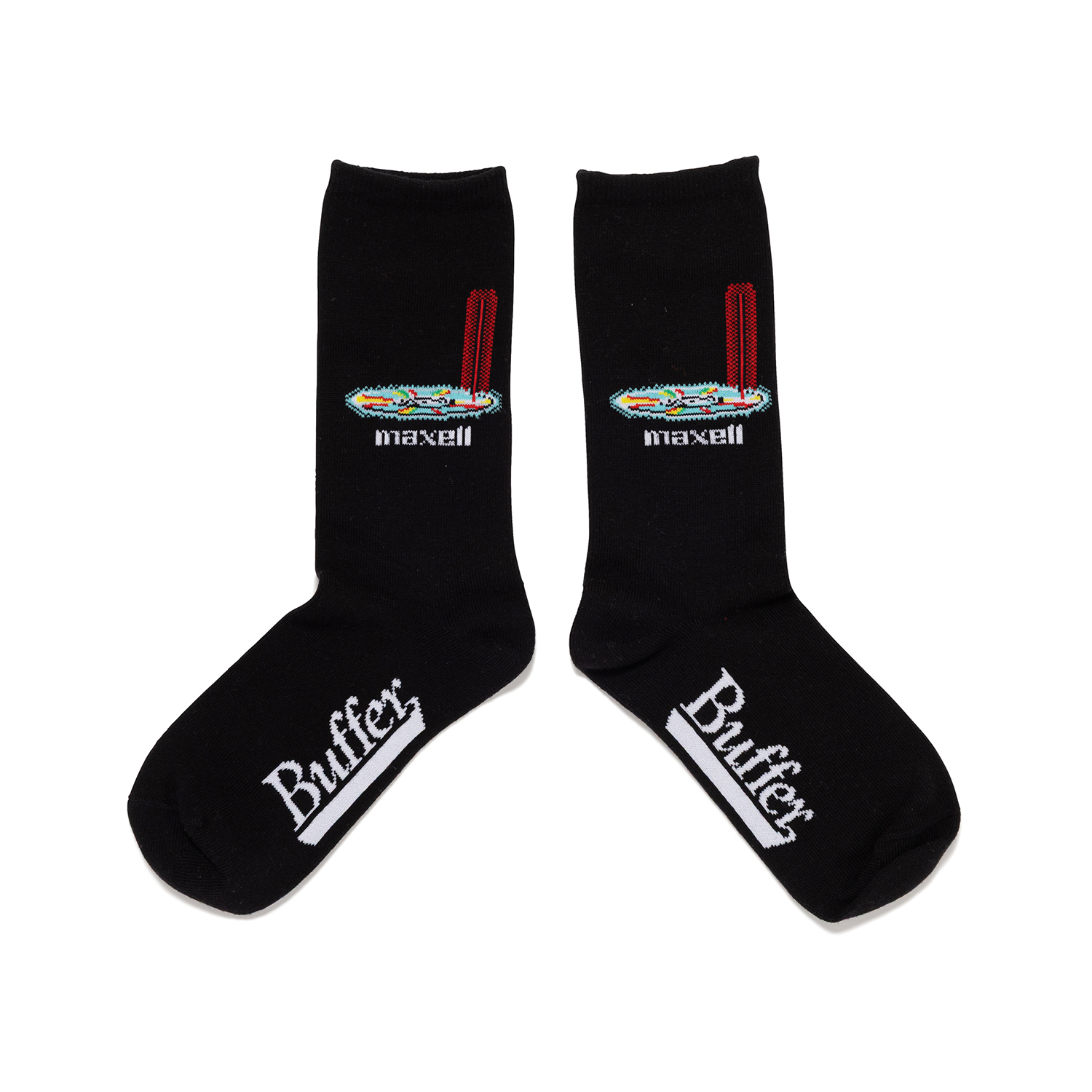 1970年代の角形9V電池や、1993年発売のMaxellブランド初代MDパッケージをグラフィックへと落とし込んだTシャツやソックスのほか、スピーカー付きBluetooth®対応ポータブルカセットプレーヤー『MXCP-P100SBK』もBuffer Store限定で登場する。