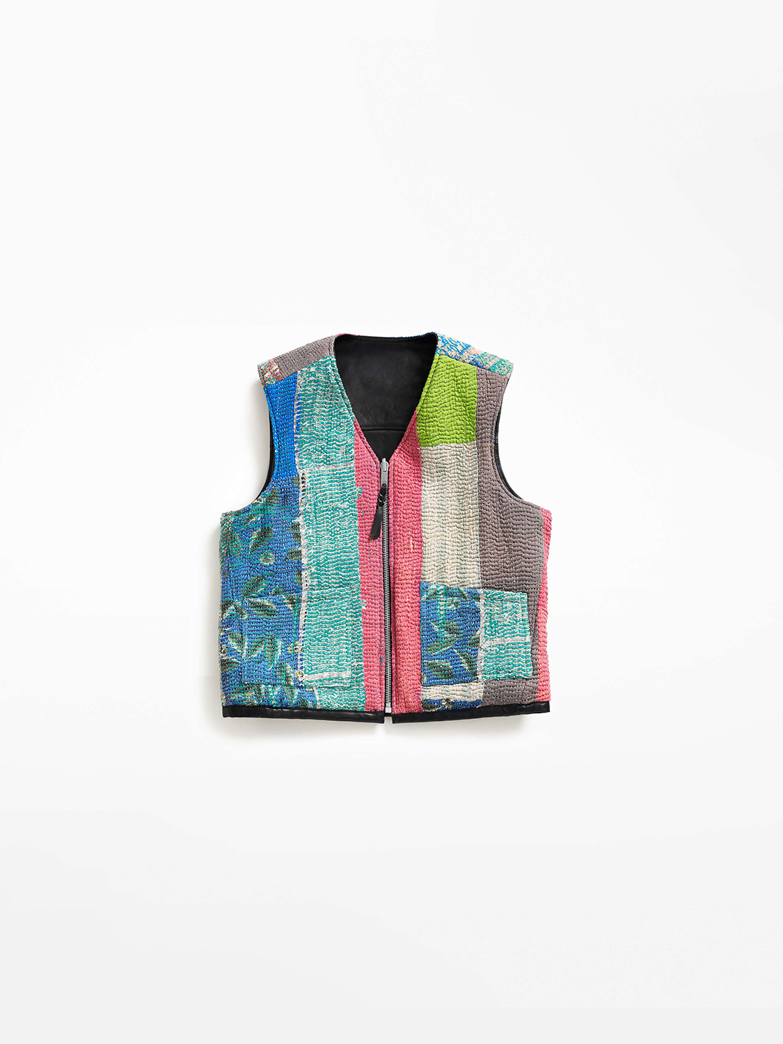 ジャケットは、内側にインド女性が纏っていた古いサリーを再利用した手刺しキルティングのカンタブランケットを採用。ベストはカンタの豊かな模様を外側に着用することで、伝統的なテキスタイル文化への敬意を込めた華やかな1着に様変わりする。
