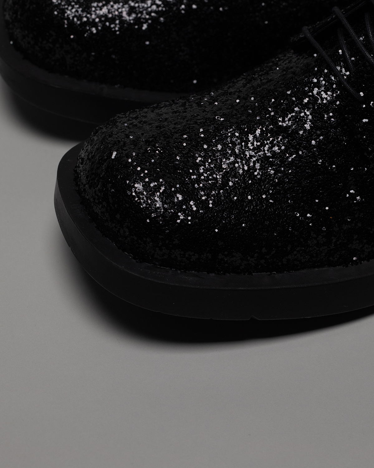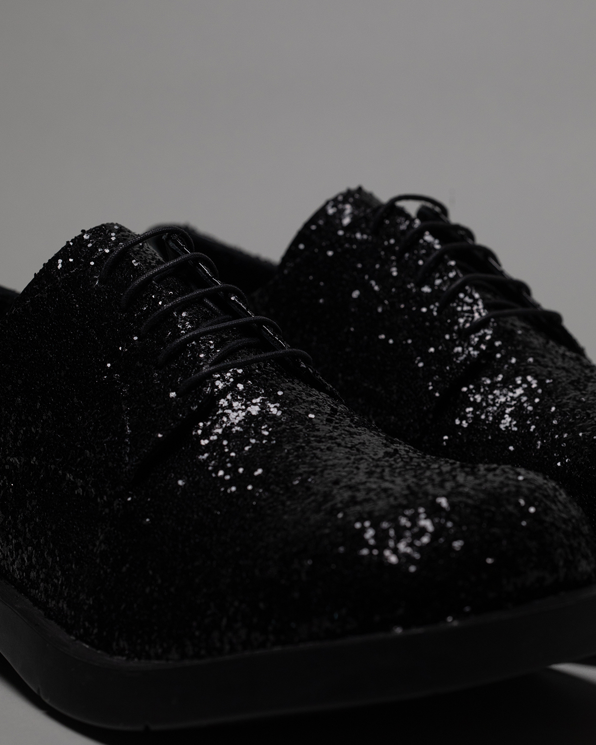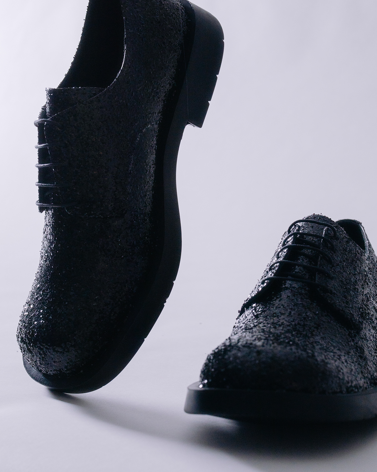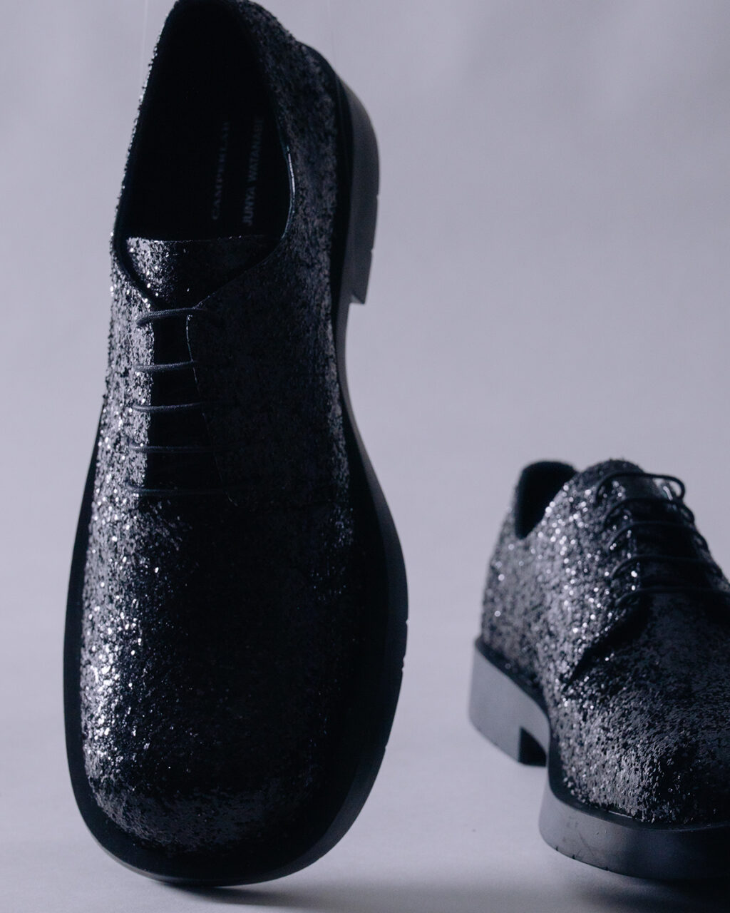 JUNYA WATANABEでは、CAMPERLABを代表するモデルのひとつである『MIL 1978』をベースモデルに採用。職人が1足ずつブラックグリッターを施し、アッパー、ソール、インソールまで、全てをブラックで統一することで、スタイリッシュな佇まいに仕上げた。