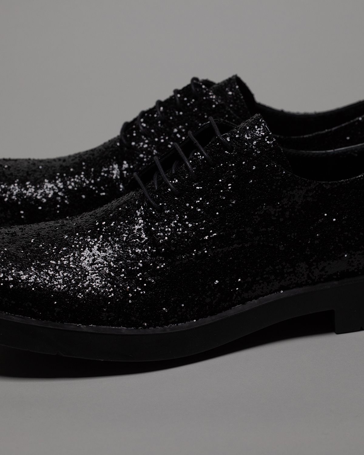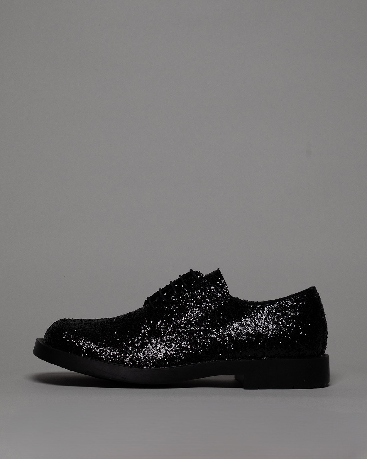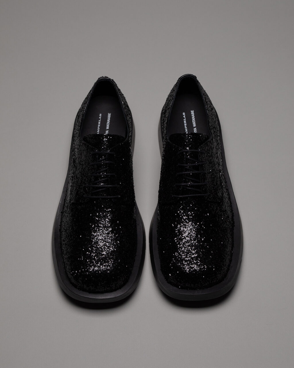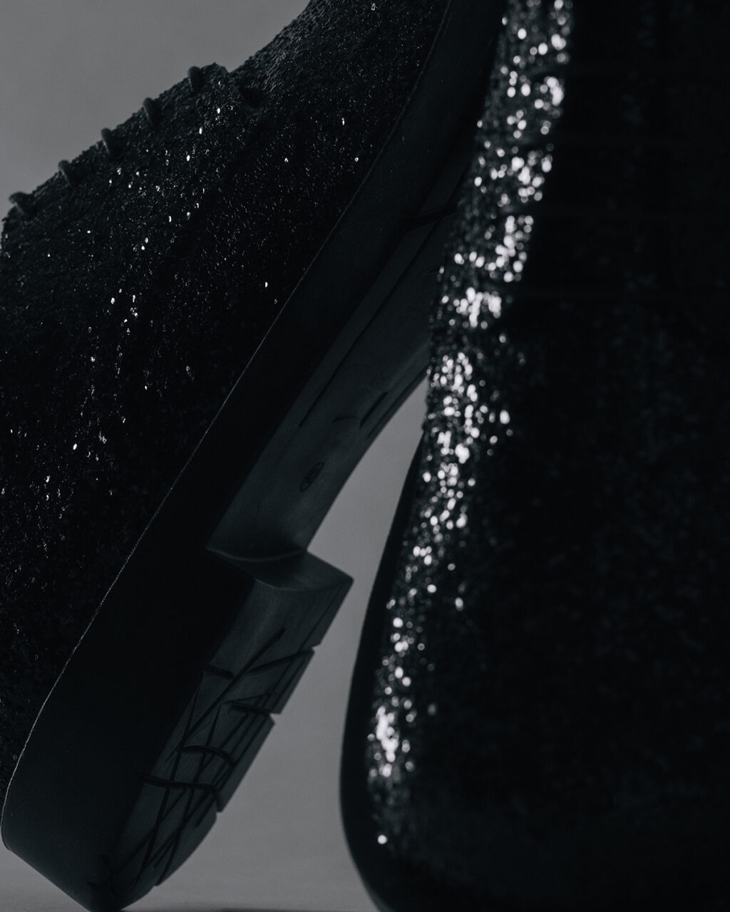 JUNYA WATANABEでは、CAMPERLABを代表するモデルのひとつである『MIL 1978』をベースモデルに採用。職人が1足ずつブラックグリッターを施し、アッパー、ソール、インソールまで、全てをブラックで統一することで、スタイリッシュな佇まいに仕上げた。