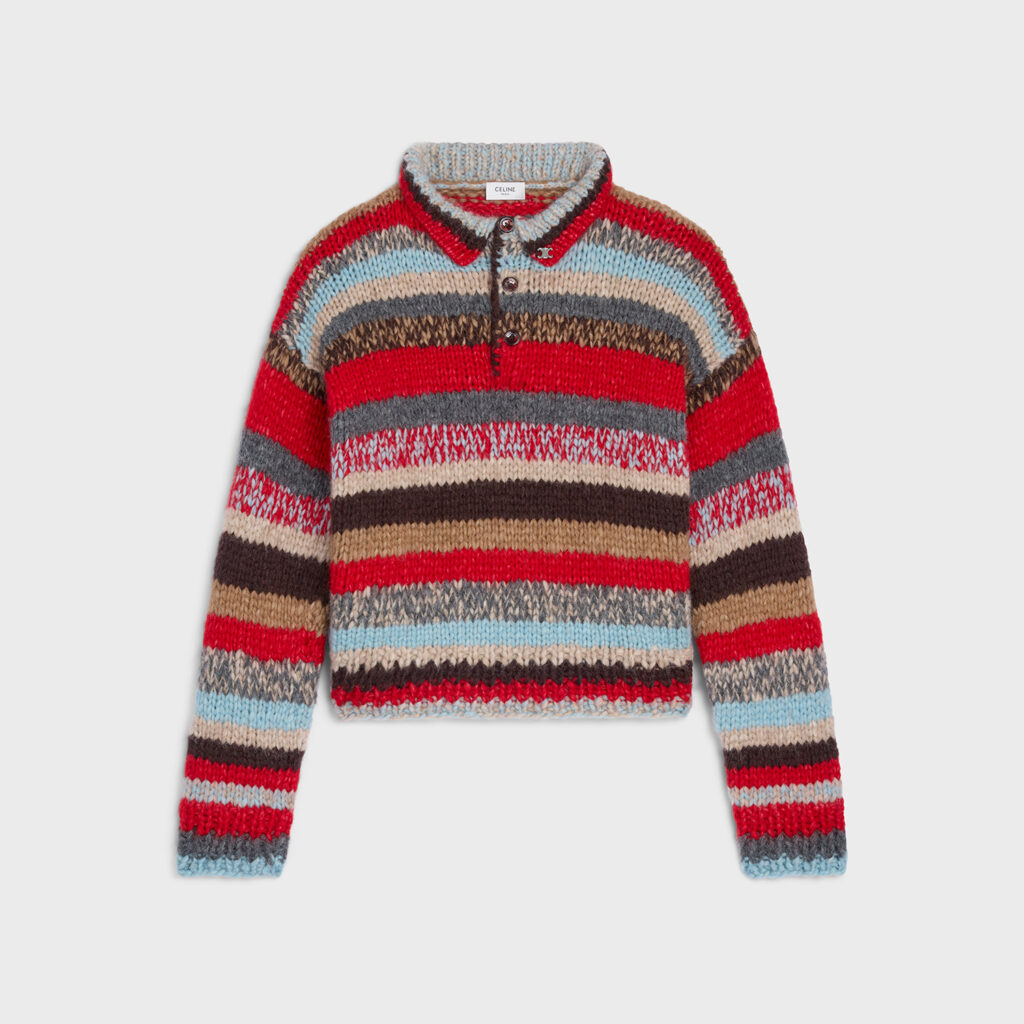 マルチカラーのポロセーターや、大胆なショルダーが特徴的なコロンヌジャケット、多様なシルエットのジーンズまたコレクション全体のキーエレメントとして随所に取り入れられたシルクスカーフ等が登場する。