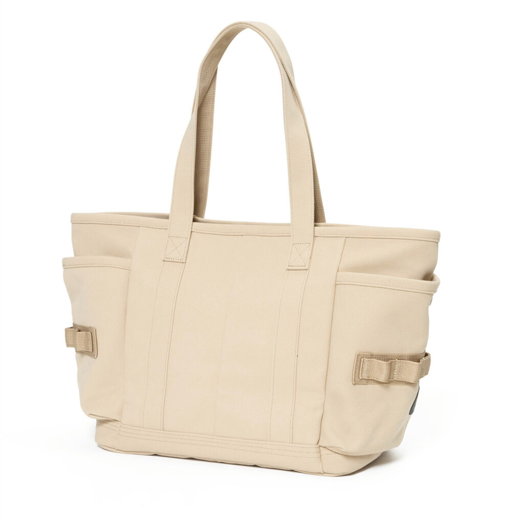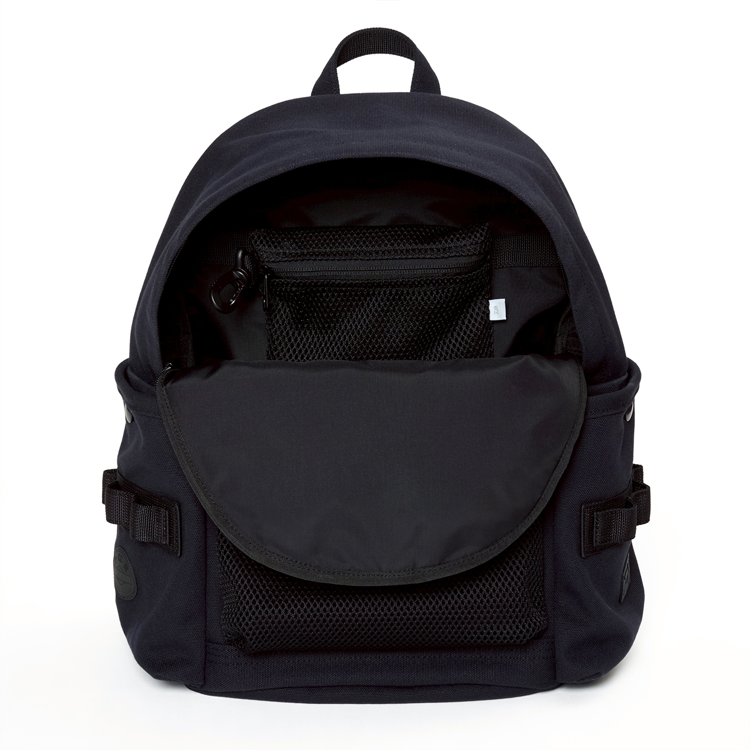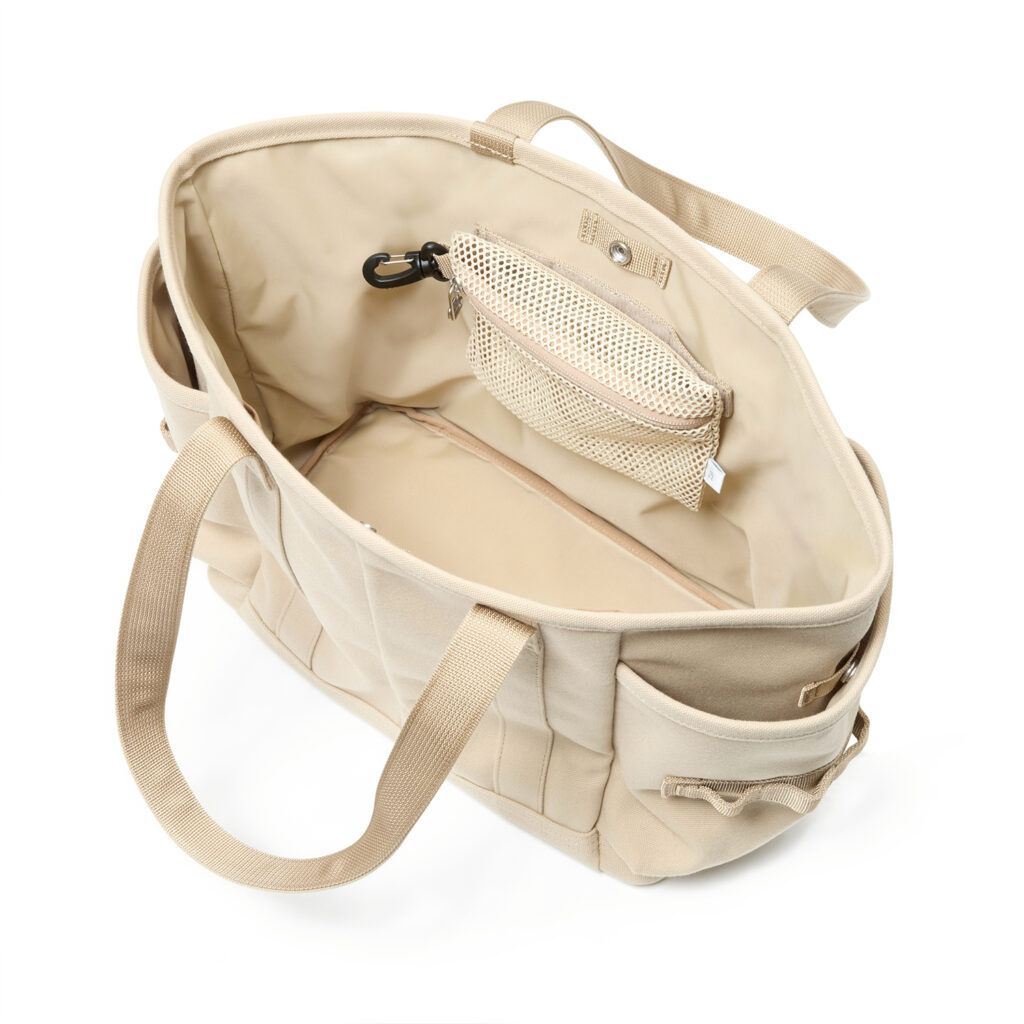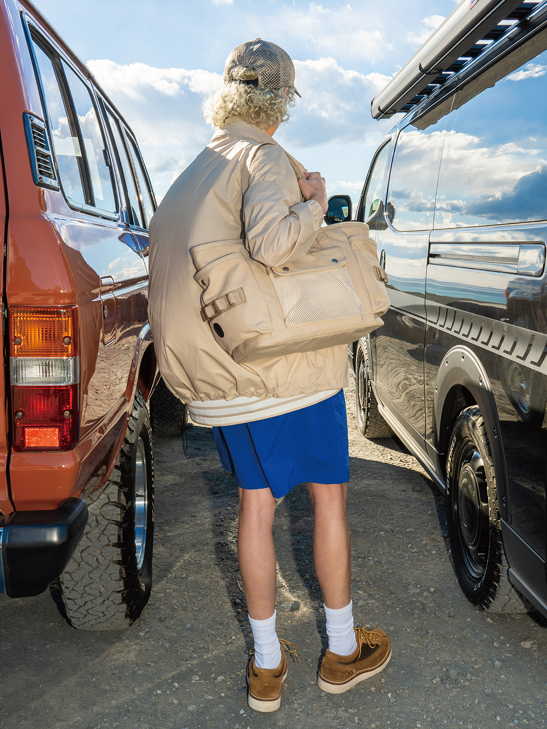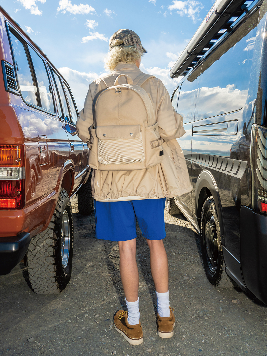 メイン素材に採用したコットンライクな風合いの66ナイロンは、耐摩擦・引き裂き強度に優れ、急な雨にも対応する撥水加工を施したもの。デザインのアクセントにもなっているナイロンテープは、カラビナやキーホルダーを取り付けて使用することも可能だ。
