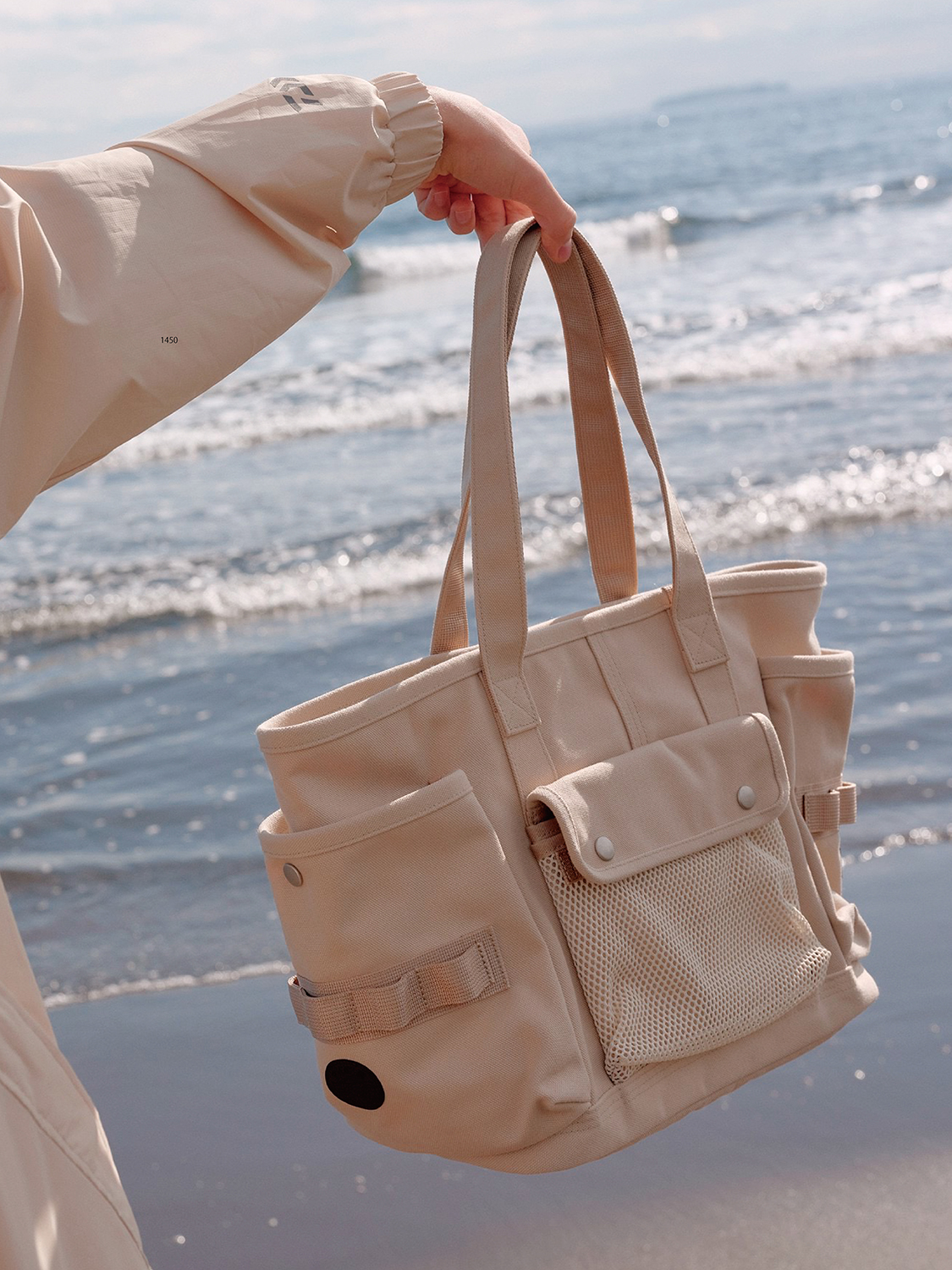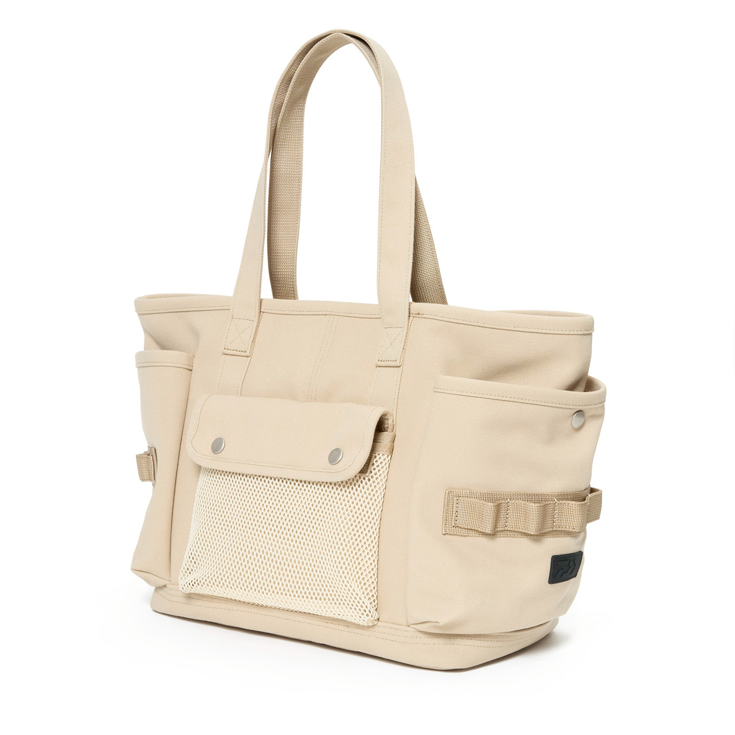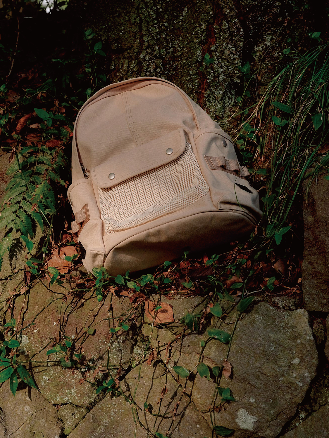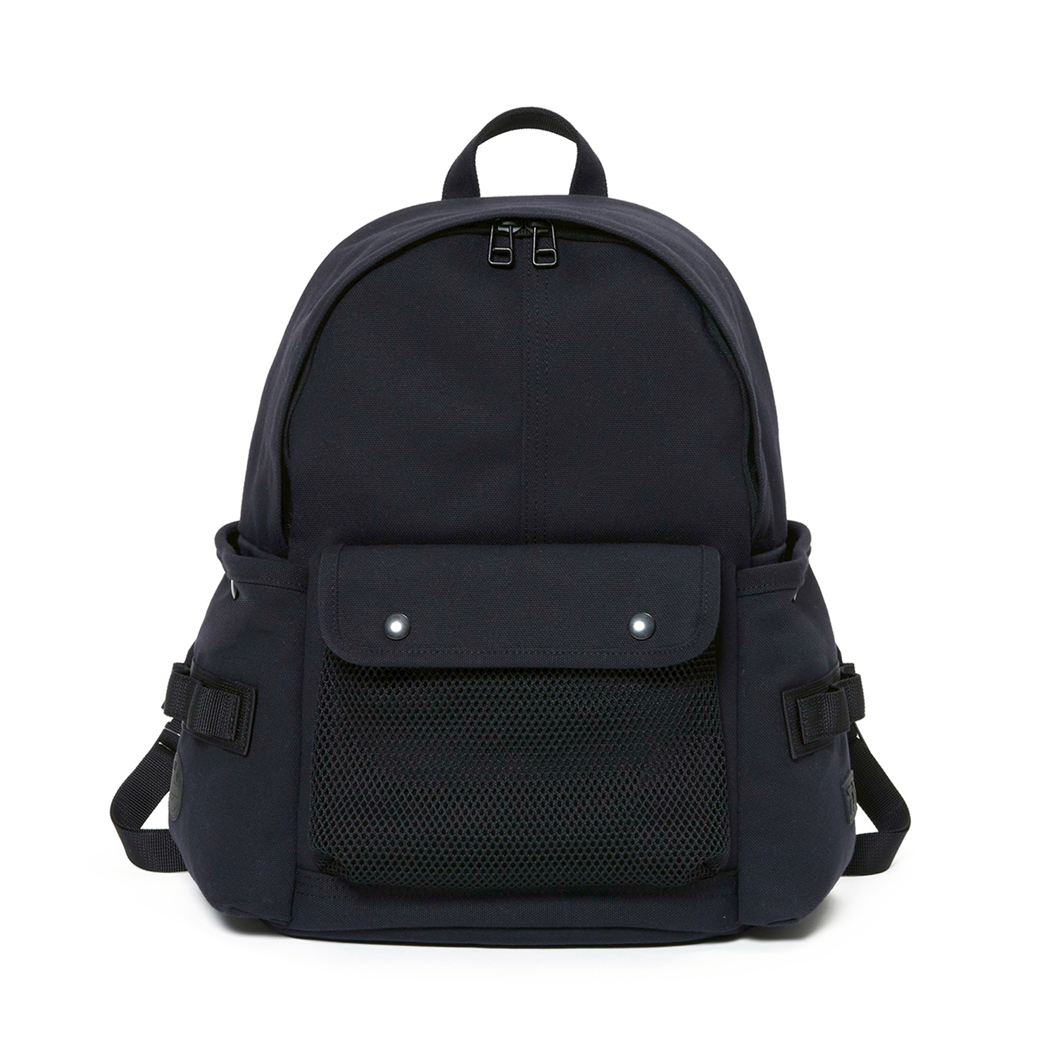 メイン素材に採用したコットンライクな風合いの66ナイロンは、耐摩擦・引き裂き強度に優れ、急な雨にも対応する撥水加工を施したもの。デザインのアクセントにもなっているナイロンテープは、カラビナやキーホルダーを取り付けて使用することも可能だ。