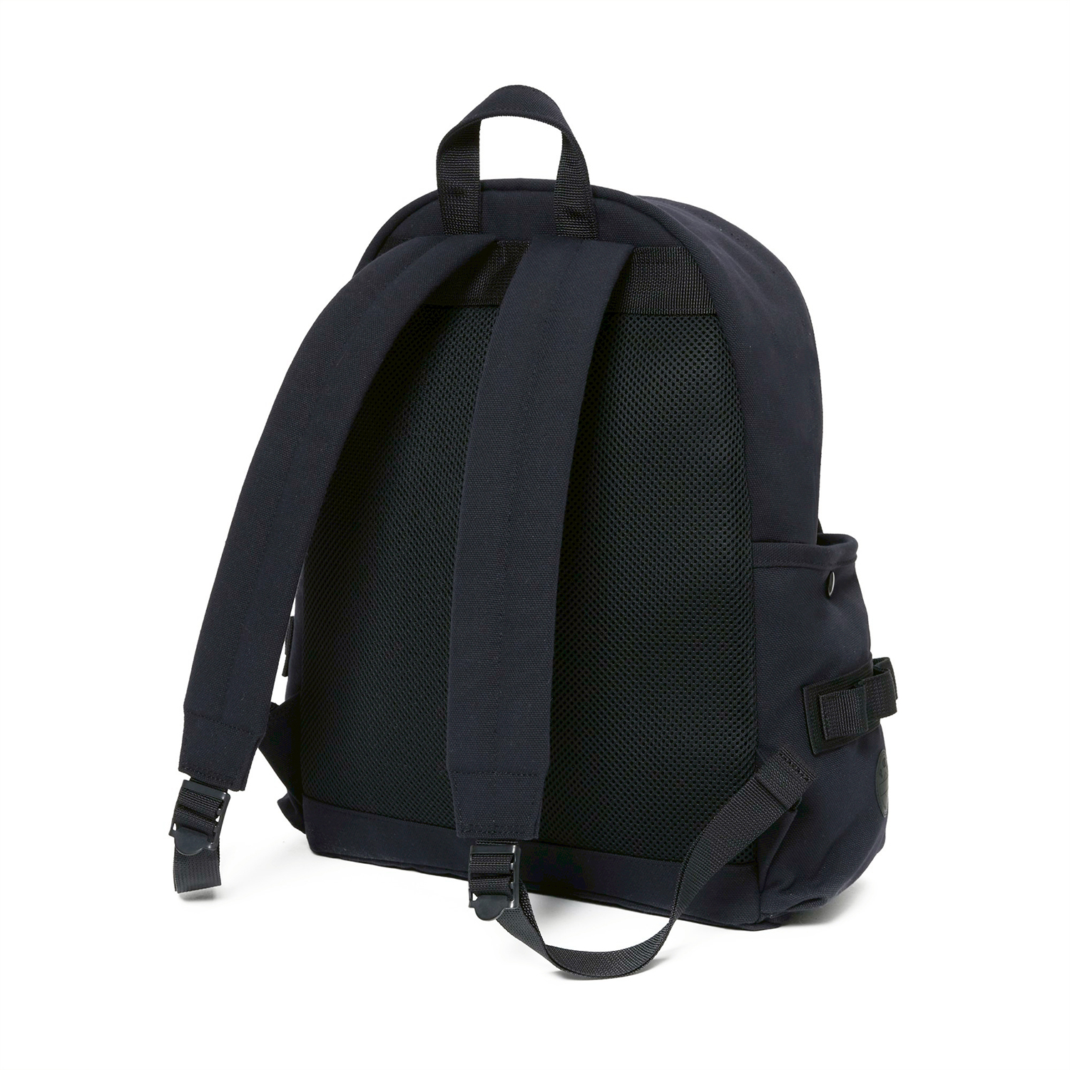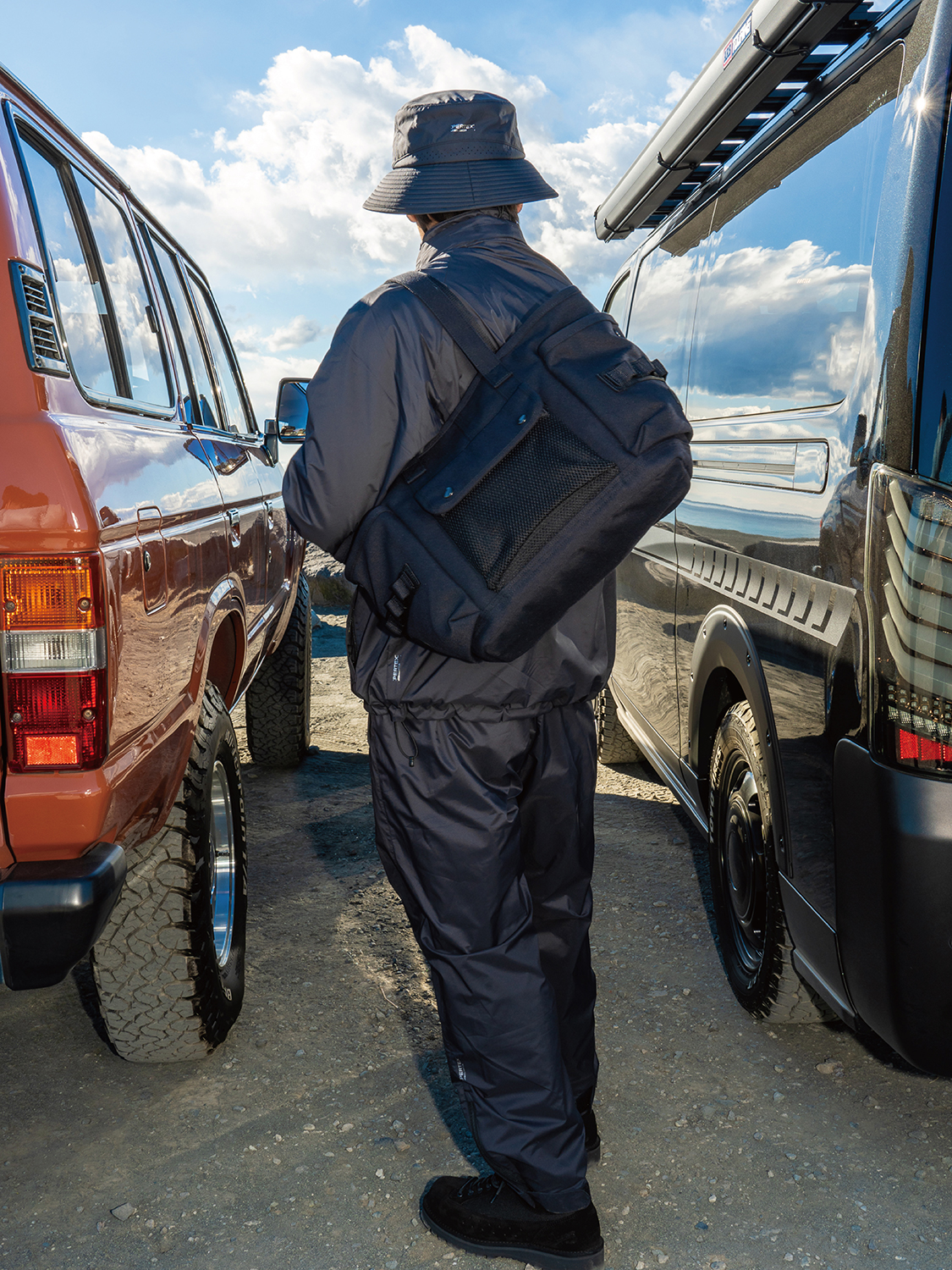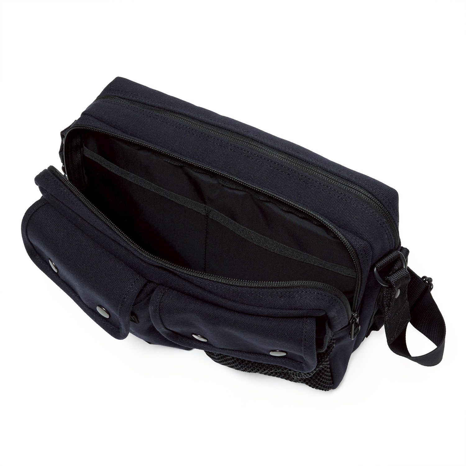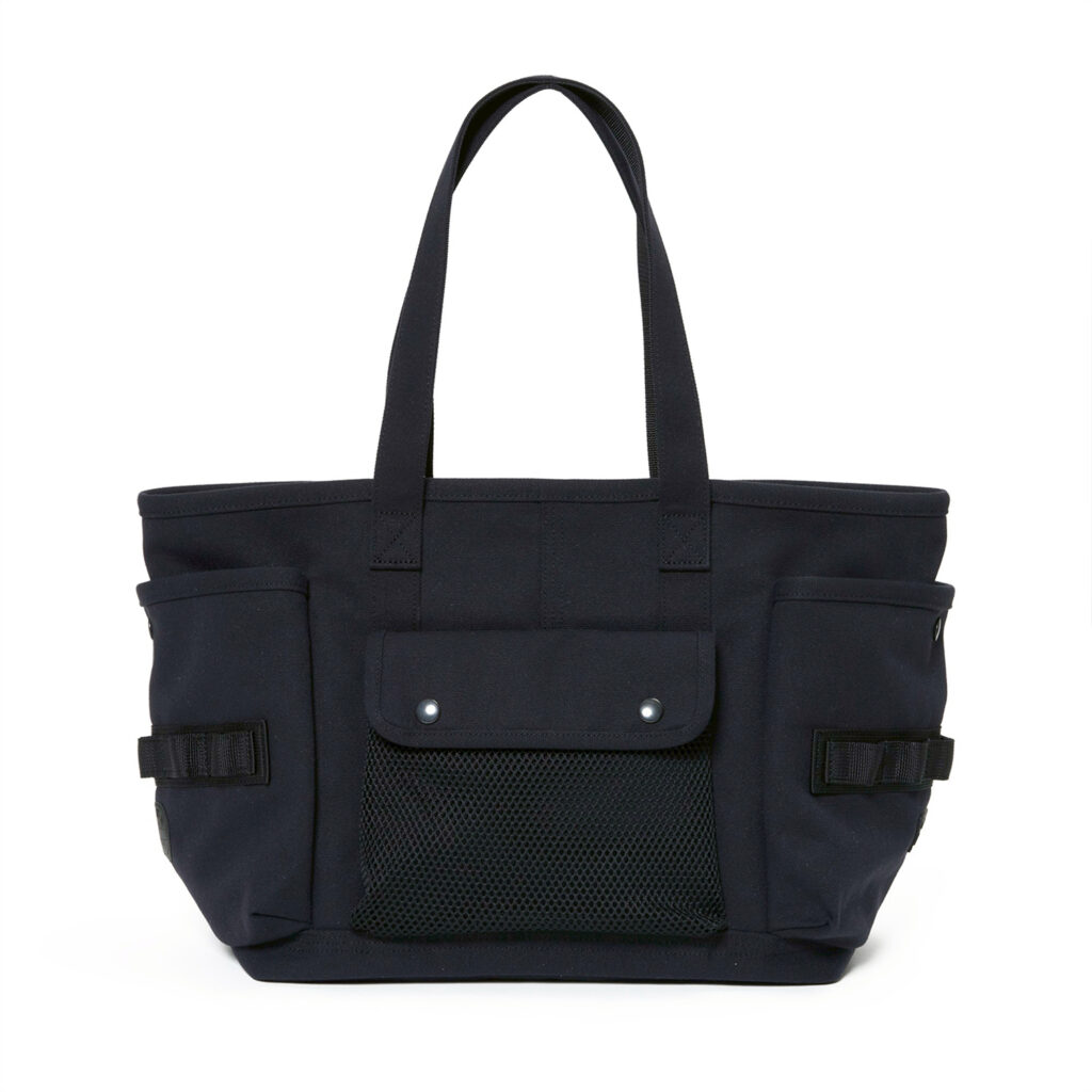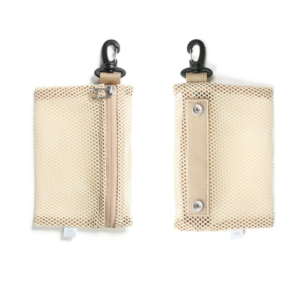 メイン素材に採用したコットンライクな風合いの66ナイロンは、耐摩擦・引き裂き強度に優れ、急な雨にも対応する撥水加工を施したもの。デザインのアクセントにもなっているナイロンテープは、カラビナやキーホルダーを取り付けて使用することも可能だ。