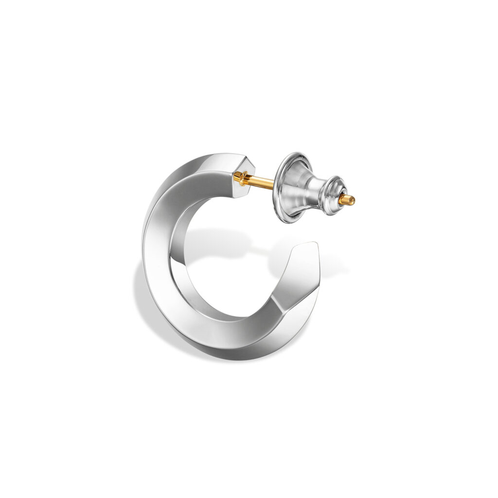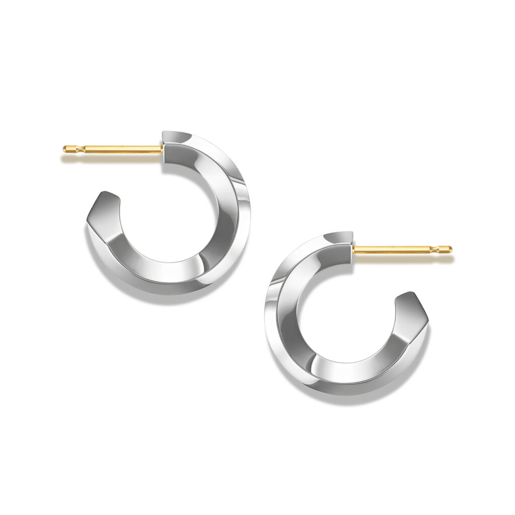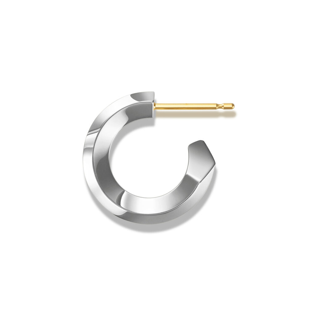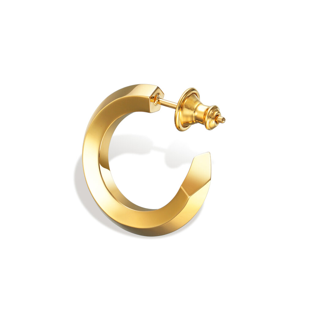 シンプルながらも建築的な美意識を感じさせるユニセックスなデザインで、多面カットによってあらゆる角度から光を取り込み、耳元で洗練された輝きを放つ。