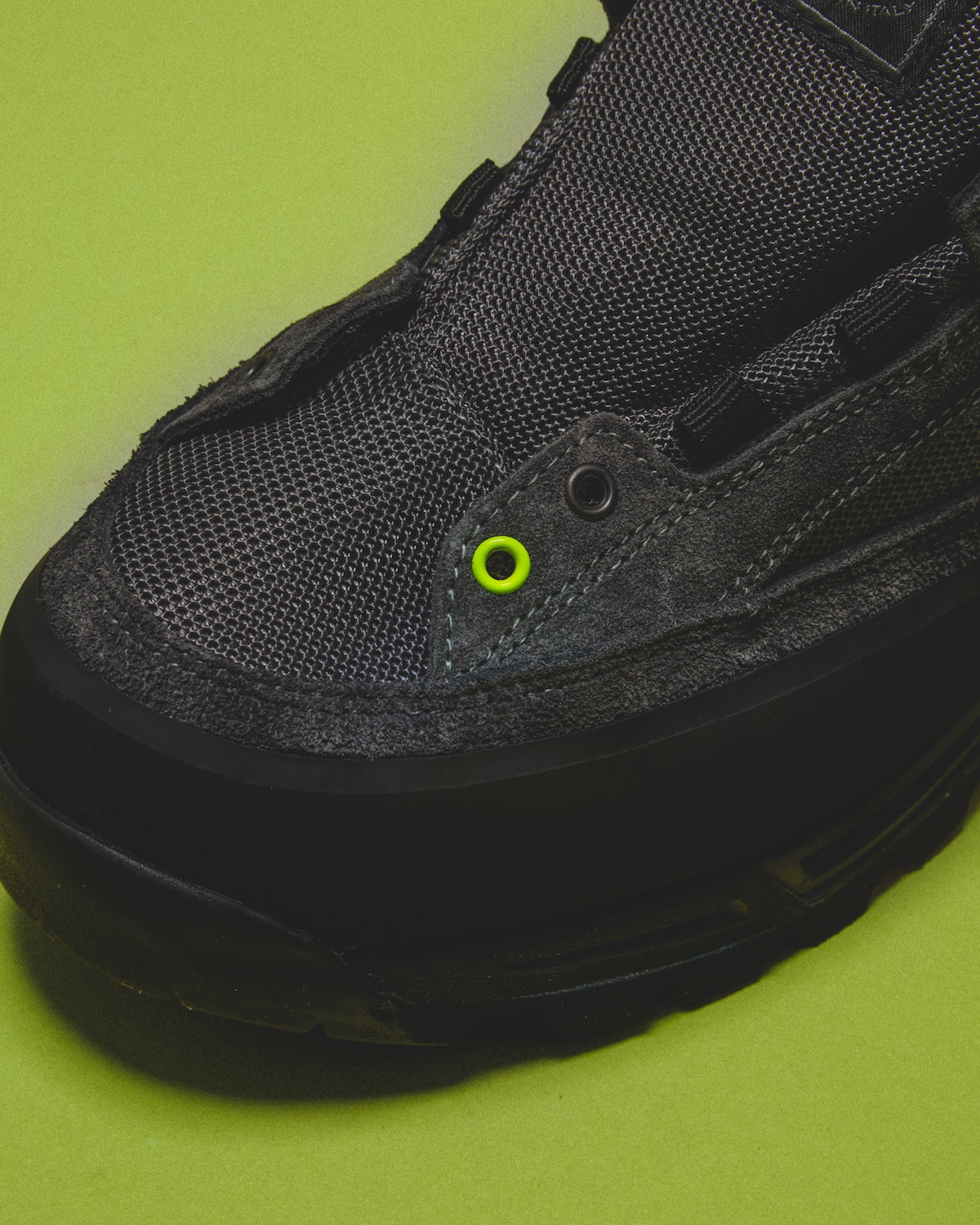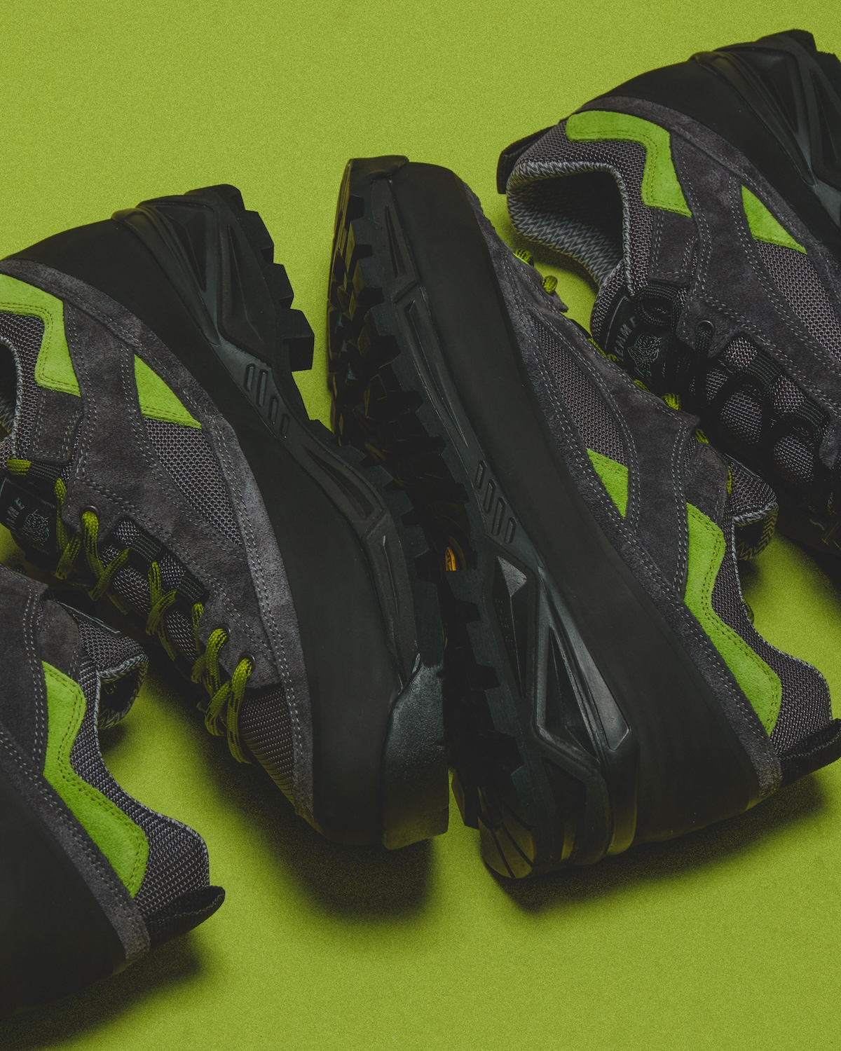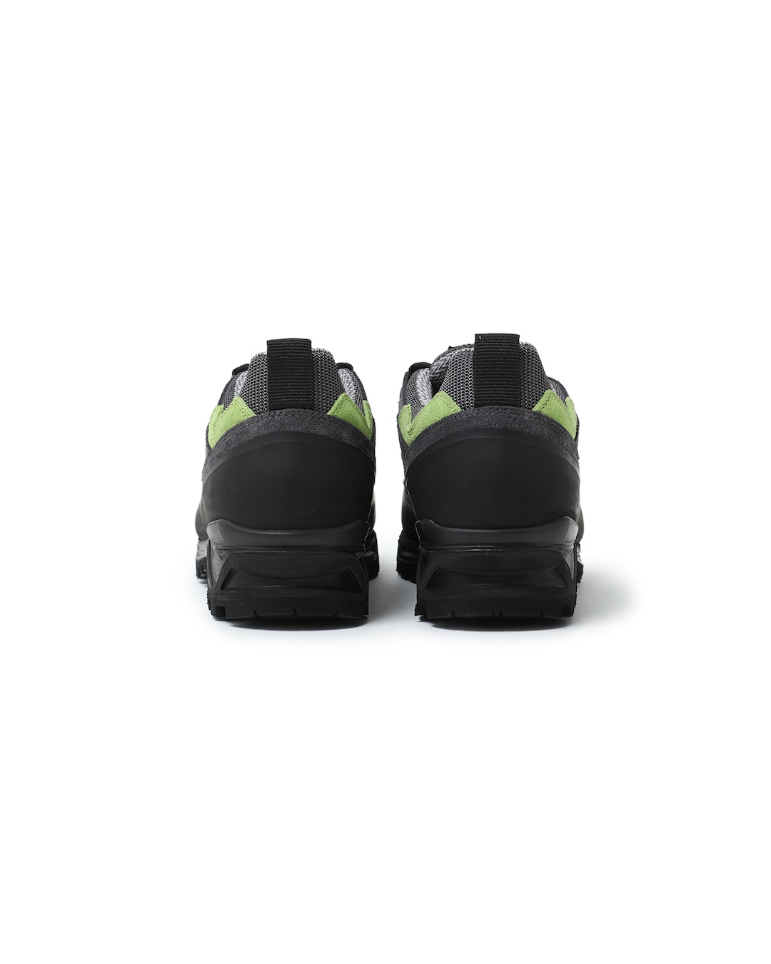 チャコールカラーのスウェードとナイロンを組み合わせたシックなアッパーに、やわらかなペールトーンのピスタチオカラーをアクセントとして配色することで、アーバンエリアとフィールド、いずれにも自然に溶け込む、上品で洗練された表情に仕上げている。