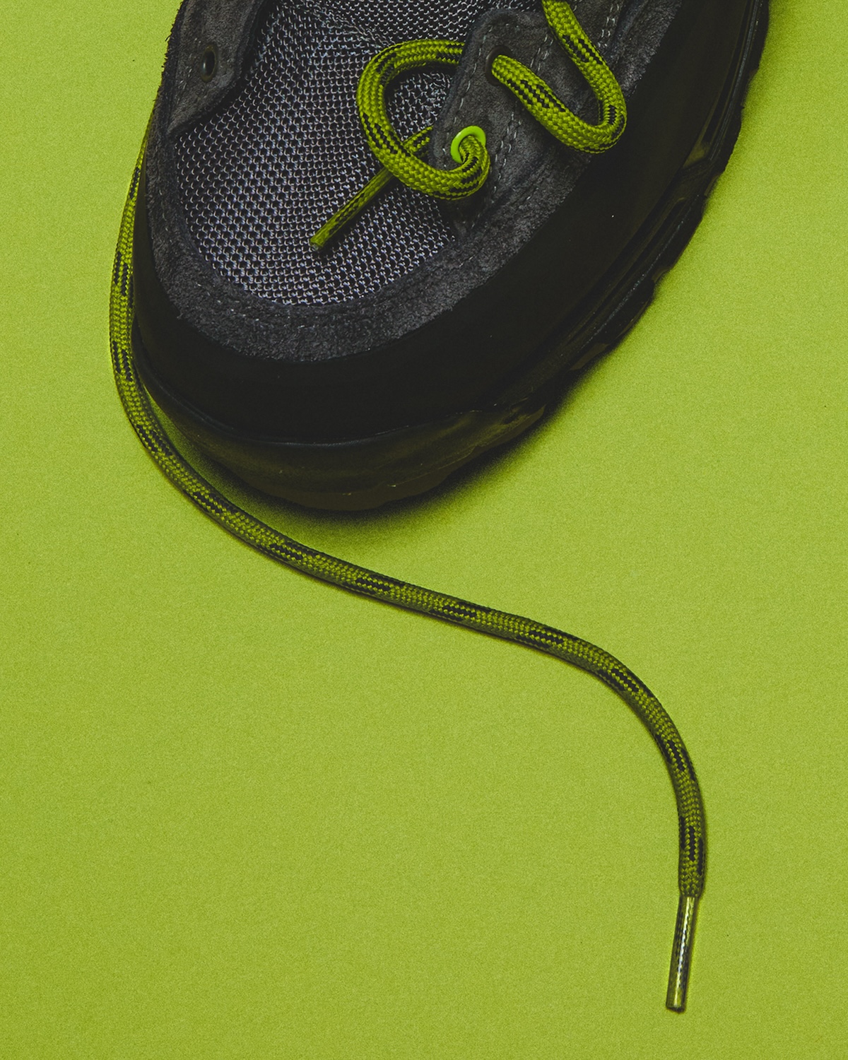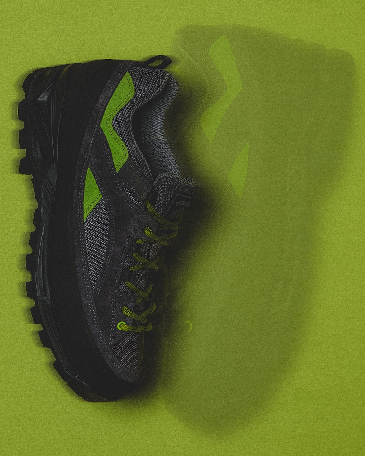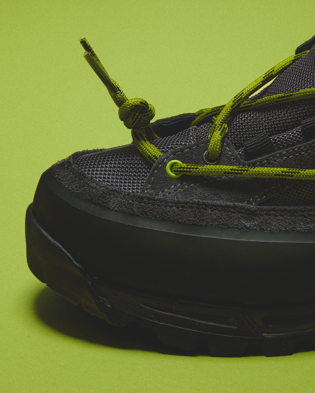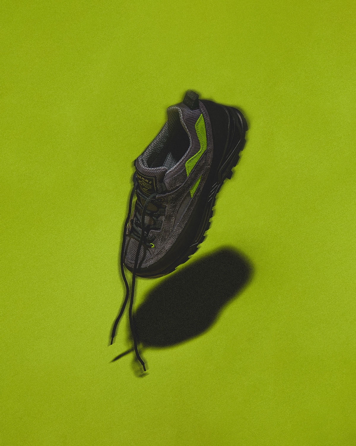 チャコールカラーのスウェードとナイロンを組み合わせたシックなアッパーに、やわらかなペールトーンのピスタチオカラーをアクセントとして配色することで、アーバンエリアとフィールド、いずれにも自然に溶け込む、上品で洗練された表情に仕上げている。