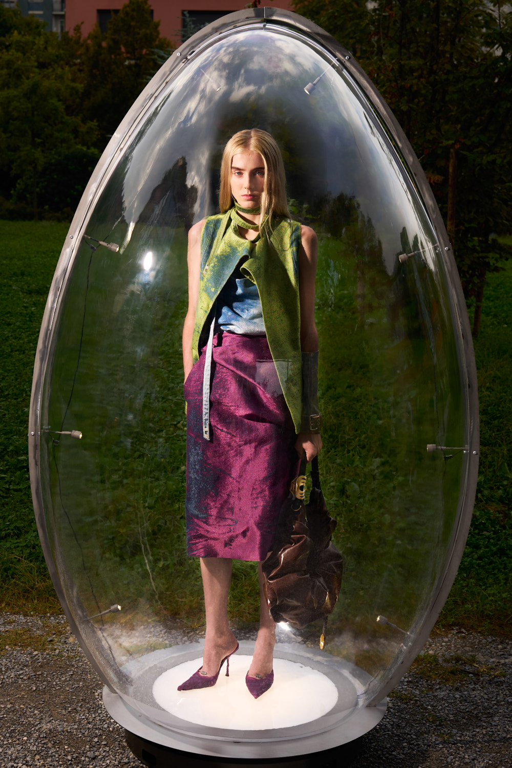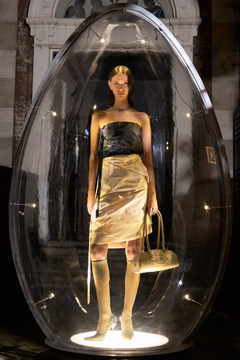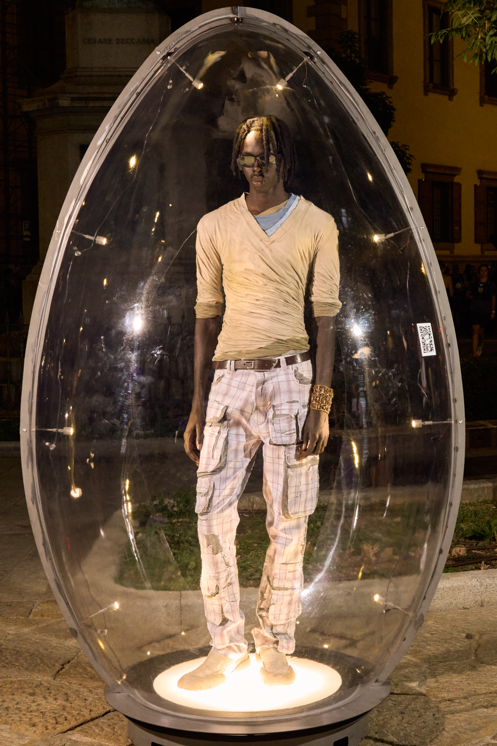 ミラノ市の後援のもと開催されたイベントでは、各ルックは巨大な透明の卵型カプセルに収められたモデルによって展示。ゲームには誰でも無料で参加が可能で、最も早く見つけた人には賞品も用意された。