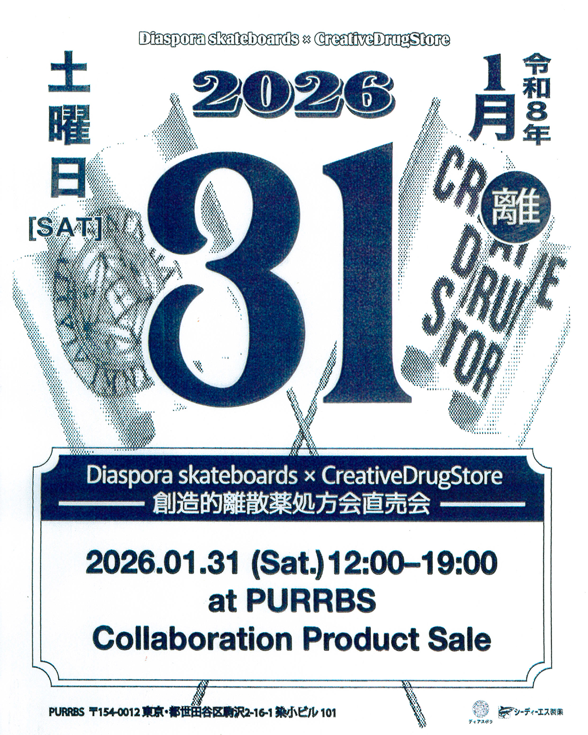 2022年に登場し大きな反響を呼んだ、Diaspora skateboards(ディアスポラ スケートボード)とCreativeDrugStoreによるコラボレーションアイテム。その待望の新作が1月31日(土)にリリースされる。