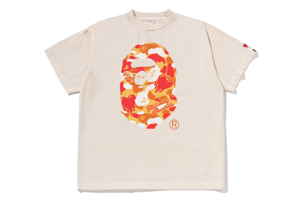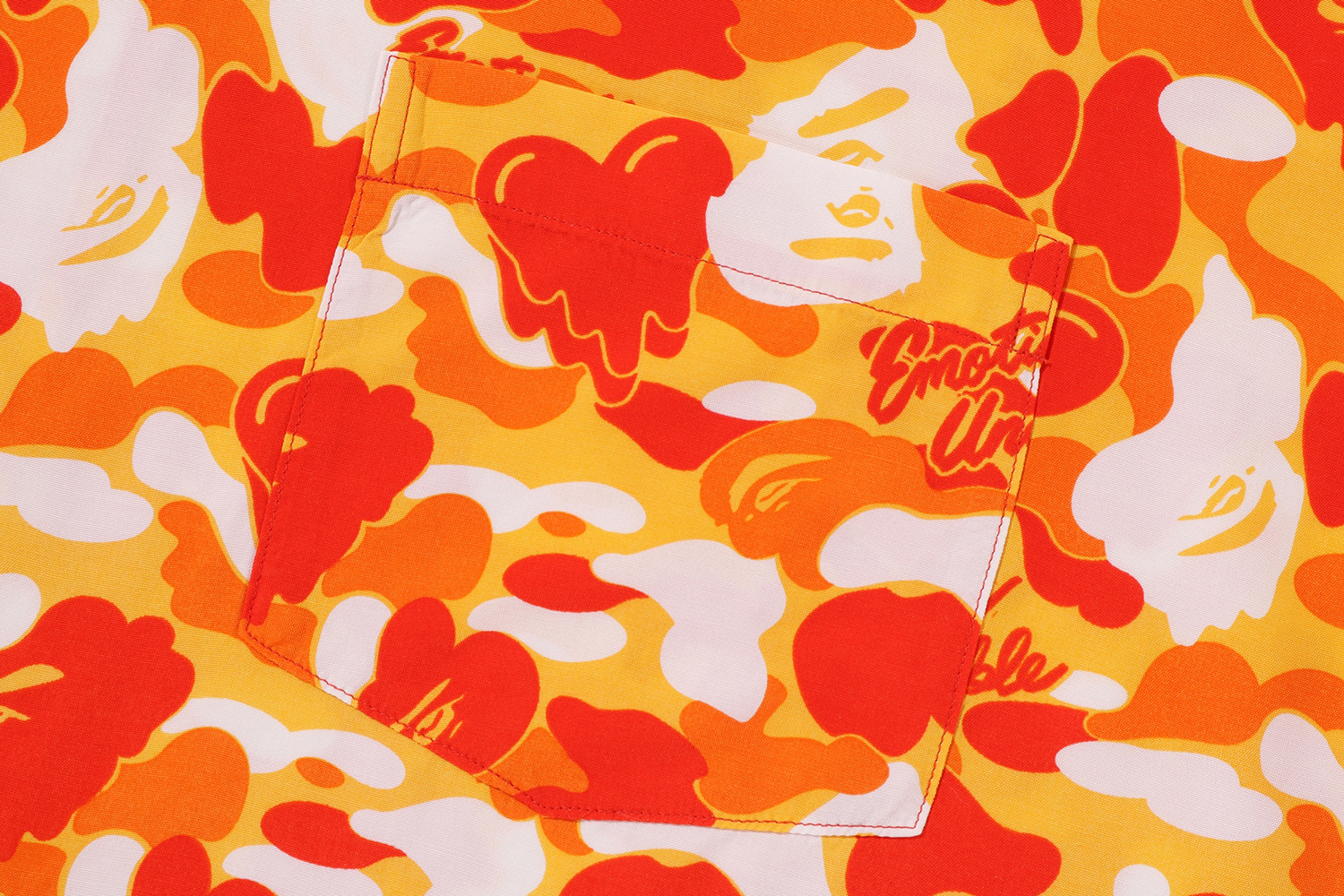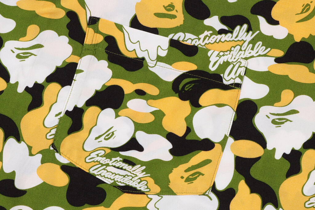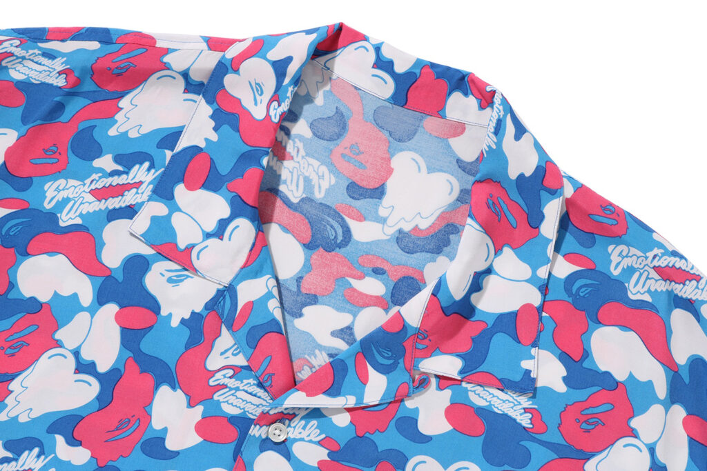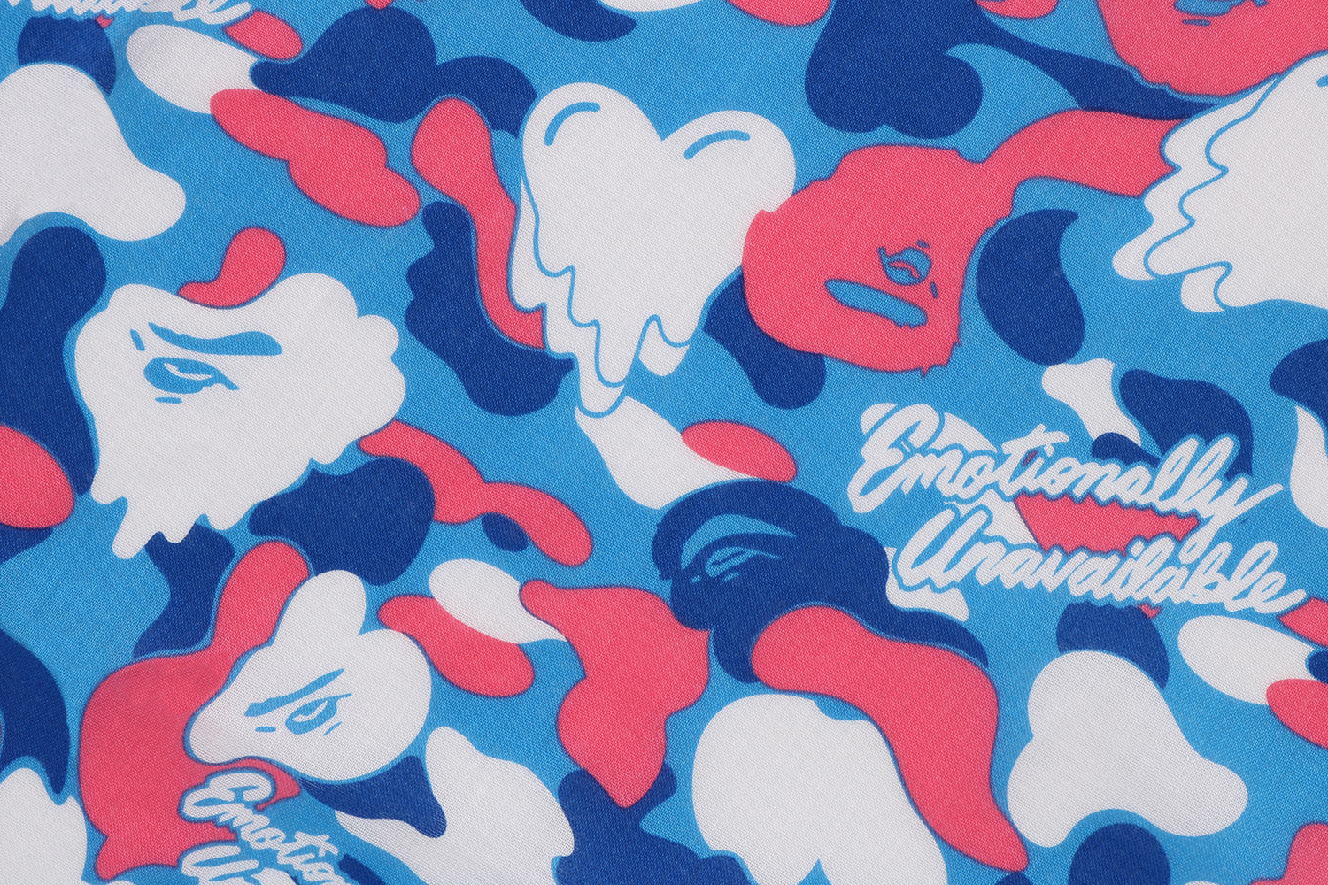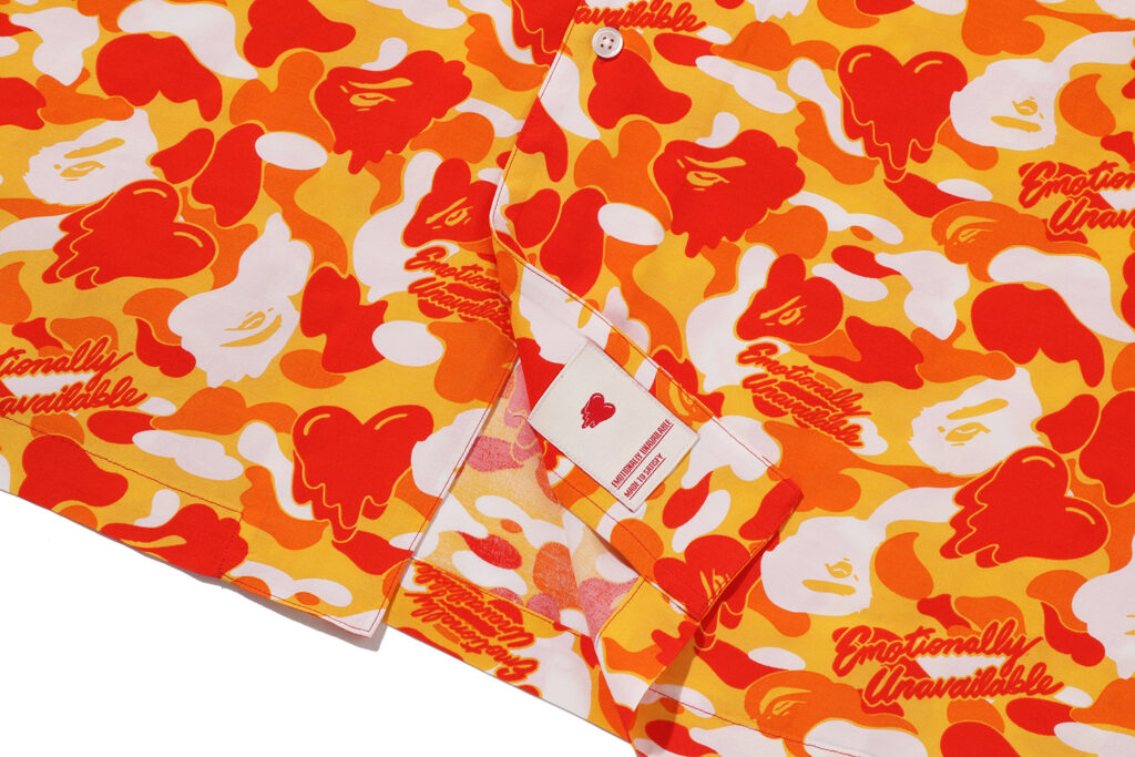 BAPE®︎ CAMO®にEMOTIONALLY UNAVAILABLEのロゴとハートモチーフを組み合わせ、滴る雫のようなグラフィックで再構築したオリジナルカモ柄が特徴的なアロハシャツとアロハショーツ、Tシャツ、バンダナ等を展開する。