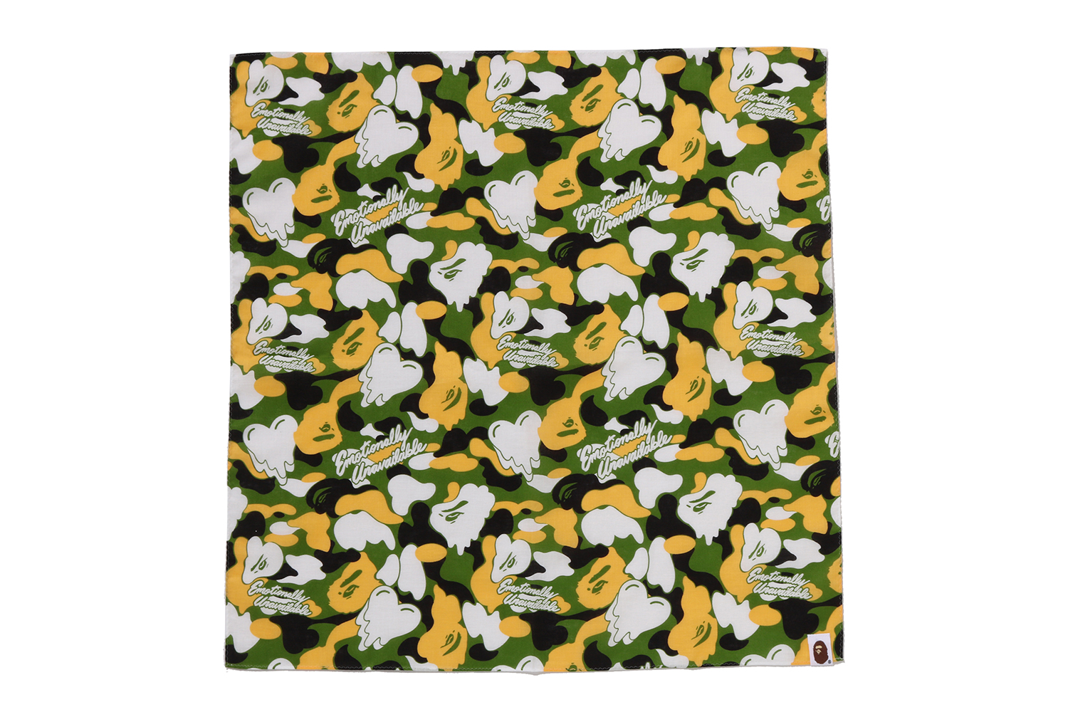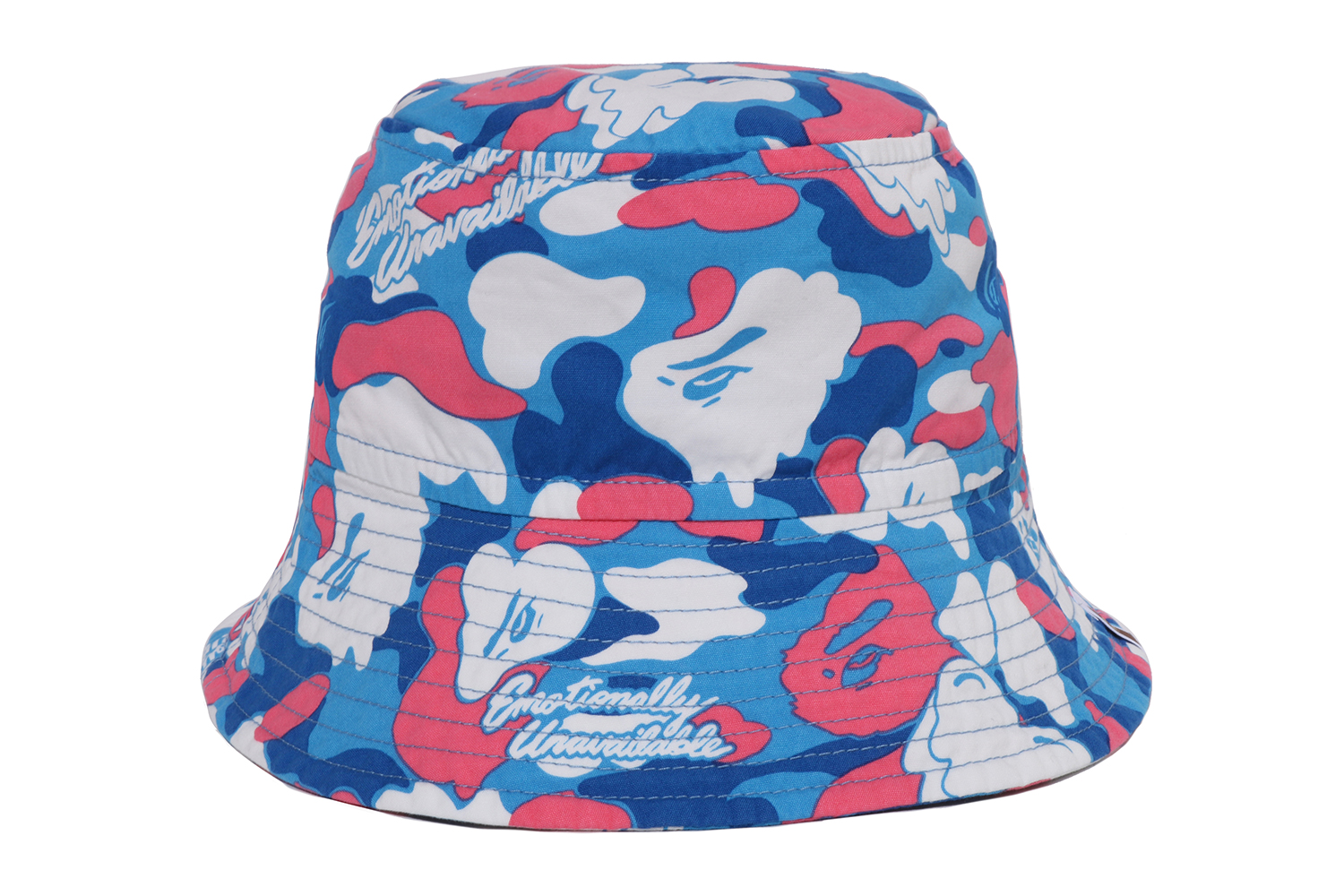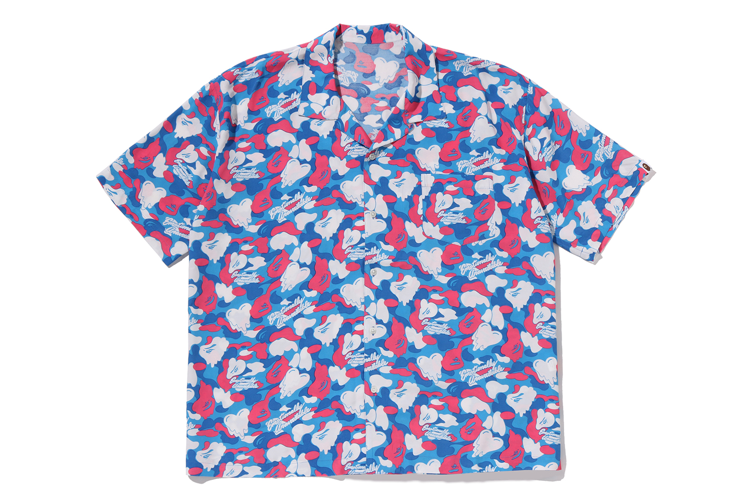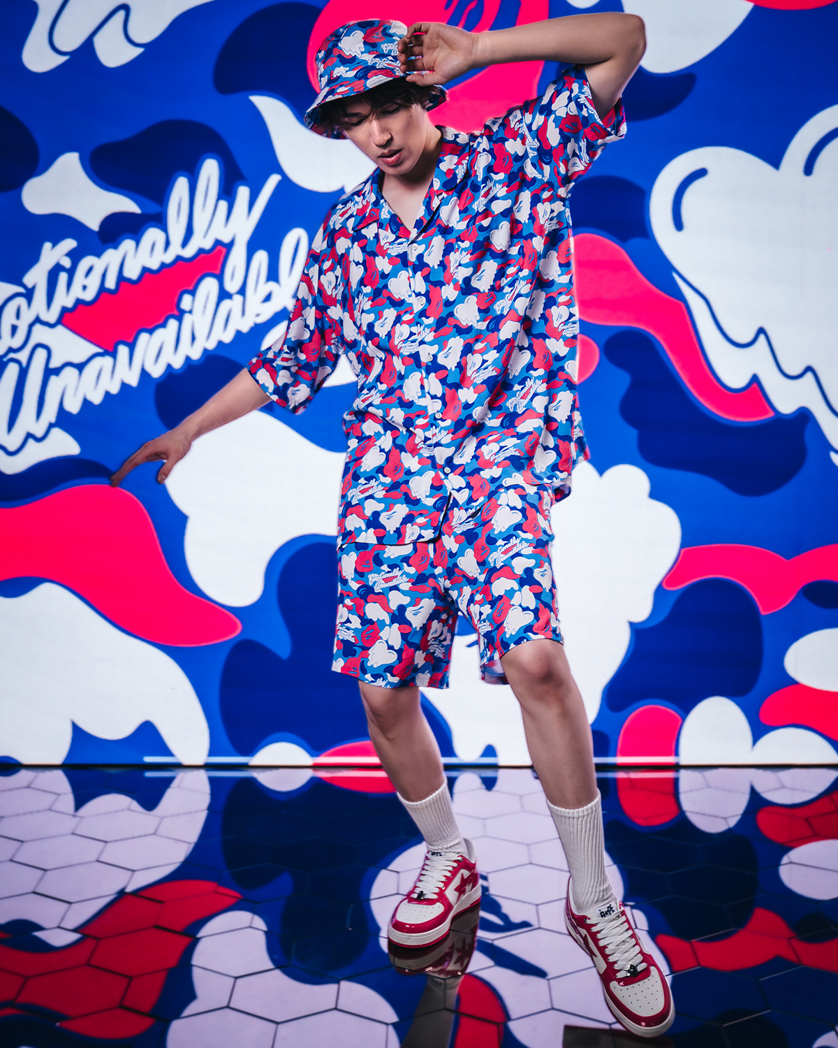 BAPE®︎ CAMO®にEMOTIONALLY UNAVAILABLEのロゴとハートモチーフを組み合わせ、滴る雫のようなグラフィックで再構築したオリジナルカモ柄が特徴的なアロハシャツとアロハショーツ、Tシャツ、バンダナ等を展開する。