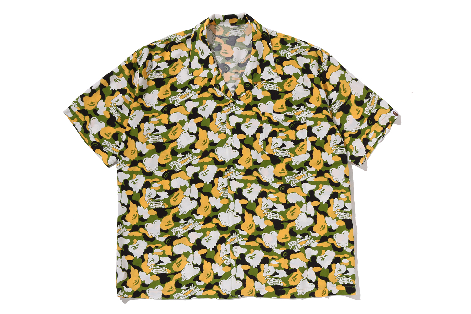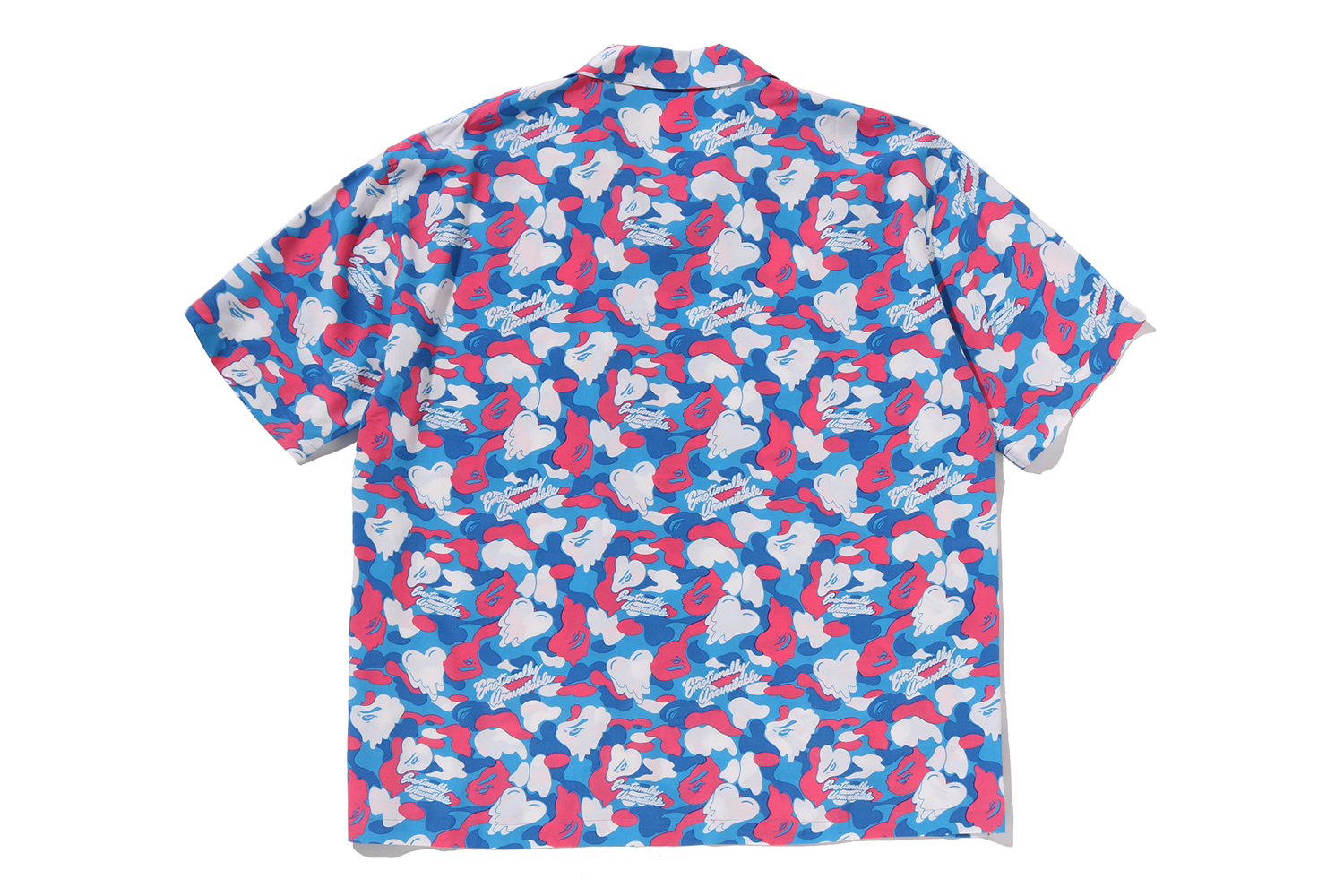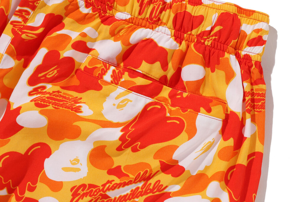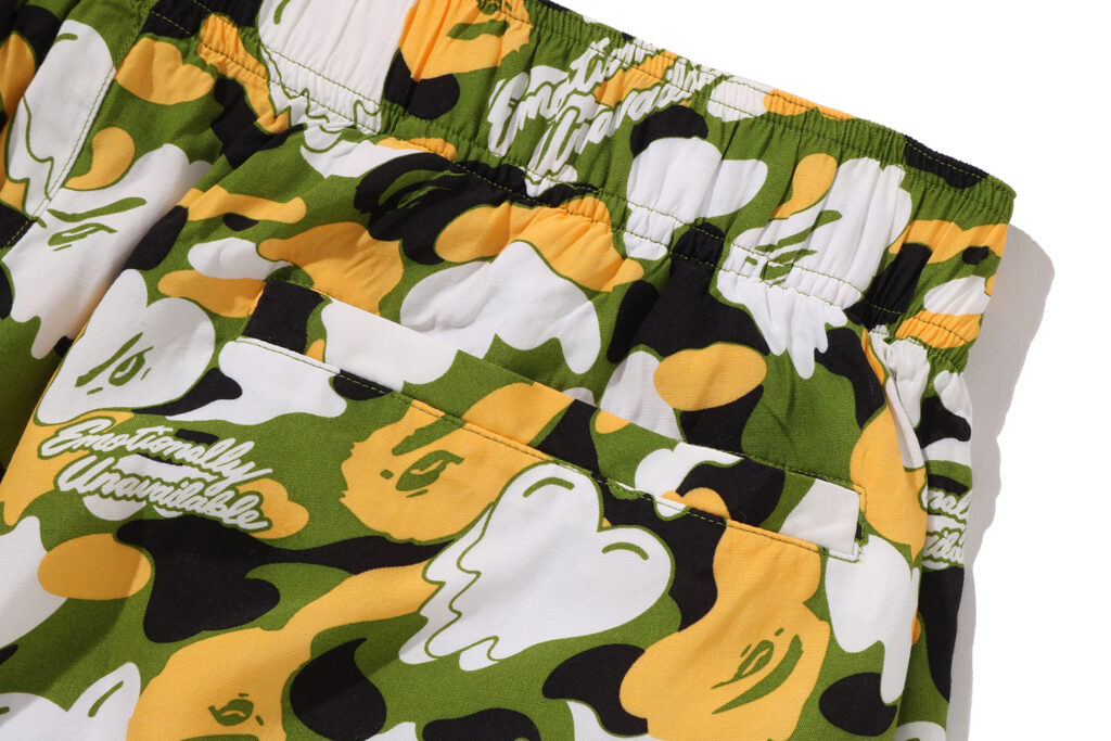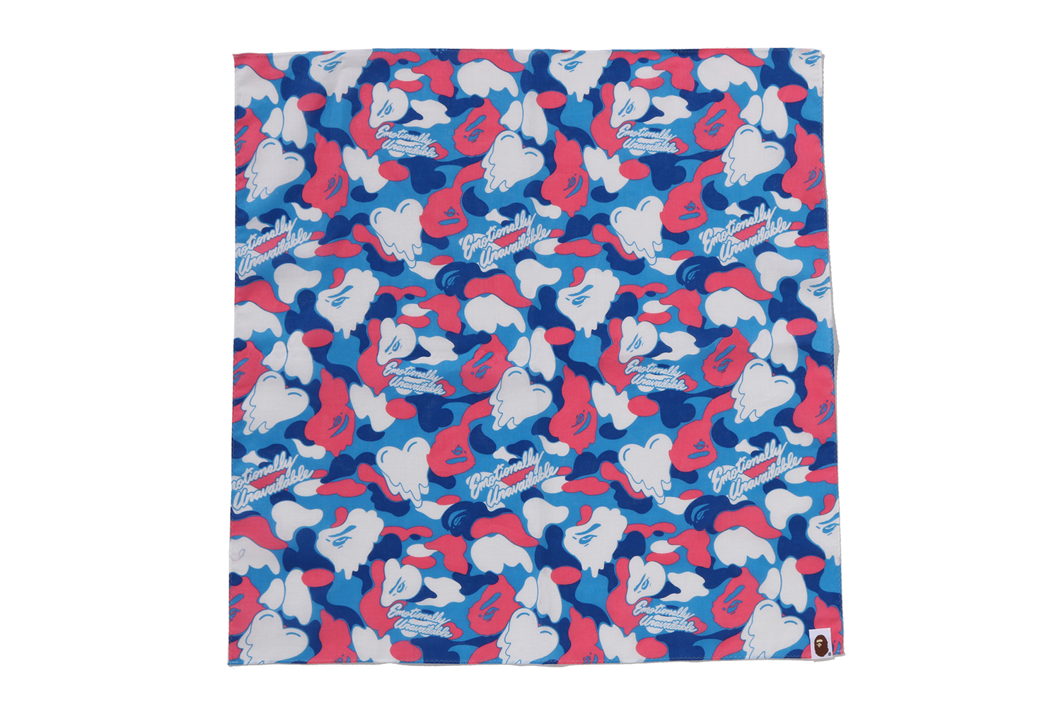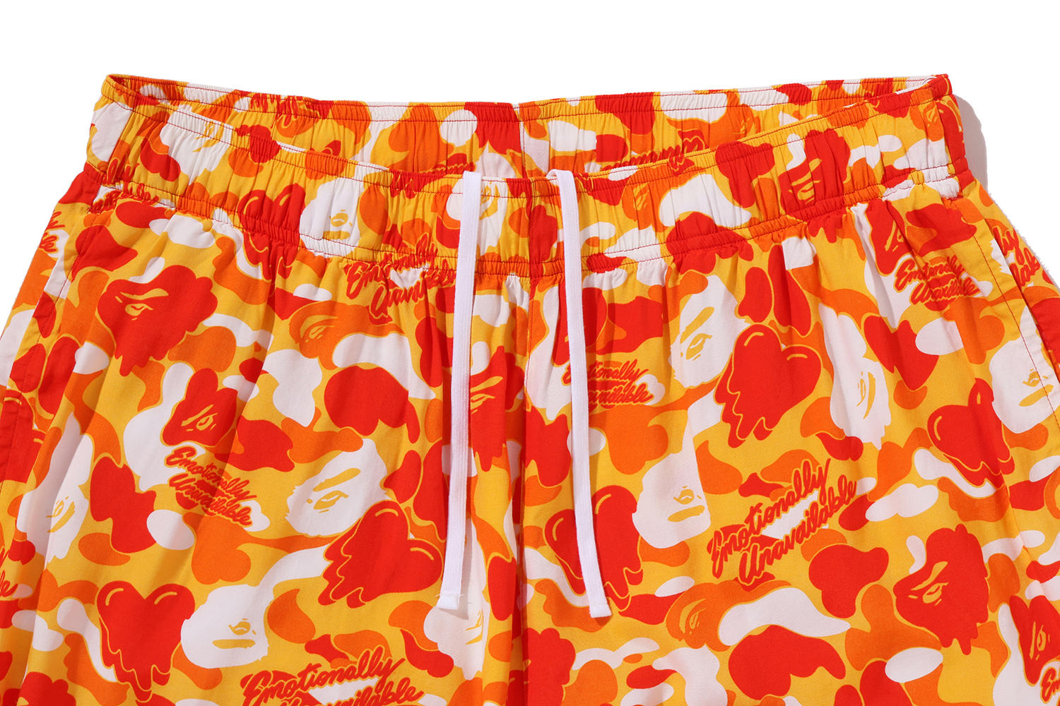 BAPE®︎ CAMO®にEMOTIONALLY UNAVAILABLEのロゴとハートモチーフを組み合わせ、滴る雫のようなグラフィックで再構築したオリジナルカモ柄が特徴的なアロハシャツとアロハショーツ、Tシャツ、バンダナ等を展開する。