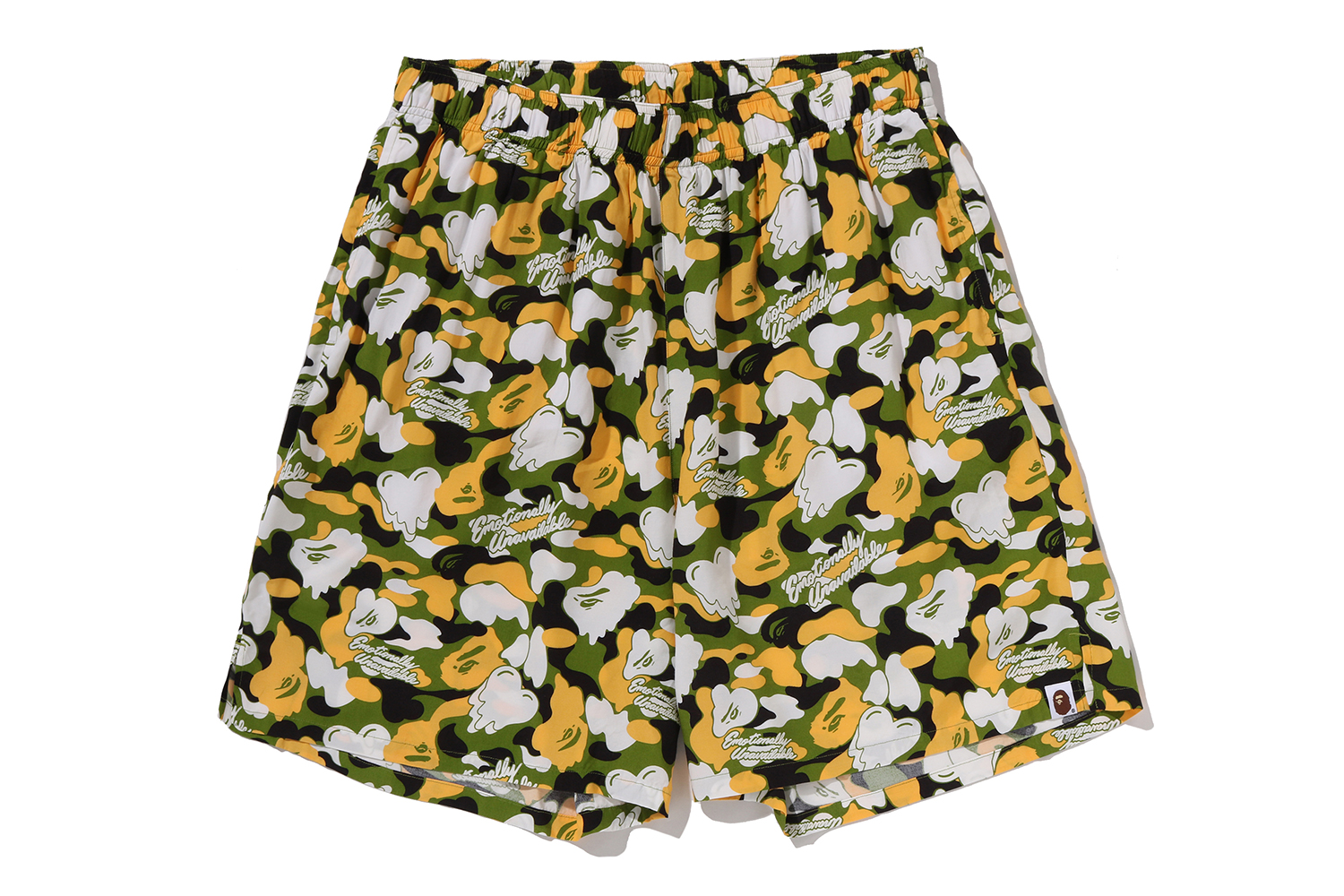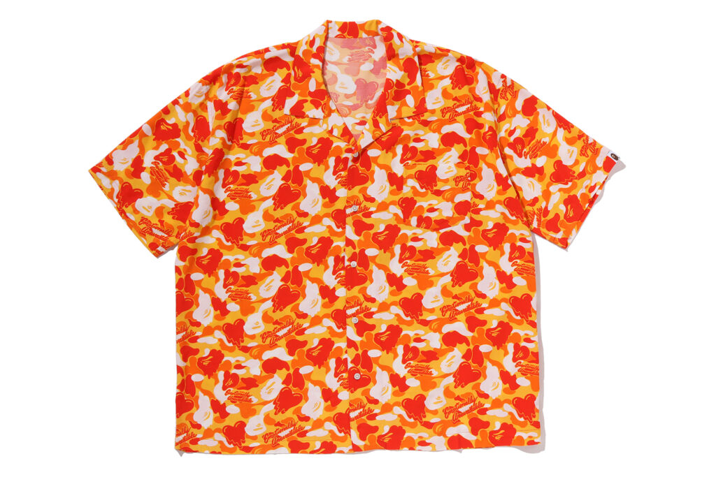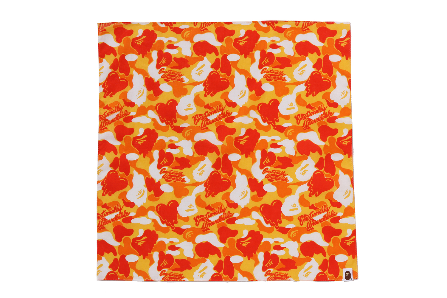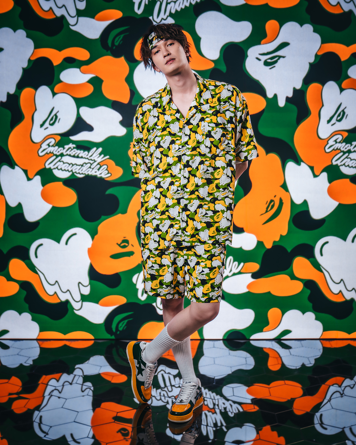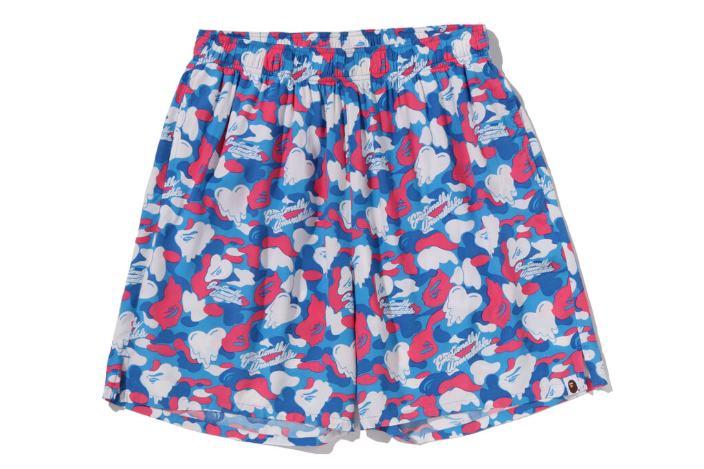BAPE®︎ CAMO®にEMOTIONALLY UNAVAILABLEのロゴとハートモチーフを組み合わせ、滴る雫のようなグラフィックで再構築したオリジナルカモ柄が特徴的なアロハシャツとアロハショーツ、Tシャツ、バンダナ等を展開する。