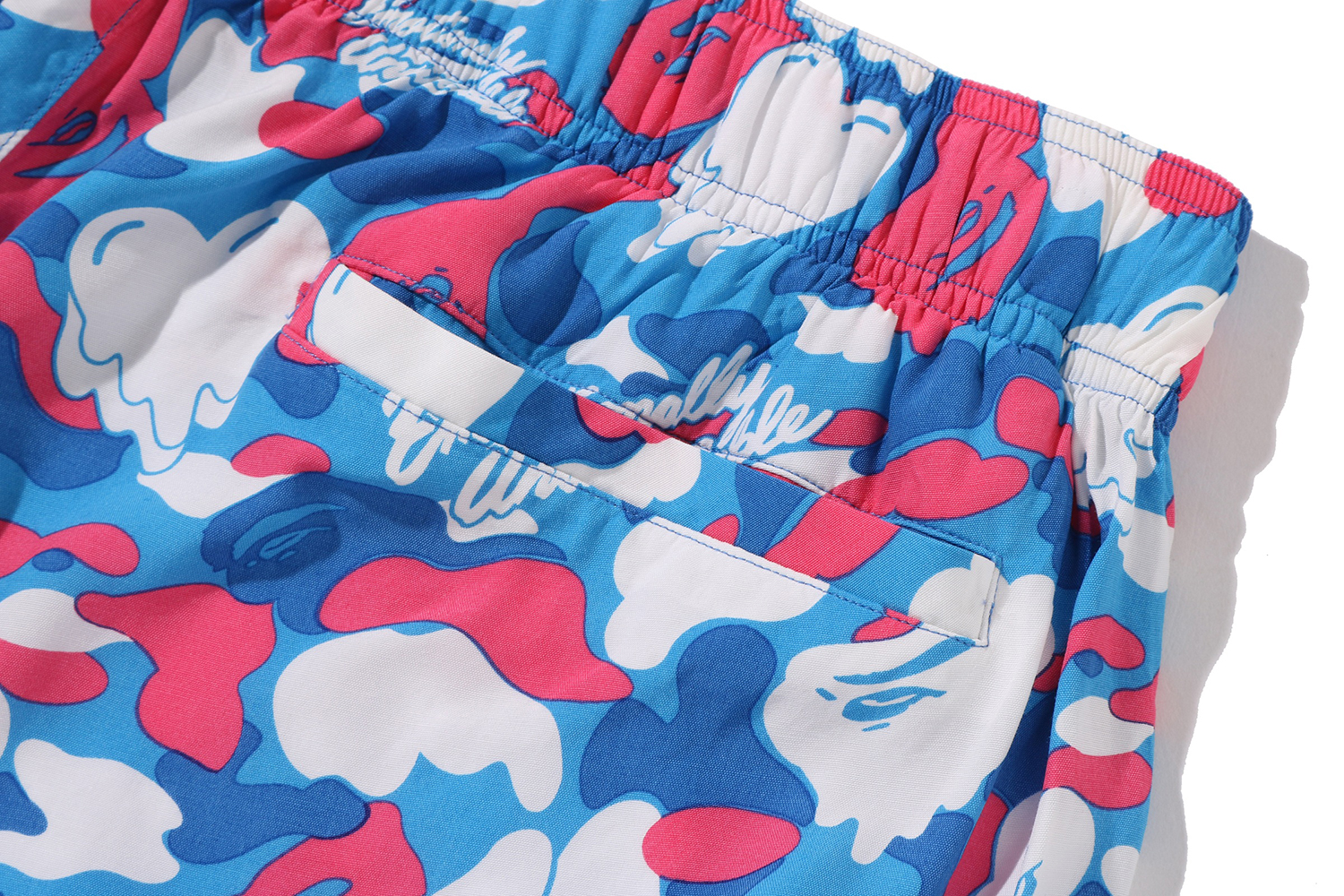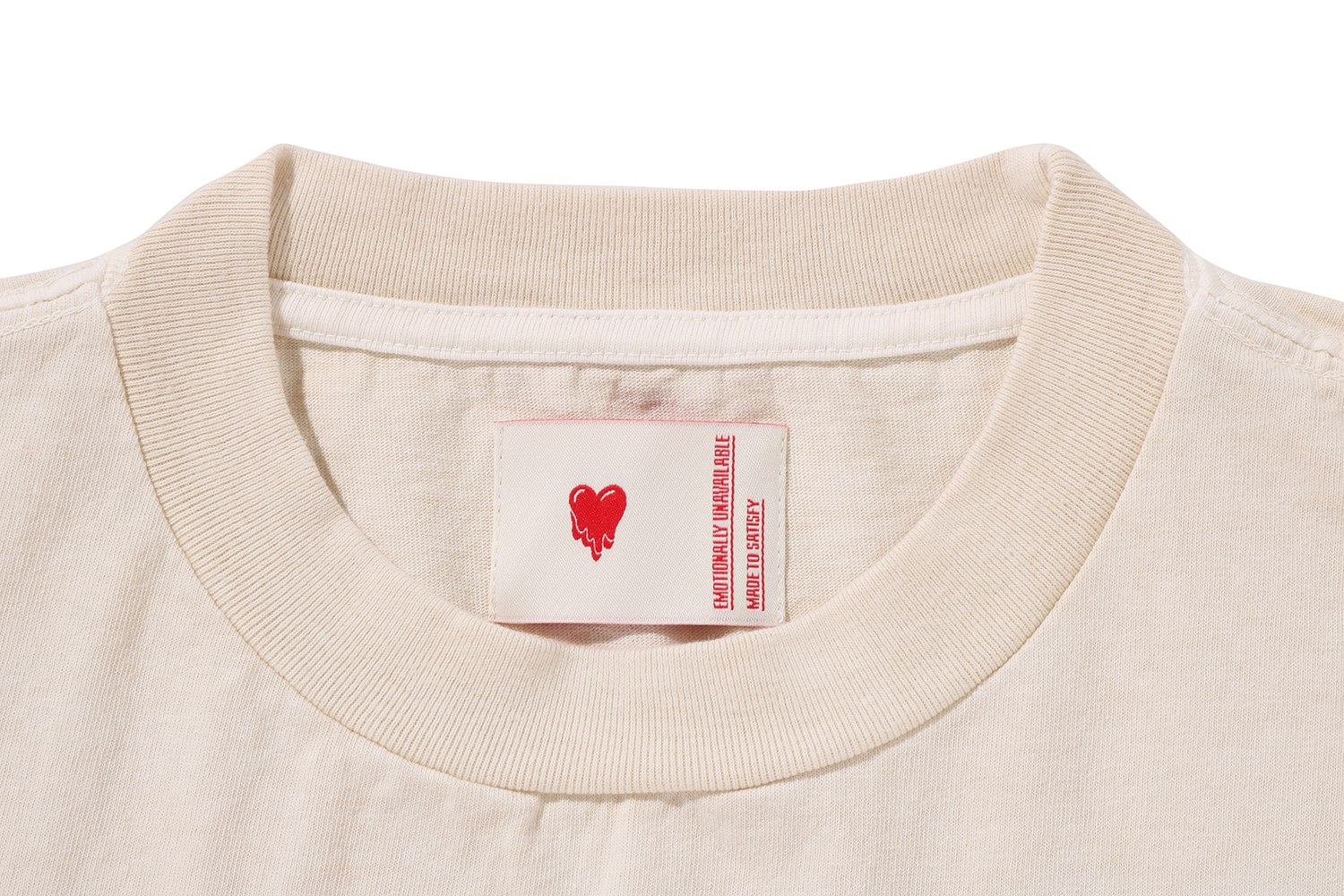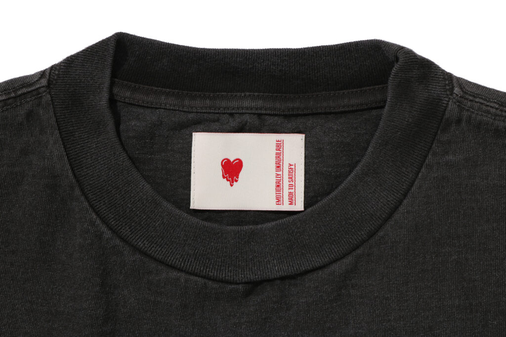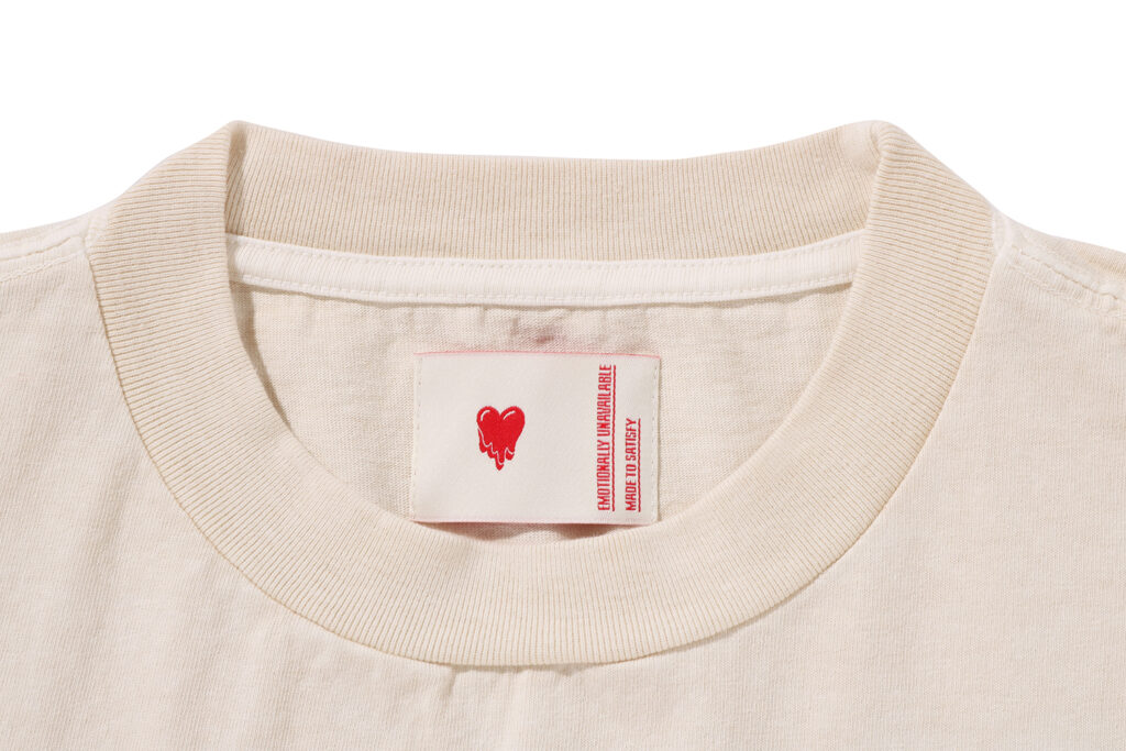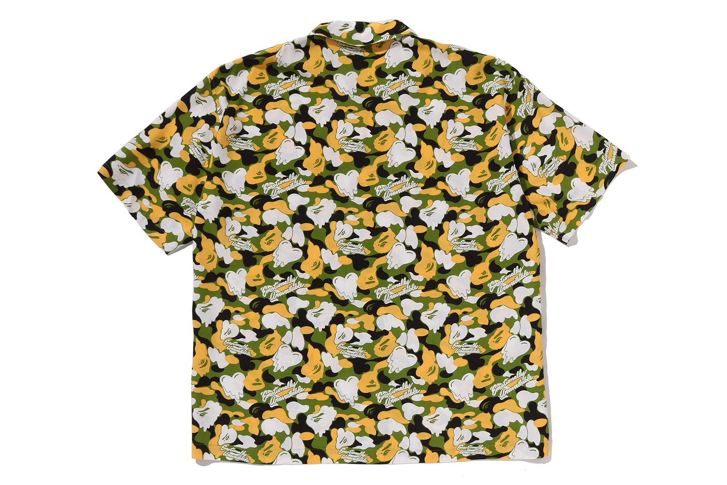 BAPE®︎ CAMO®にEMOTIONALLY UNAVAILABLEのロゴとハートモチーフを組み合わせ、滴る雫のようなグラフィックで再構築したオリジナルカモ柄が特徴的なアロハシャツとアロハショーツ、Tシャツ、バンダナ等を展開する。