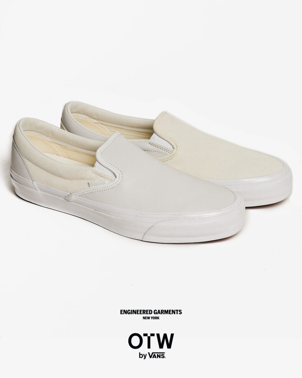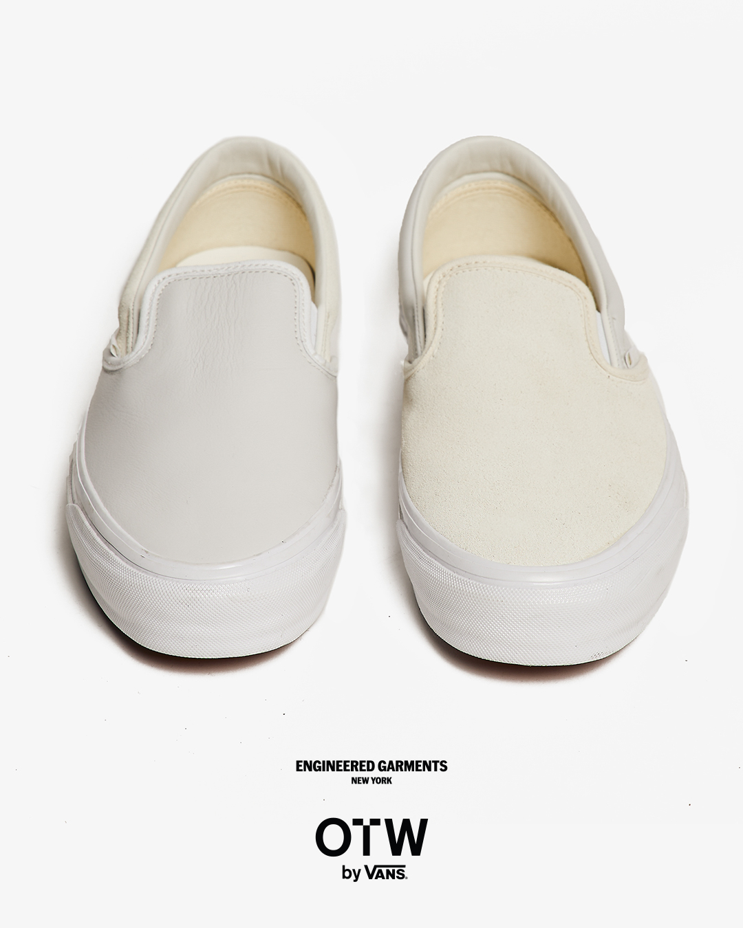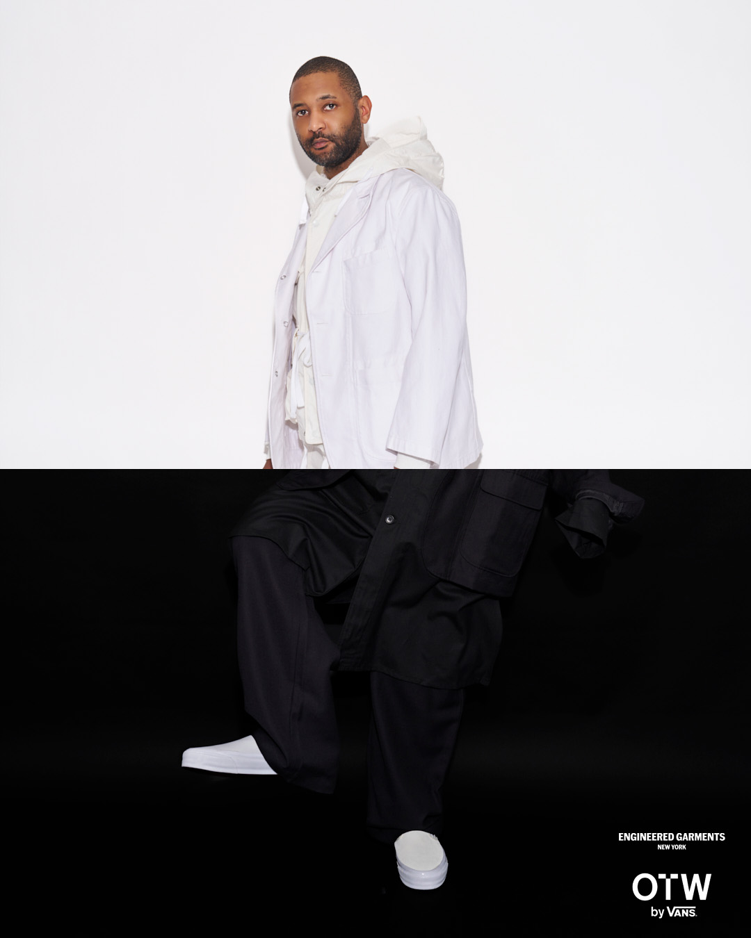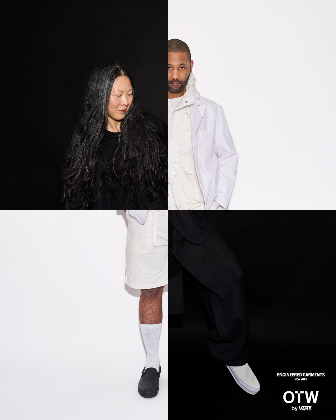 今回は、ブラックとホワイトのカラーに焦点を当て全体の色味を合わせつつ、織りラベルやヒールパッチなどの細部で、さりげないトーンの違いを表現。