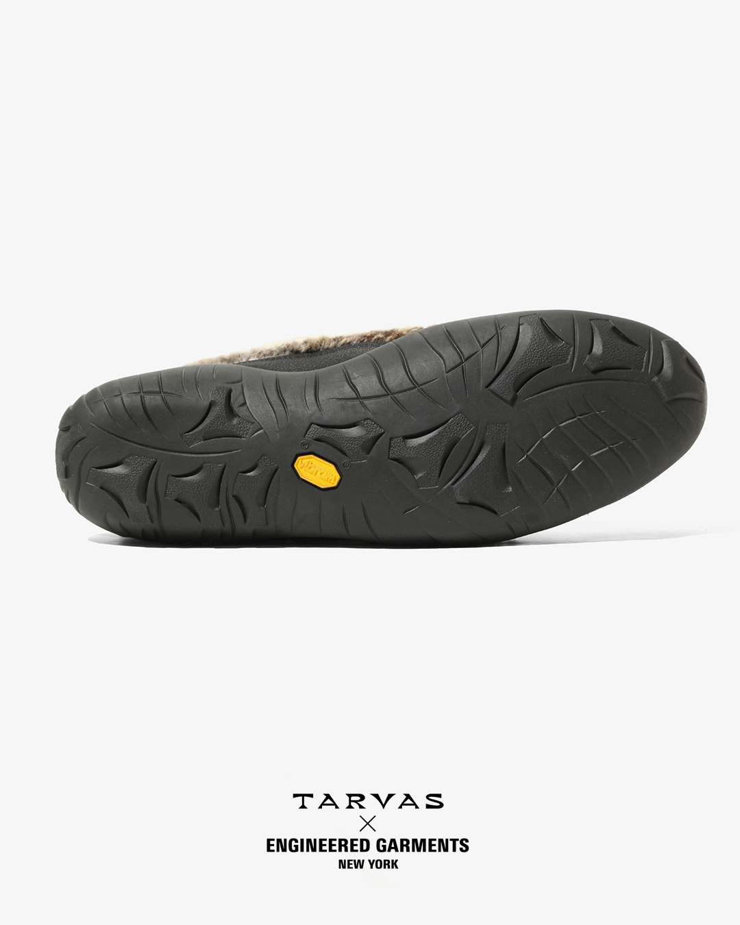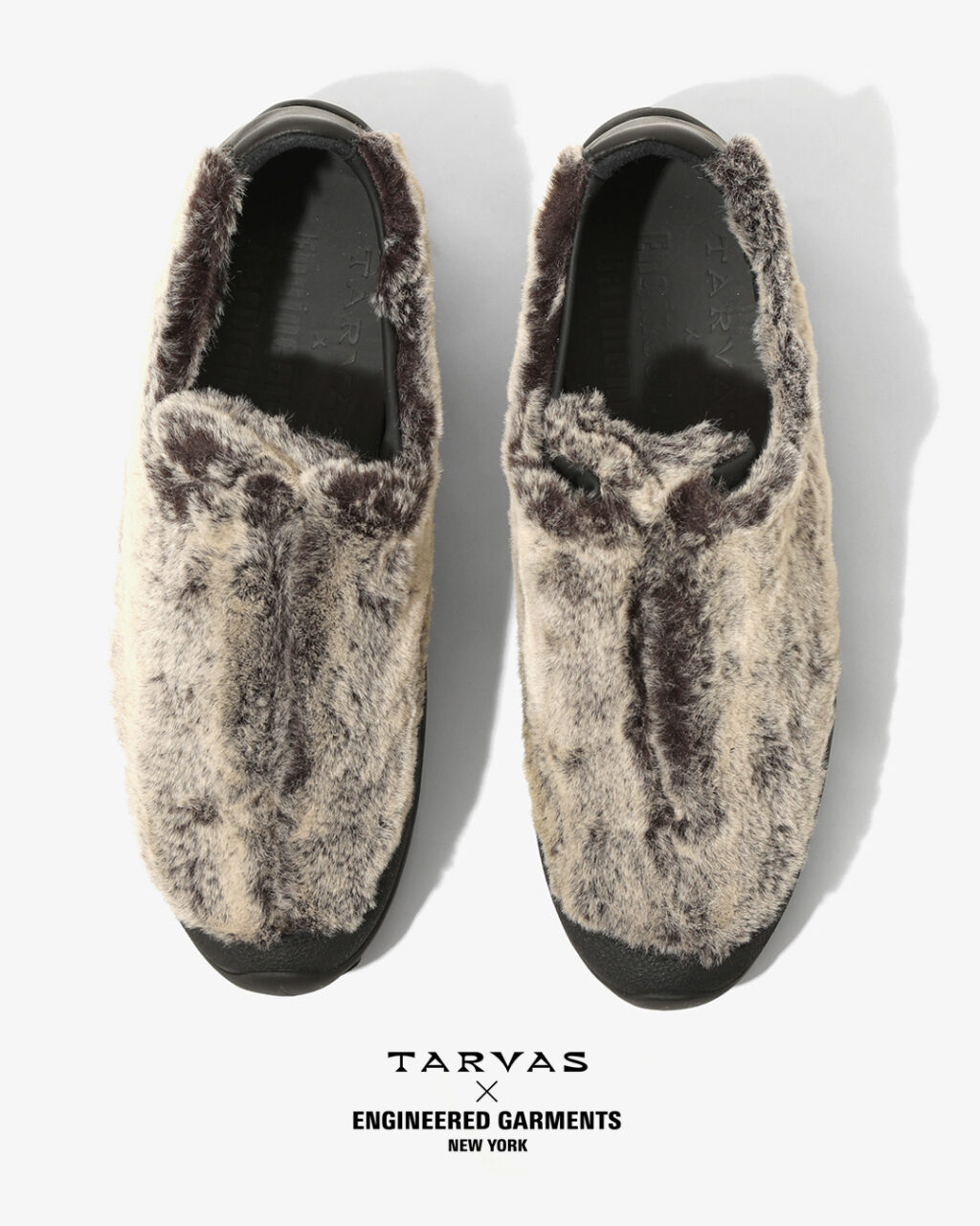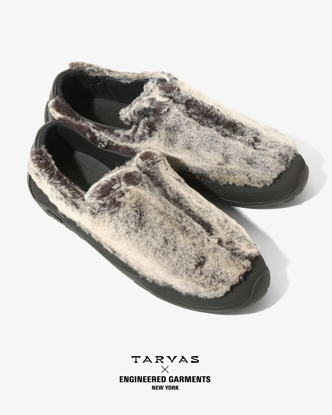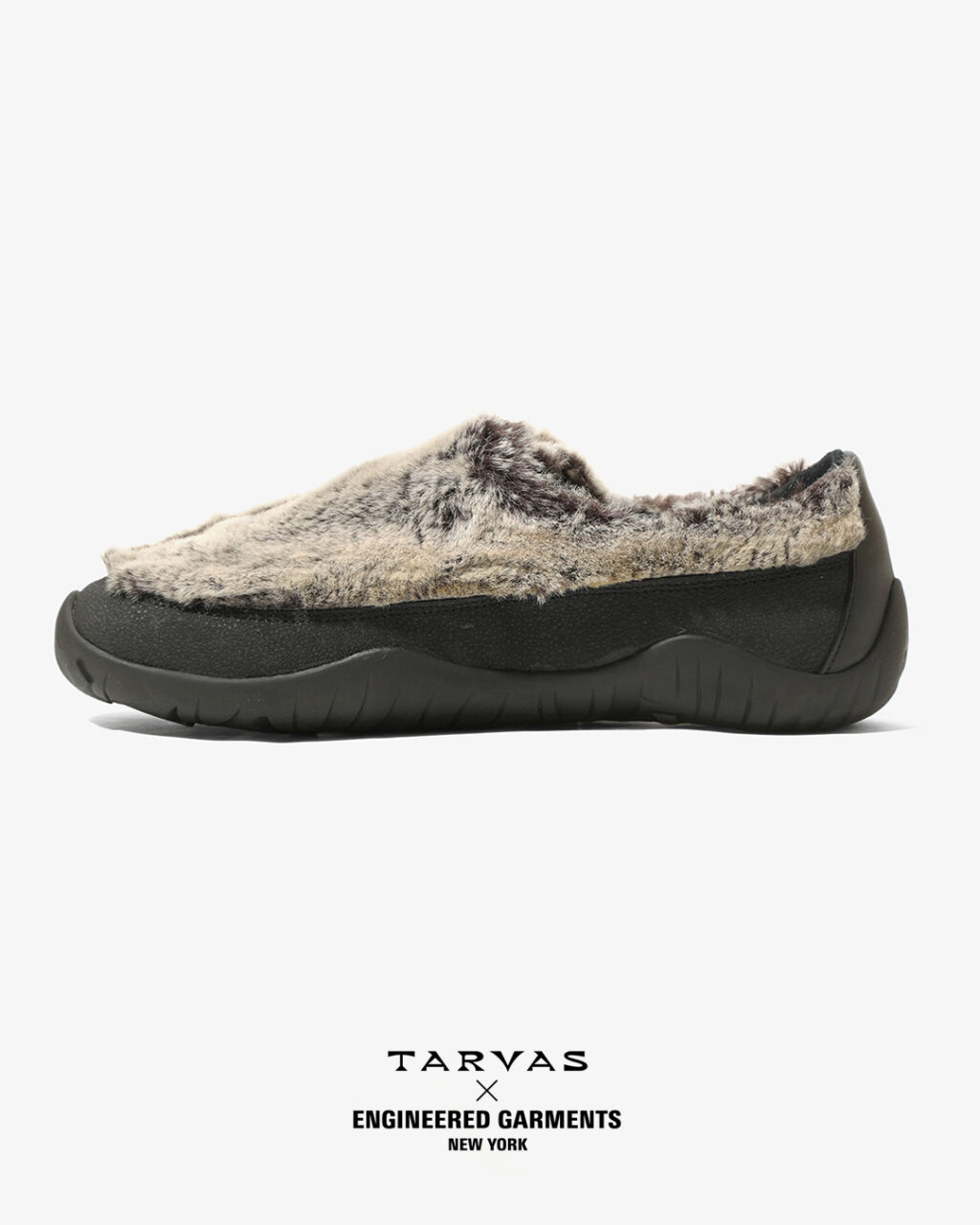 TARVASの『WANDERER』をベースとした今回のコラボレーションでは、アウトドアモックを彷彿とさせるシルエットのアッパーにフェイクファー素材を採用。