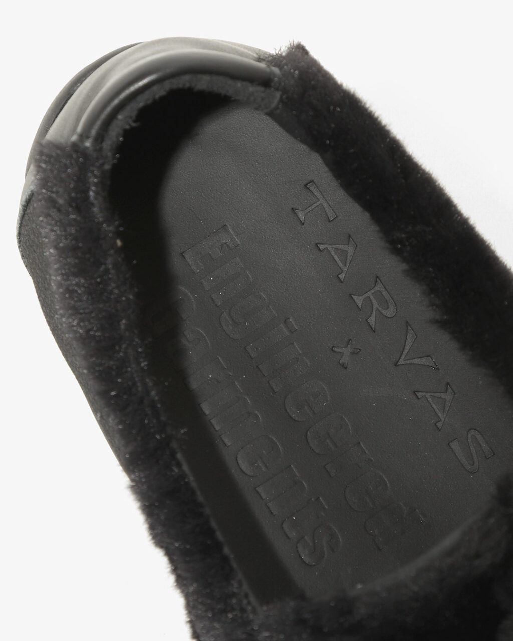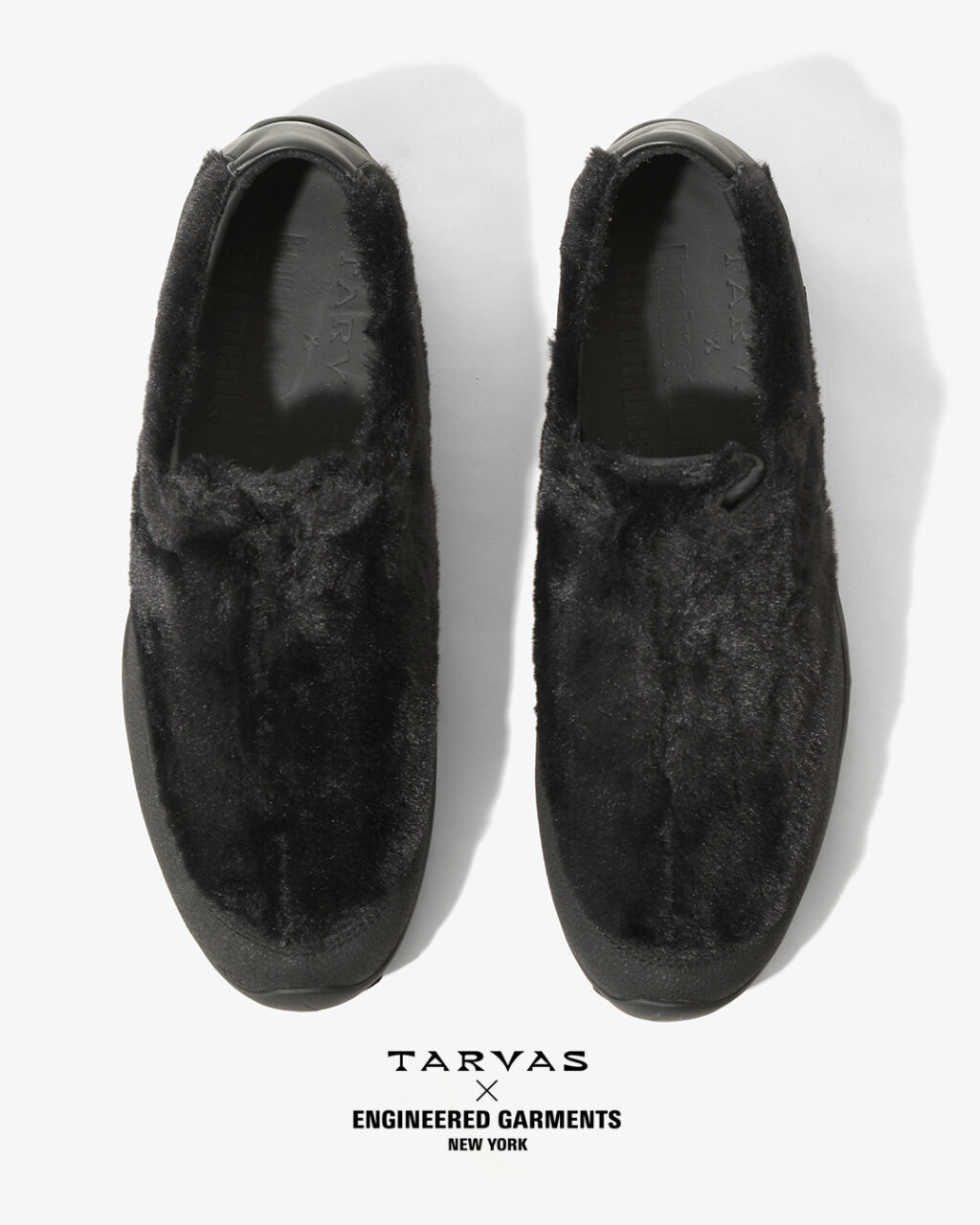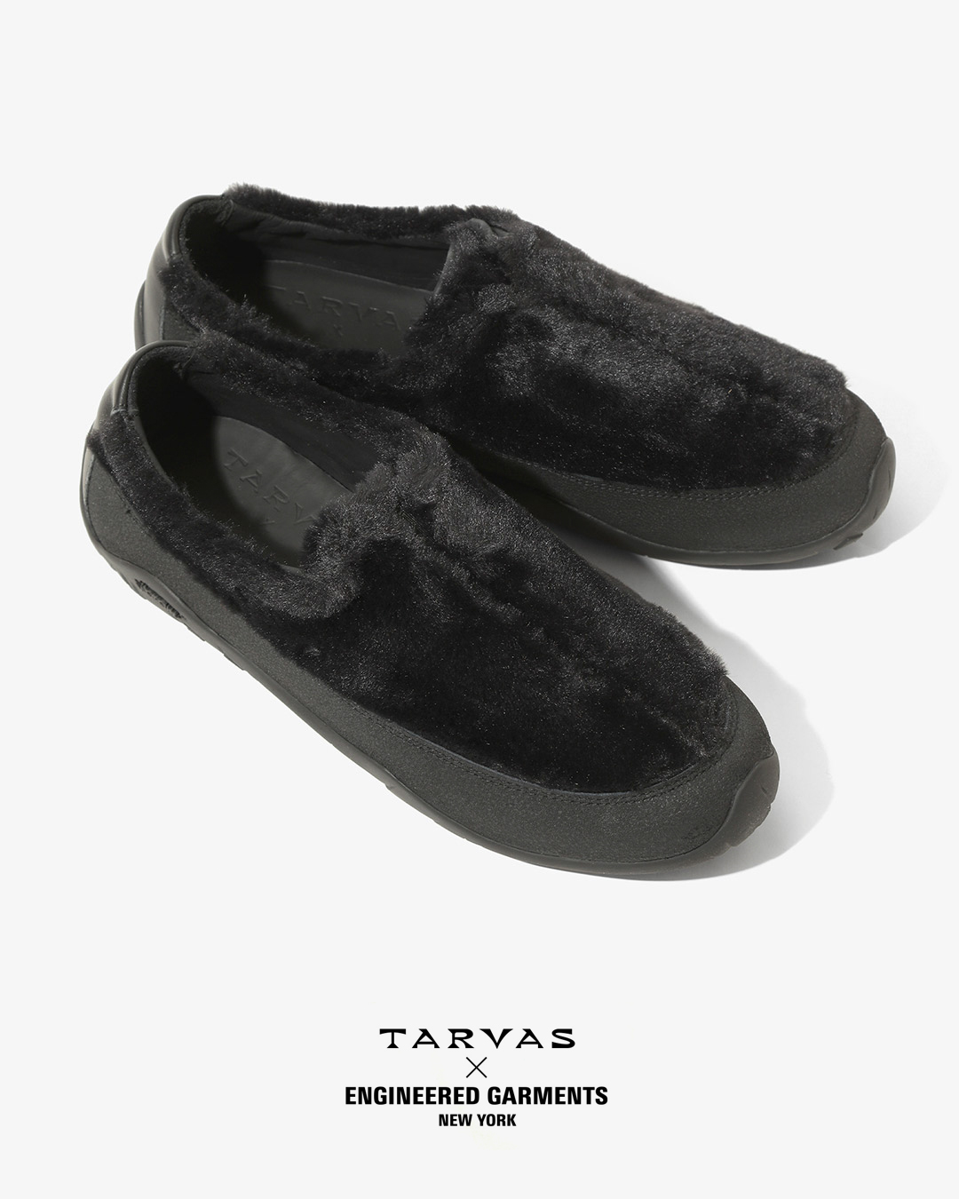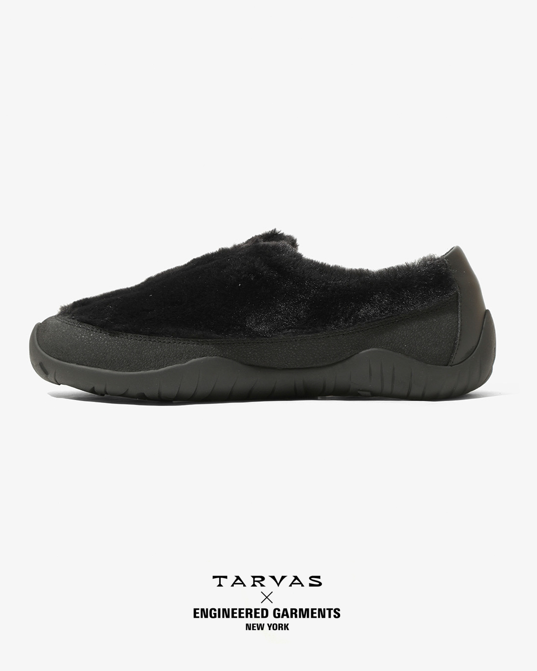 TARVASの『WANDERER』をベースとした今回のコラボレーションでは、アウトドアモックを彷彿とさせるシルエットのアッパーにフェイクファー素材を採用。