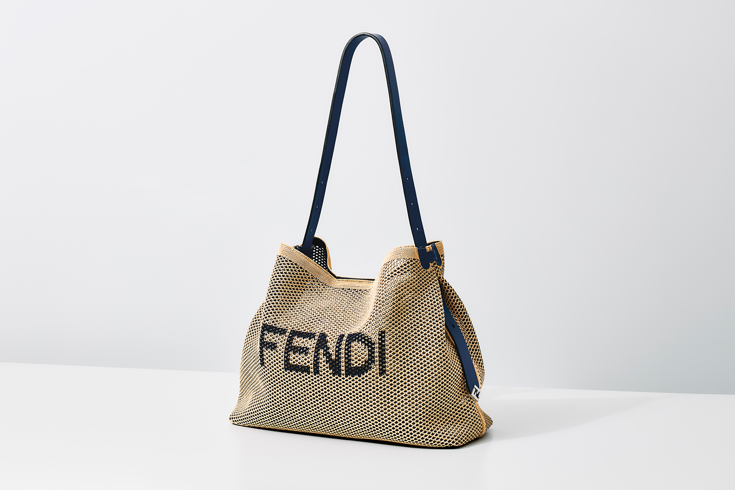 まるでラフィアのような繊細な表情を醸し出し、そこにダークブルーのFENDIロゴが大胆かつ洗練されたコントラストを描き出す。