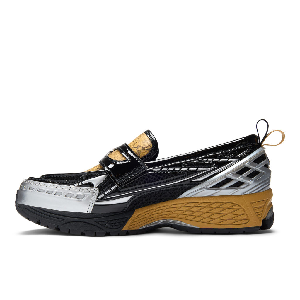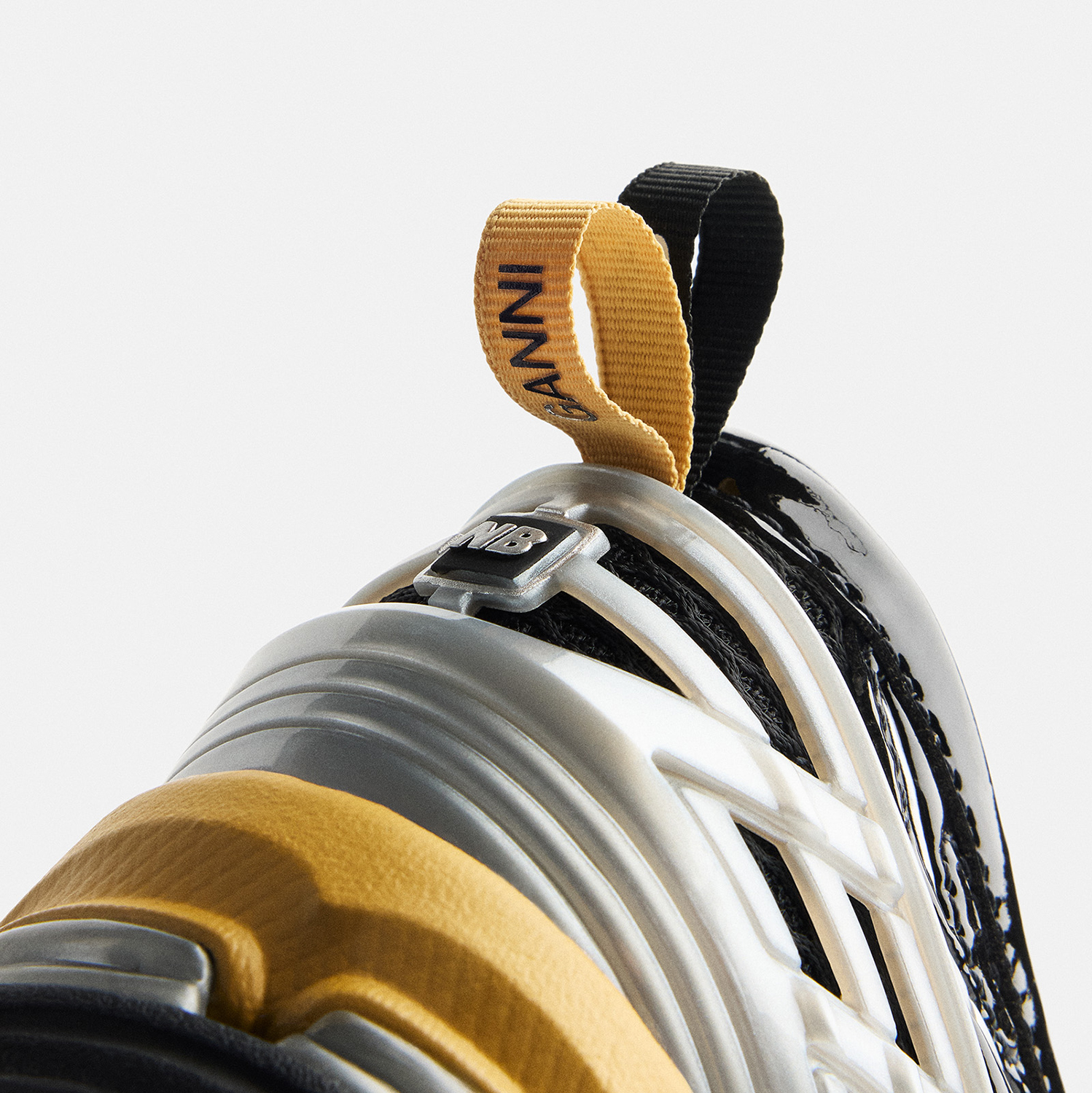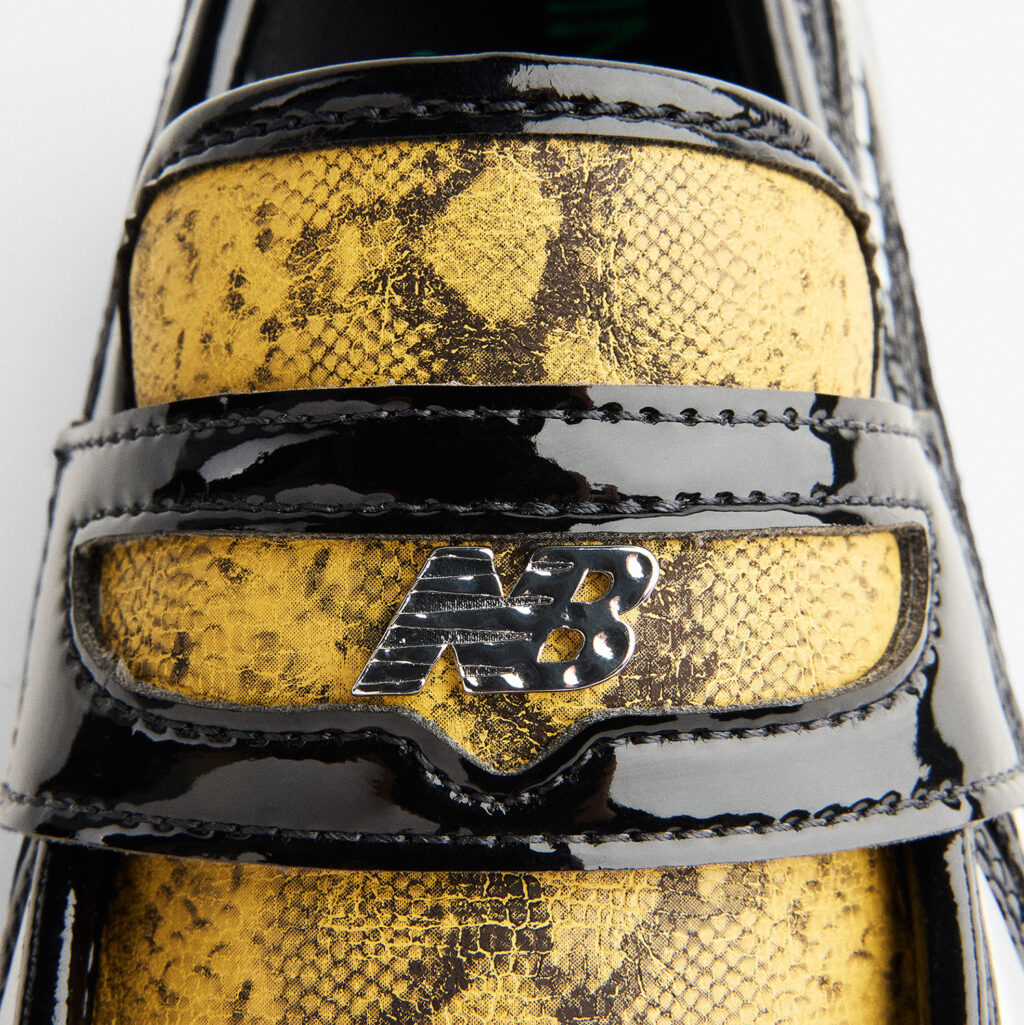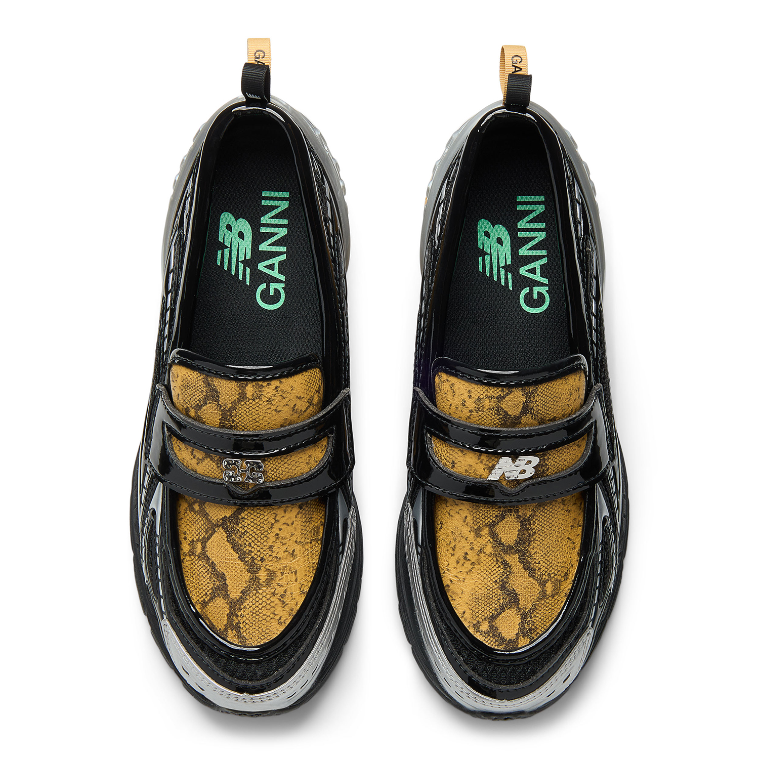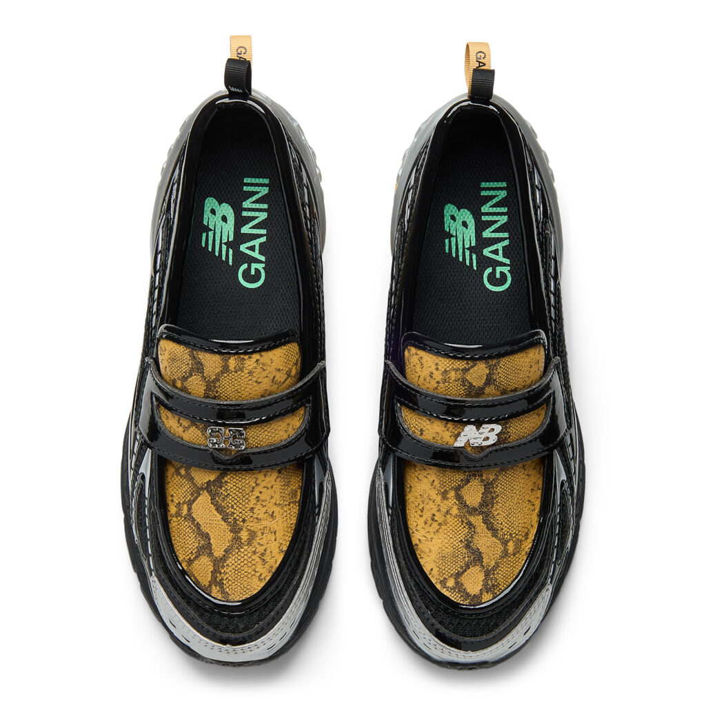 GANNIらしいスネークプリントや鮮やかなカラーパレット、クラシックなローファーストラップを再解釈したメタル製のGANNIのバタフライロゴとNew Balanceのロゴがポイントとなっている。