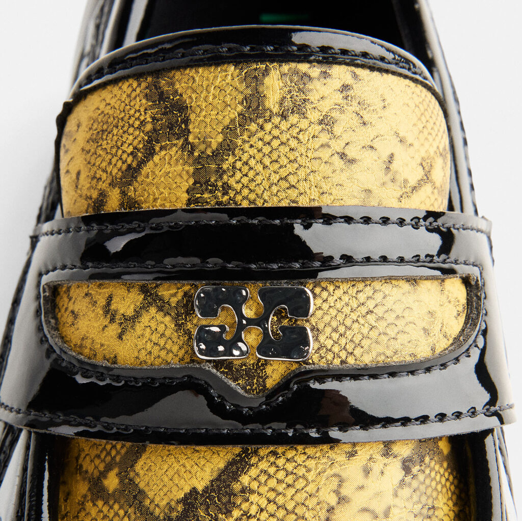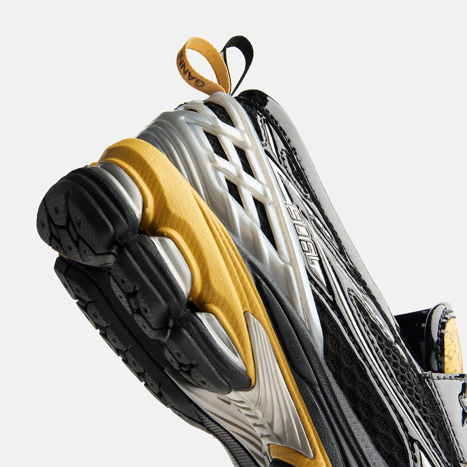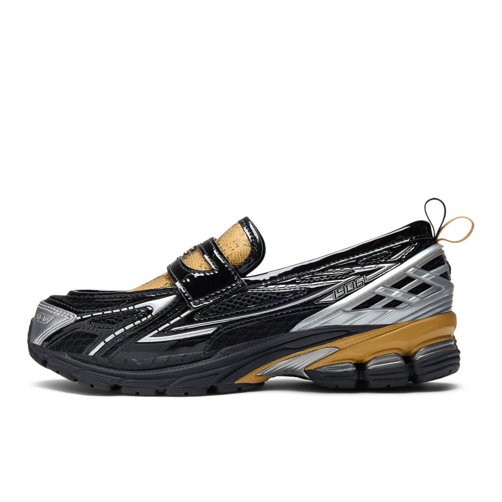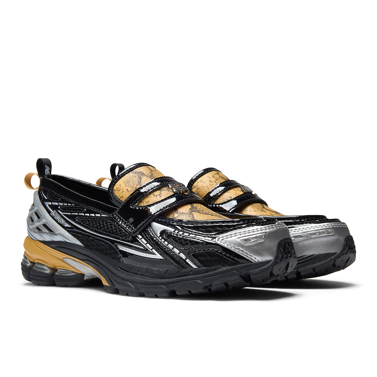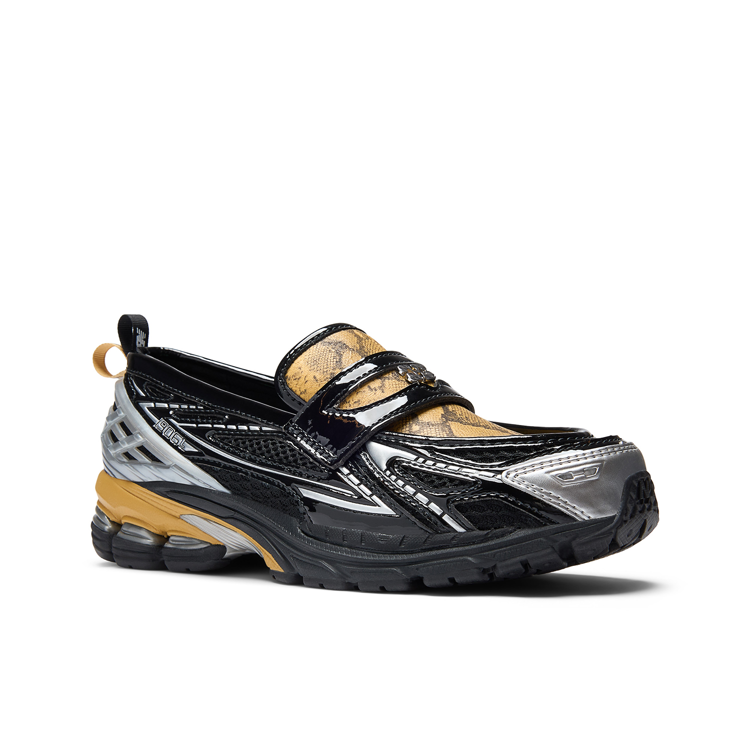 GANNIらしいスネークプリントや鮮やかなカラーパレット、クラシックなローファーストラップを再解釈したメタル製のGANNIのバタフライロゴとNew Balanceのロゴがポイントとなっている。