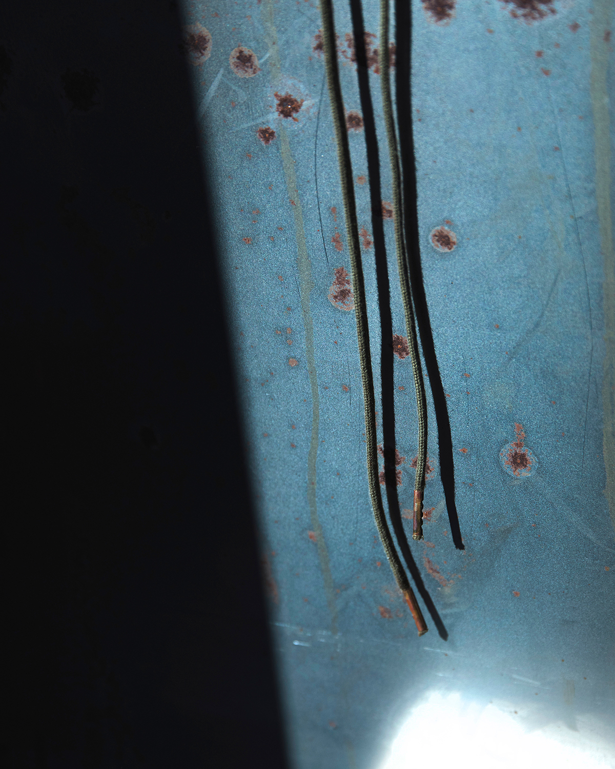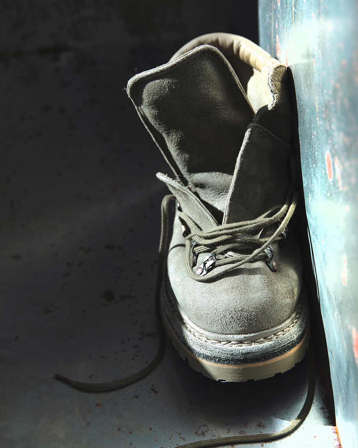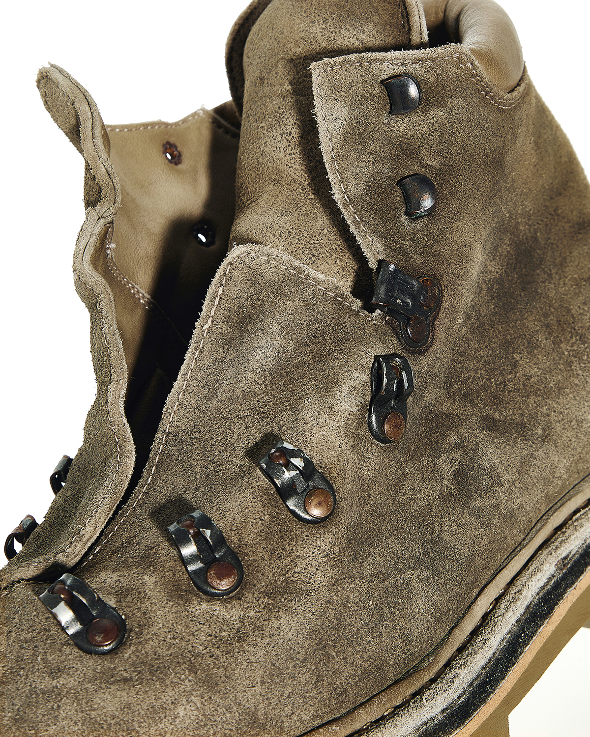 エイジング加工が施されたメタルアイレットとフックに、細幅のコットンレースを組み合わせ、足首に巻きつけての着用を想定して、シューレースは長めに設定されている。