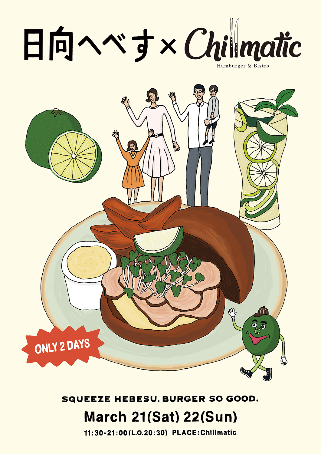 3月21日(土)、22日(日)の2日間限定で開催される本イベントでは、Chillmatic – Hamburger & Bistroの看板メニューであるチルマティックバーガーとへべすを組み合わせた日向へべすバーガーのほか、へべすスカッシュ、へべすミントハイボール、へべすタルタルソースという4種の限定メニューを提供。